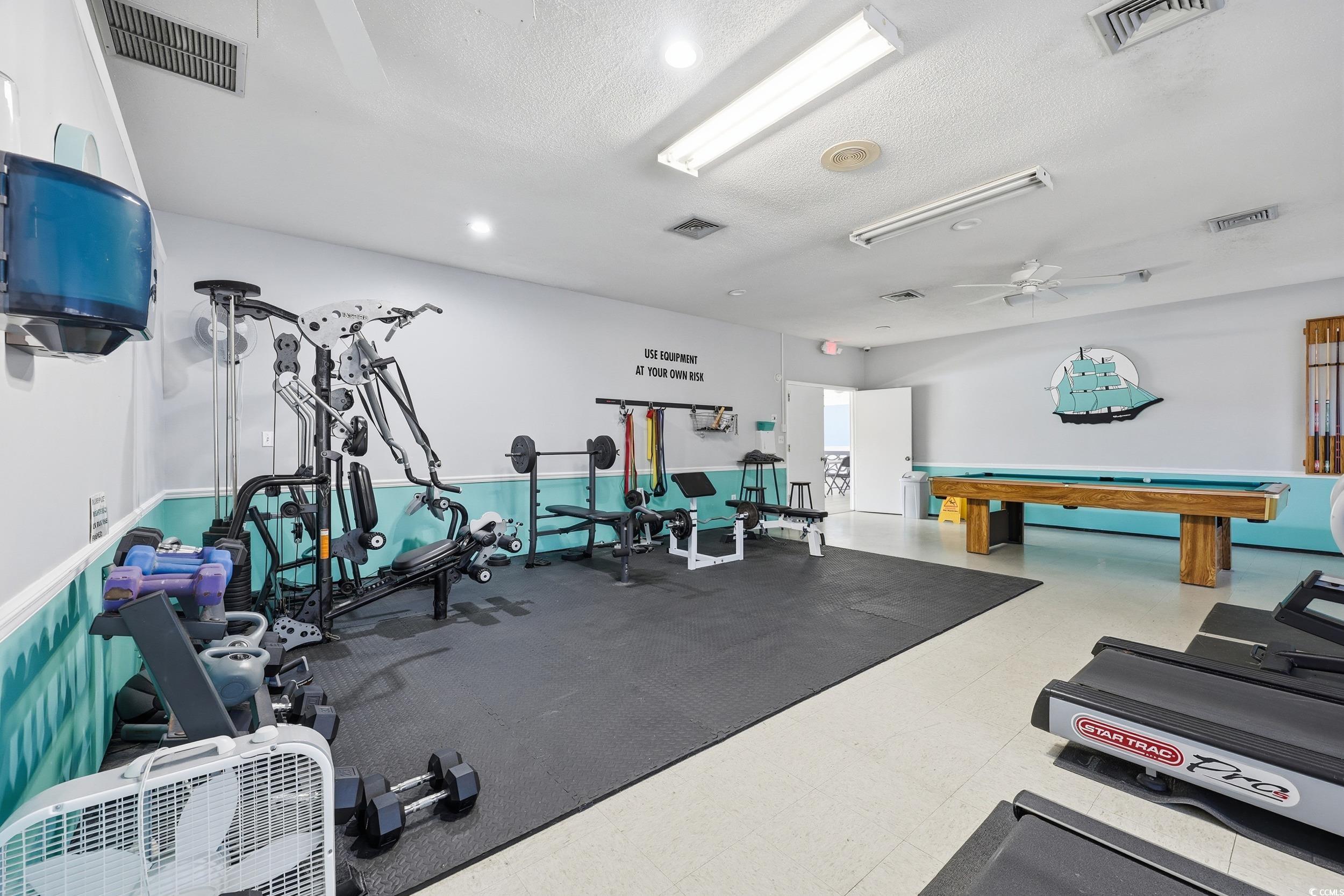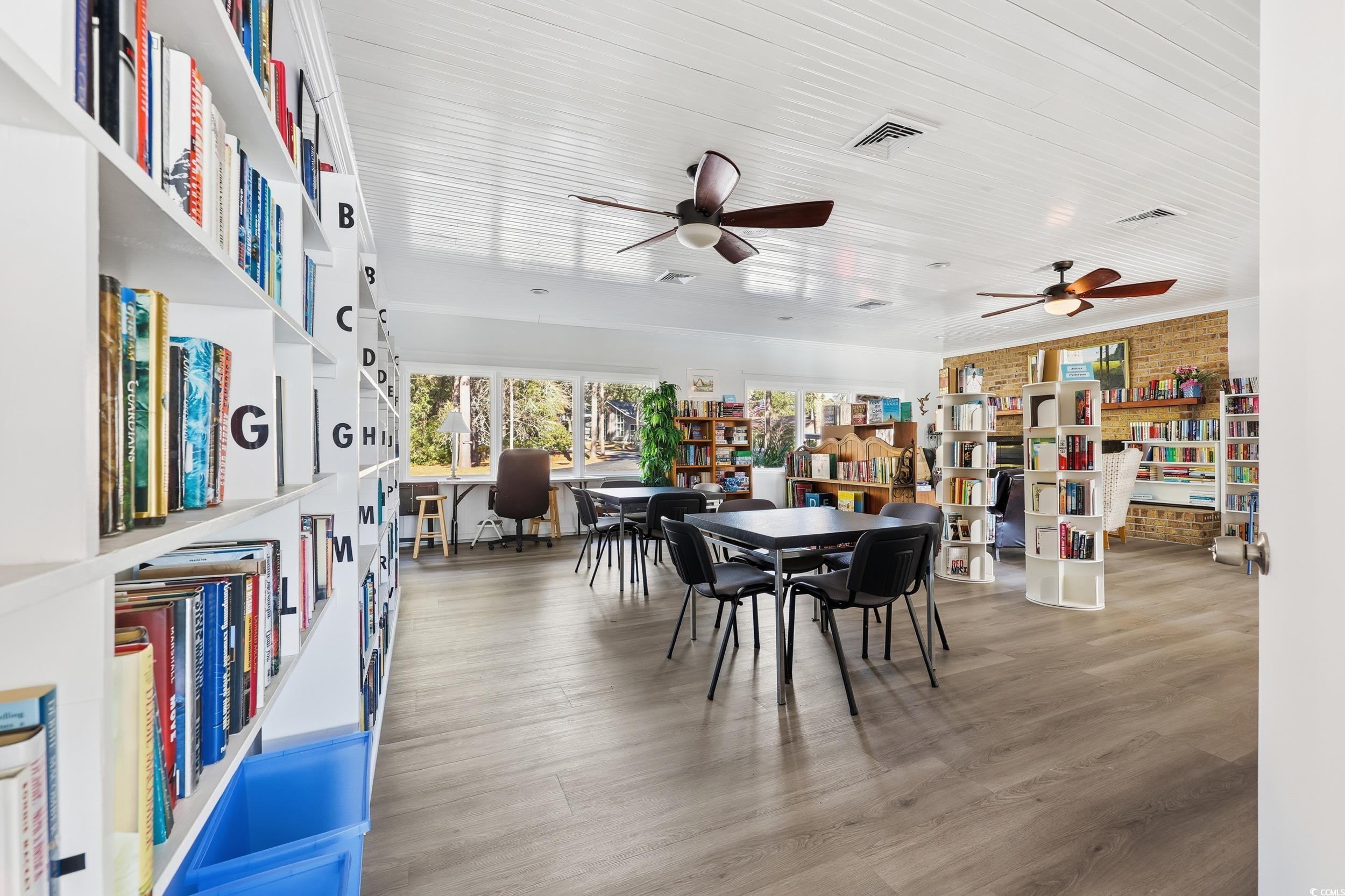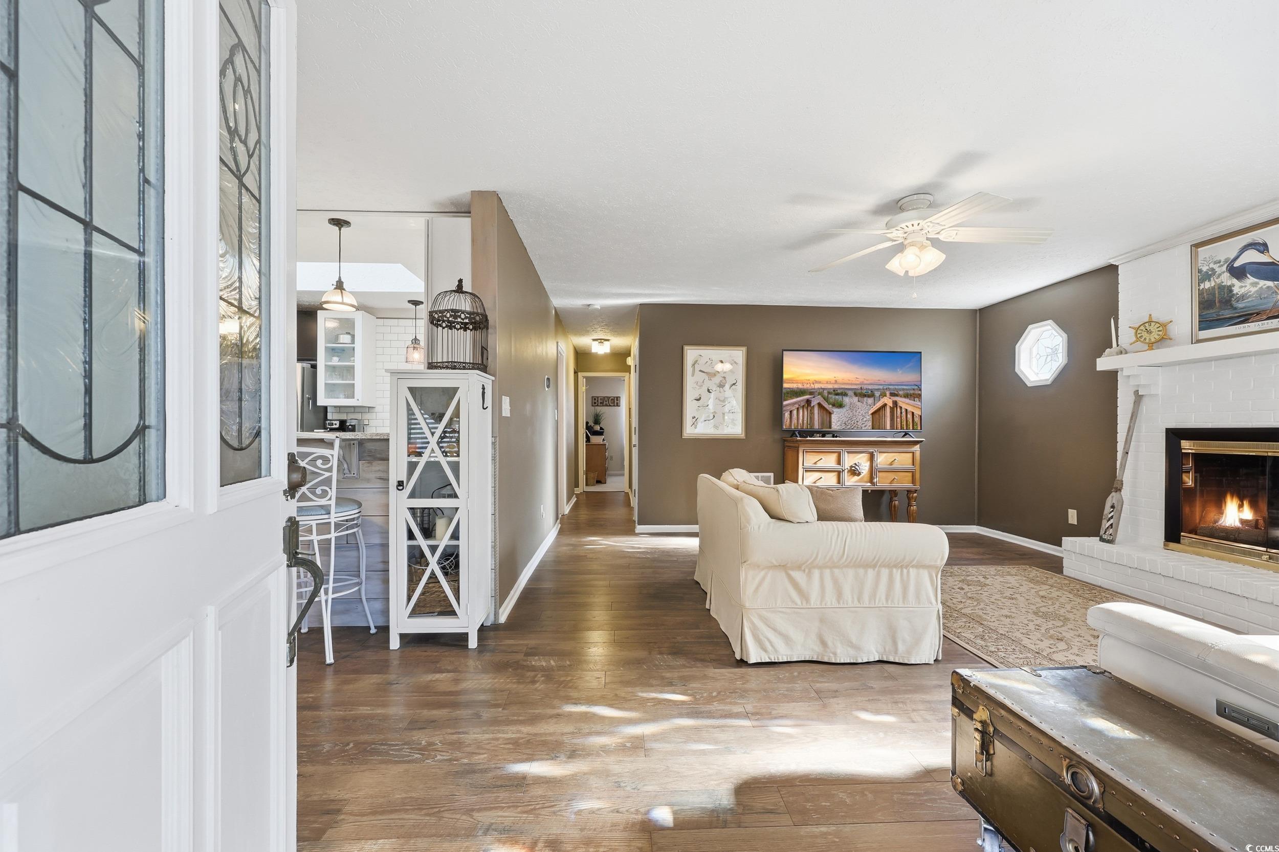 Welcome to Windjammer Village, a gated community in Little River. 2219 Swamp Fox Circle features two comfortable living spaces, one with a cozy fireplace and the other filled with natural light from a wall of windows. The eat-in kitchen offers a farmhouse sink, white cabinetry, quartz countertops, stainless steel appliances, and tile flooring. The home includes three bedrooms, two baths, a double garage with additional workspace, and an outdoor storage shed. Enjoy relaxing mornings on the screened-in front porch, along with hurricane shutters and a well for outdoor maintenance. Community amenities include two pools (one kiddie pool), playground, basketball court, tennis courts, gym, game room, library, and a large meeting space. For boating enthusiasts, HOA-included RV and boat parking, a community boat dock, and direct access to the Intracoastal Waterway make ocean outings easy. Conveniently located near restaurants, parks, and golf courses, this home is just five minutes from Calabash, NC.