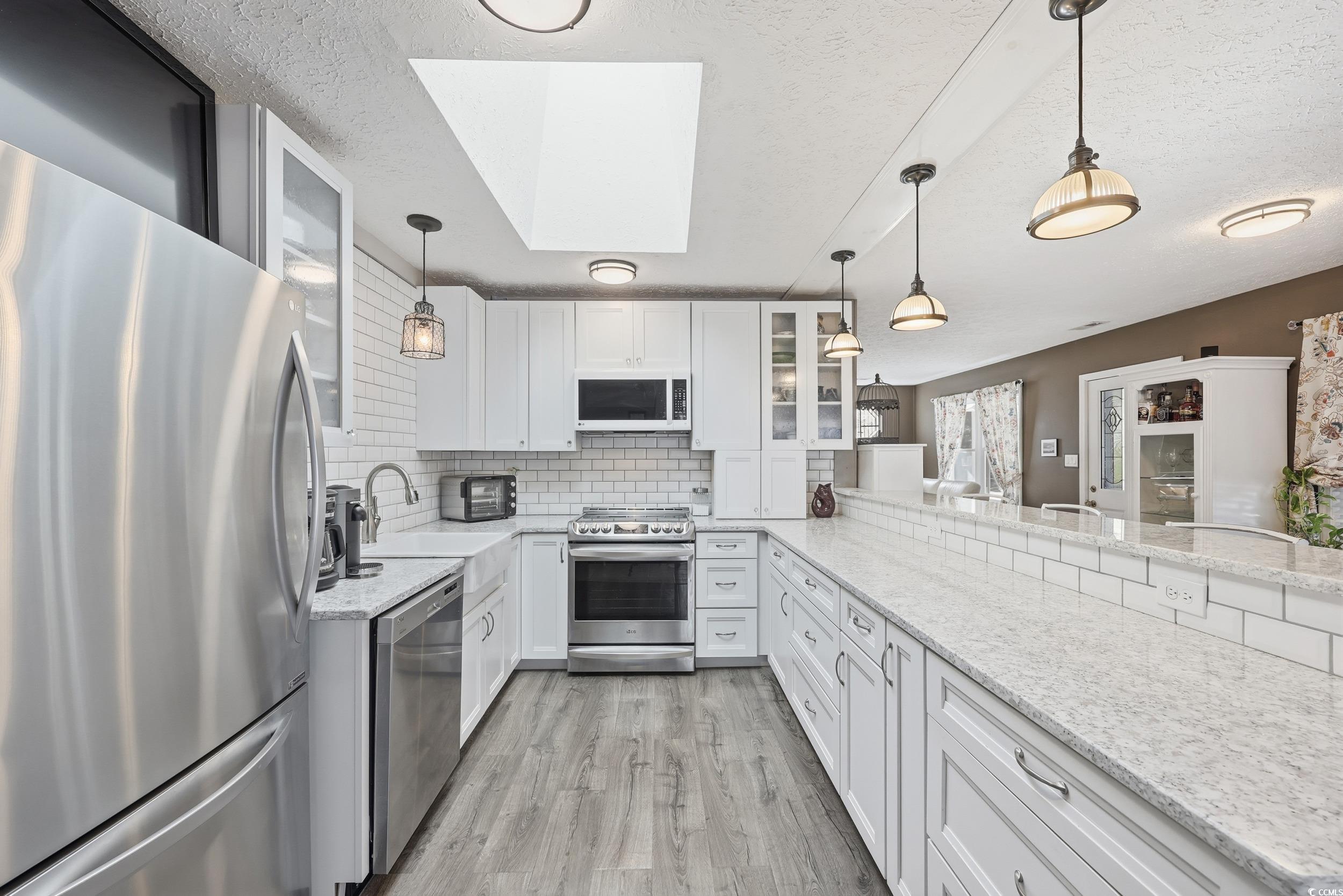 Welcome to Coastal Comfort, a charming light-filled home located in the gated community of Windjammer Village in Little River. 2219 Swamp Fox Circle offers a flexible layout with two inviting living areas, one featuring a cozy fireplace and the other filled with natural light from a wall of windows. The eat-in kitchen showcases quartz countertops, white cabinetry, stainless steel appliances, farmhouse sink, and tile flooring, flowing easily into the main gathering spaces. With three bedrooms, two baths, a double garage with workspace, and an outdoor storage shed, the home blends functionality with character. The screened-in front porch creates the perfect space to enjoy coastal breezes, while hurricane shutters and a private well add convenience and peace of mind. Windjammer Village is known for its unique homes and vibrant lifestyle amenities, including two pools (with kiddie pool), playground, tennis courts, basketball courts, gym, library, game room, meeting space, RV and boat parking, community dock, and direct access to the Intracoastal Waterway. Community roads are scheduled to be repaved at no additional expense to homeowners. Located just minutes from dining, golf, parks, and five minutes to Calabash, NC.