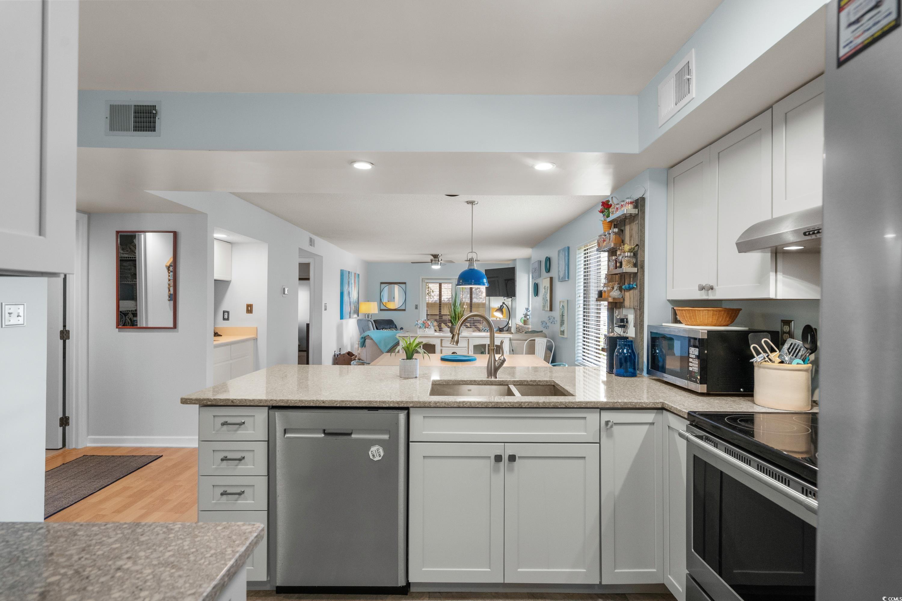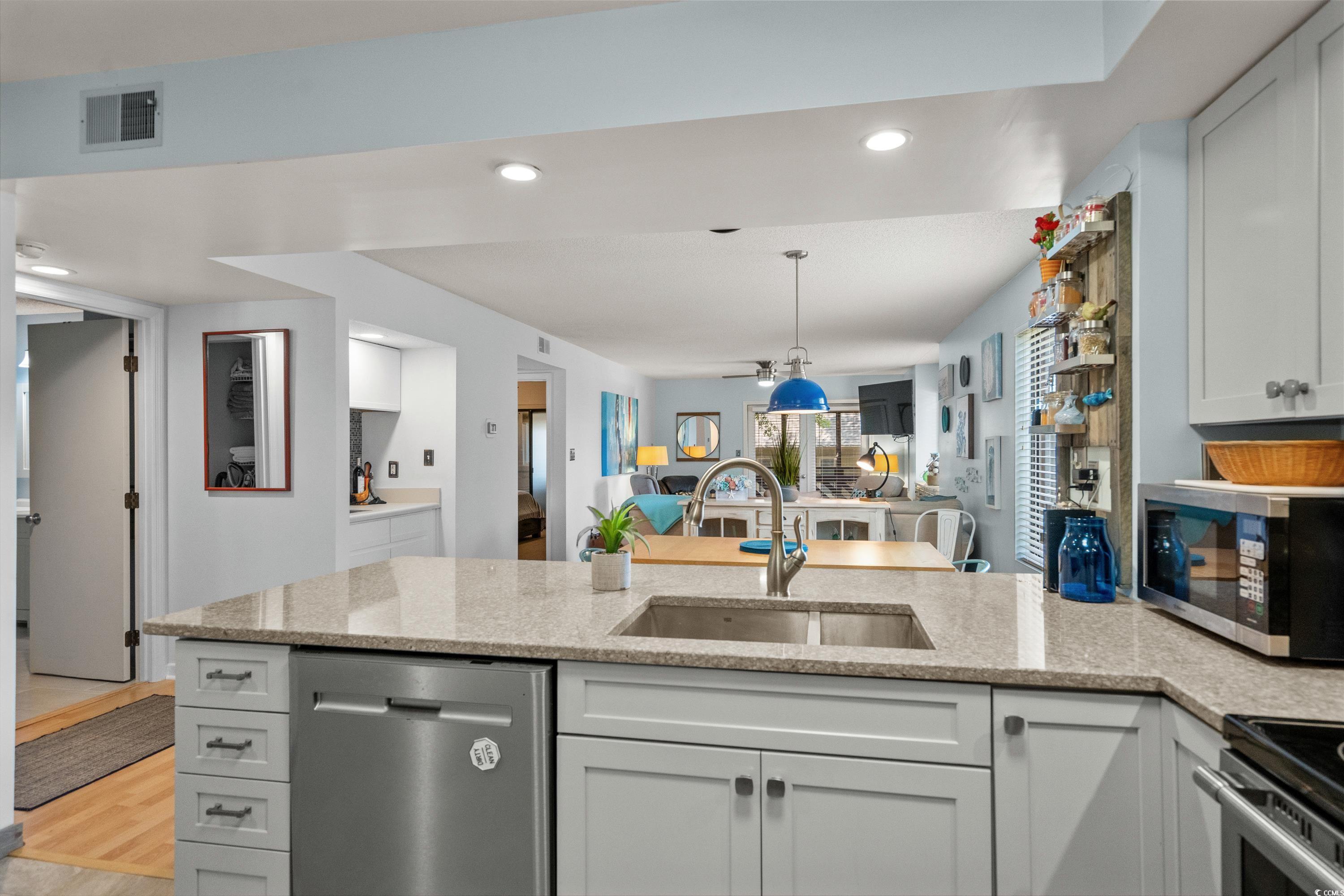 Welcome to Heron Pointe! Beautifully updated and fully furnished 2-bedroom, 2-bath condo located in the sought-after Heron Pointe community, just steps from the beach! This second-floor end unit features a stylishly renovated kitchen with stainless steel appliances, granite countertops, and upgraded soft close cabinetry, perfect for cooking and entertaining. Enjoy morning coffee or evening relaxation in the enclosed sitting area off the master bedroom, offering a private retreat with plenty of natural light. Both the front and rear screened porches provide ideal spaces for entertaining guests or simply enjoying the coastal breeze. Heron Pointe is located in the desirable Shore Drive area—tucked between Myrtle Beach and North Myrtle Beach—offering a quiet, residential feel while still being close to everything. You’re just a short walk or golf cart ride to the beach, the famous Ocean Annie’s Beach Bar, Apache Pier, and numerous local dining and entertainment options. Whether you’re looking for a primary residence, vacation getaway, or investment property, Unit B-8 is a turnkey opportunity in one of the Grand Strand’s hidden gems.