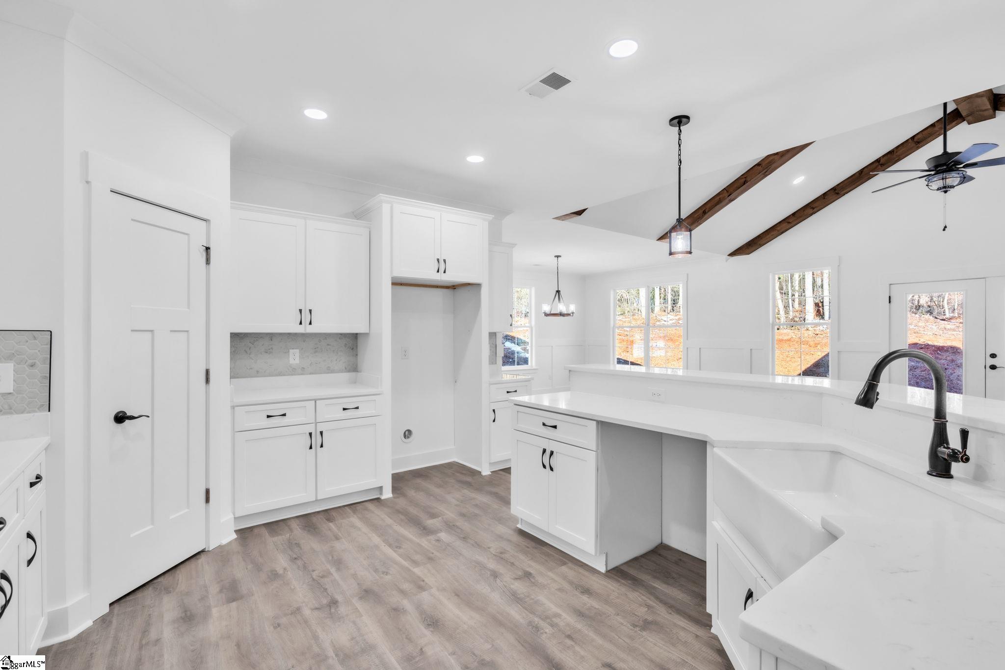 Welcome to your peaceful retreat in Woodmear subdivision! Nestled on a serene .99 of an acre lot, this stunning Silver Plan home offers over 2,830 sq ft of luxurious amenities. Featuring 3 bedrooms and 2.5 baths on 1st floor another full bath upstairs with 2 more large rooms this beautifully crafted residence showcases quality construction by Southern Homes & Associates. The exterior boasts charming vinyl siding on front with tongue and groove under the porches the front door will be stained the color of the columns complemented by craftsman columns on the front and back porches, along with attractive stone accents. Inside, you'll find an inviting foyer adorned with crown molding and wainscoting, leading to an open-concept layout filled with natural light. Enjoy the elegance of luxury vinyl plank flooring throughout, with hardwood treads on the stairs. The Great Room features vaulted ceilings with wood beams and a cozy corner fireplace, perfect for gatherings. The gourmet kitchen is a chef’s delight, equipped with shaker-style white soft-close cabinets, a stylish backsplash, and a white apron farm sink. The raised bar seamlessly connects the kitchen to the Great Room and Dining Room, ideal for entertaining. The primary suite offers a trey ceiling and a luxurious en-suite bathroom, complete with his and her separate vanities, linen cabinets, and a spacious dual-head ceramic tile shower with a glass door. Additional features include ceramic tile in the bathrooms and laundry room, 9-foot ceilings, and ample windows throughout. Step outside to your covered back porch enjoy your morning coffee and soak in the tranquility of the woods at back of the property. This home is complete and ready to close!