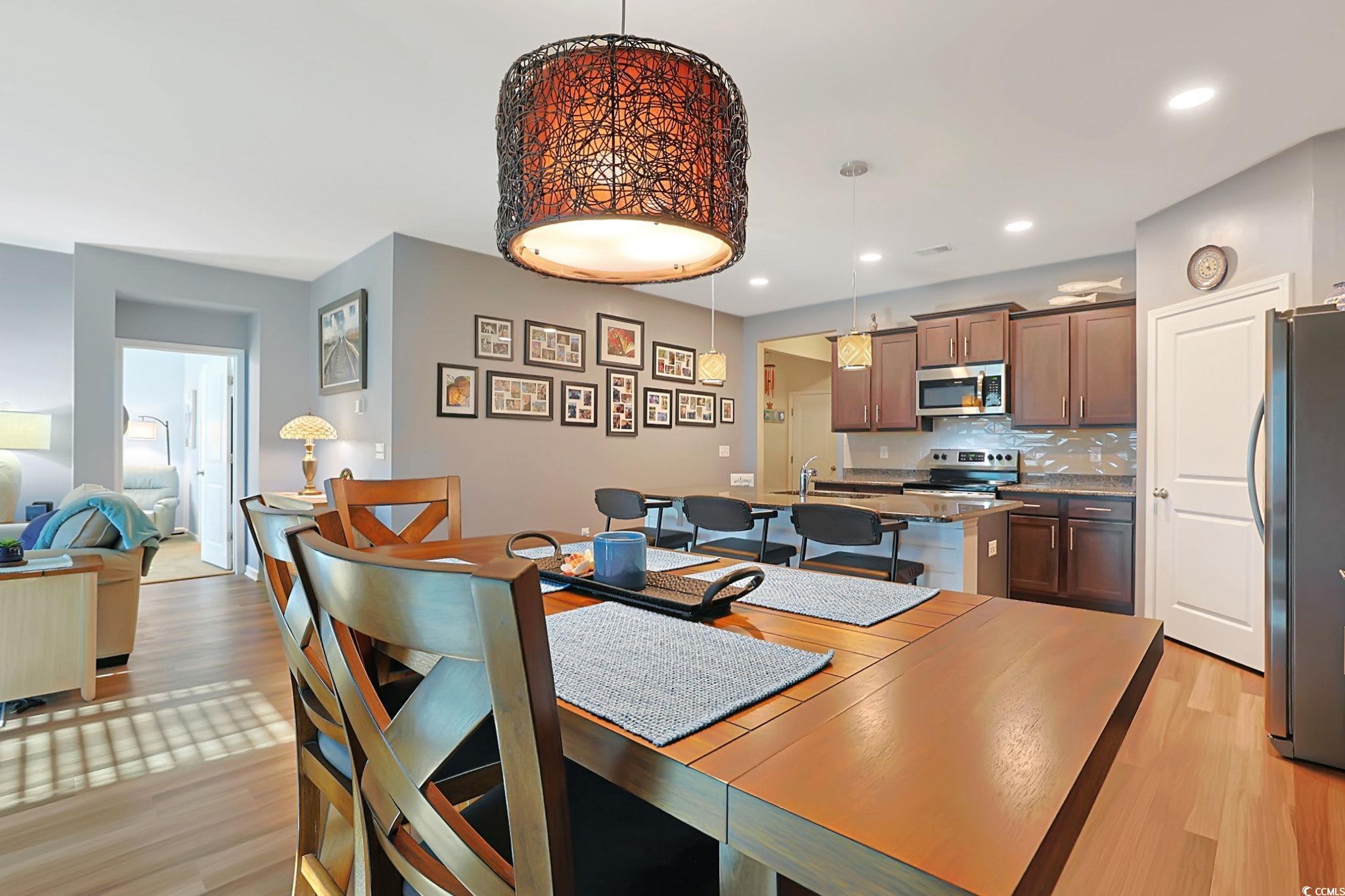 Introducing this vibrant 4 bedroom 2 bath home located in the popular Harmony at St James community. This captivating home features wood look LVP & carpet flooring, smooth flat ceilings, and a large comfortable living/dining room combo that showcases a sliding glass door that opens up to the delightful sunroom. The kitchen is equipped with a stainless steel appliance package, granite counter tops, cabinets topped with crown moulding, a practical kitchen island with a breakfast bar, recessed & pendent lighting, and an ideal kitchen pantry. The primary bedroom offers a ceiling fan, private access to the primary bath that hosts a vanity with dual sinks, a water closet, a deluxe step-in shower, and a large walk-in closet with extra shelving. This memorable home is completed with three additional bedrooms, full guest bath, a laundry room, a fenced in back yard with an uncovered patio that is perfect for grilling, and a two car attached garage. This home affords you easy access to the beach and golfing along with all of the other activities and happenings in Myrtle Beach including fun eateries, award winning off-Broadway shows, public fishing piers, and intriguing shopping adventures along the Grand Strand. Conveniently located to your everyday needs, including grocery stores, banks, post offices, medical centers, doctors’ offices, and pharmacies. Check out our state of the art 3-D Virtual Tour.