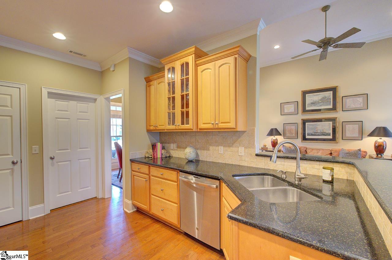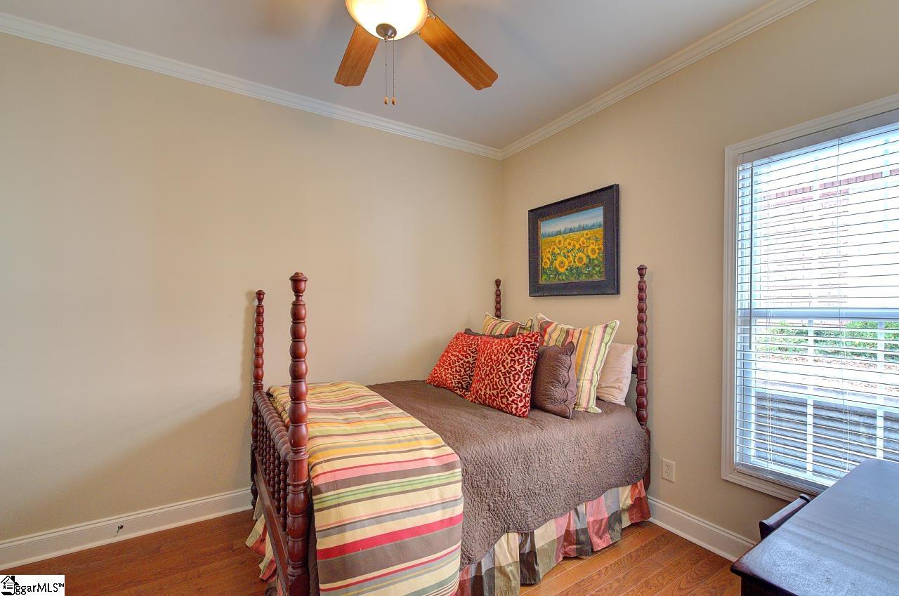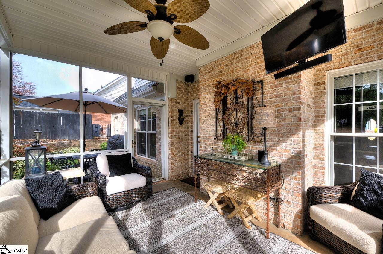 LOOKING FOR LOW MAINTENANCE- Timeless curb appeal and classic architectural style, well-appointed four- sided brick home conveniently located near shopping, restaurants, and no more than 8 miles from Downtown Greenville. HOA $200 per year. The home is spacious, 2650 sq ft with 4 bedrooms and 3 full baths with classic shutters. It sits on .25 acres. The oversized Primary suite on main level has a beautiful double tray 10 ft. ceiling with pocket door, a large bath, separate shower, soaking tub, granite countertop, double sinks, and tile floor, pocket door and a walk-in closet. Two guest bedrooms are on the main opposite side of the house with full bath. Entry to the first floor opens to foyer and family room with gas fireplace, formal dining room with 14ft coffered ceiling, breakfast room and kitchen with all stainless-steel appliances with 10ft ceilings. The kitchen has quartz countertops and breakfast bar seating, pantry, and laundry/mudroom access with tile flooring. The family/breakfast room leads to a backyard oasis with a screened porch with two flanking patios, paver walkways perfect for extended entertainment or relaxation perfect for grilling by waterfall / pond feature combo with a brick wood burning fireplace in a private fence in backyard. Upstairs is a versatile flex space with fourth guest bedroom, full bath shower/tub combo, walk in closet and bonus room with storage closet used as in-law suite. The bonus could be converted to a theater/game room/hobby room. Ease of living with hardwood floors on main floor and 2-inch wooden blinds throughout the home, Central Vac System, Home Alarm, Outdoor landscape lighting and Sprinkler System, and two (2) High efficiency heating and air systems for each floor and Vinyl double pane tilt windows for easy cleaning. Crown molding throughout the home. Surround sound in family room with speakers in the primary bedroom and bath and screen porch. Great location close to shopping, GSP Airport (6 miles away), Downtown Greenville (8 miles away). Bridgeway Station (2.6 miles), and Downtown Greer, (10 miles). If you like to travel, jumping onto I-85 or 385 is easy access. Schedule appointment today.