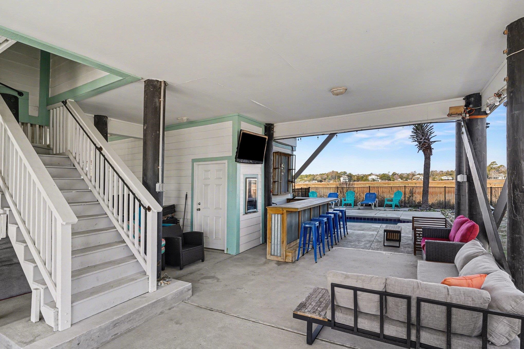 This raised beach house offers five bedrooms and five and one half bathrooms, and NO HOA. It features ocean views from the front and marsh views from the back, creating a bright and airy atmosphere throughout. The kitchen is equipped with stainless steel appliances, granite countertops, and a breakfast bar. Each spacious bedroom includes a private deck and en suite bathroom. The home is sold furnished. Outdoor living includes multiple decks, a private saltwater pool overlooking the marsh, and a custom outdoor bar. Located just one block from Garden City Beach, this semi detached home is also close to the Marsh Walk and a short drive from all that the Grand Strand has to offer. This property is ideal as a primary residence, investment property, or vacation home.