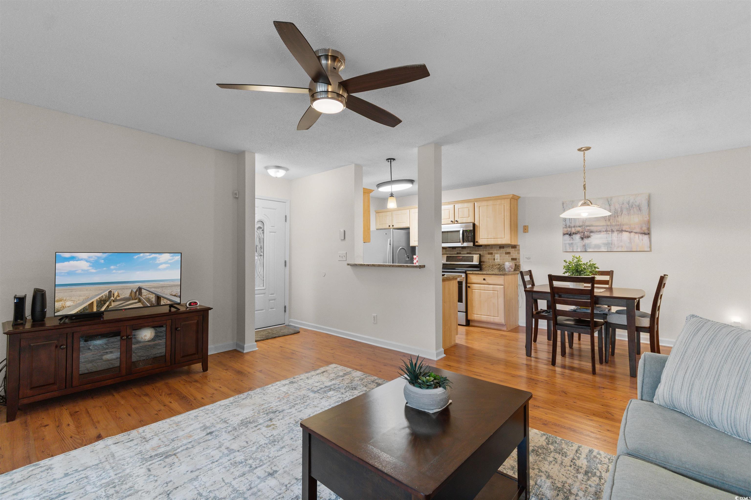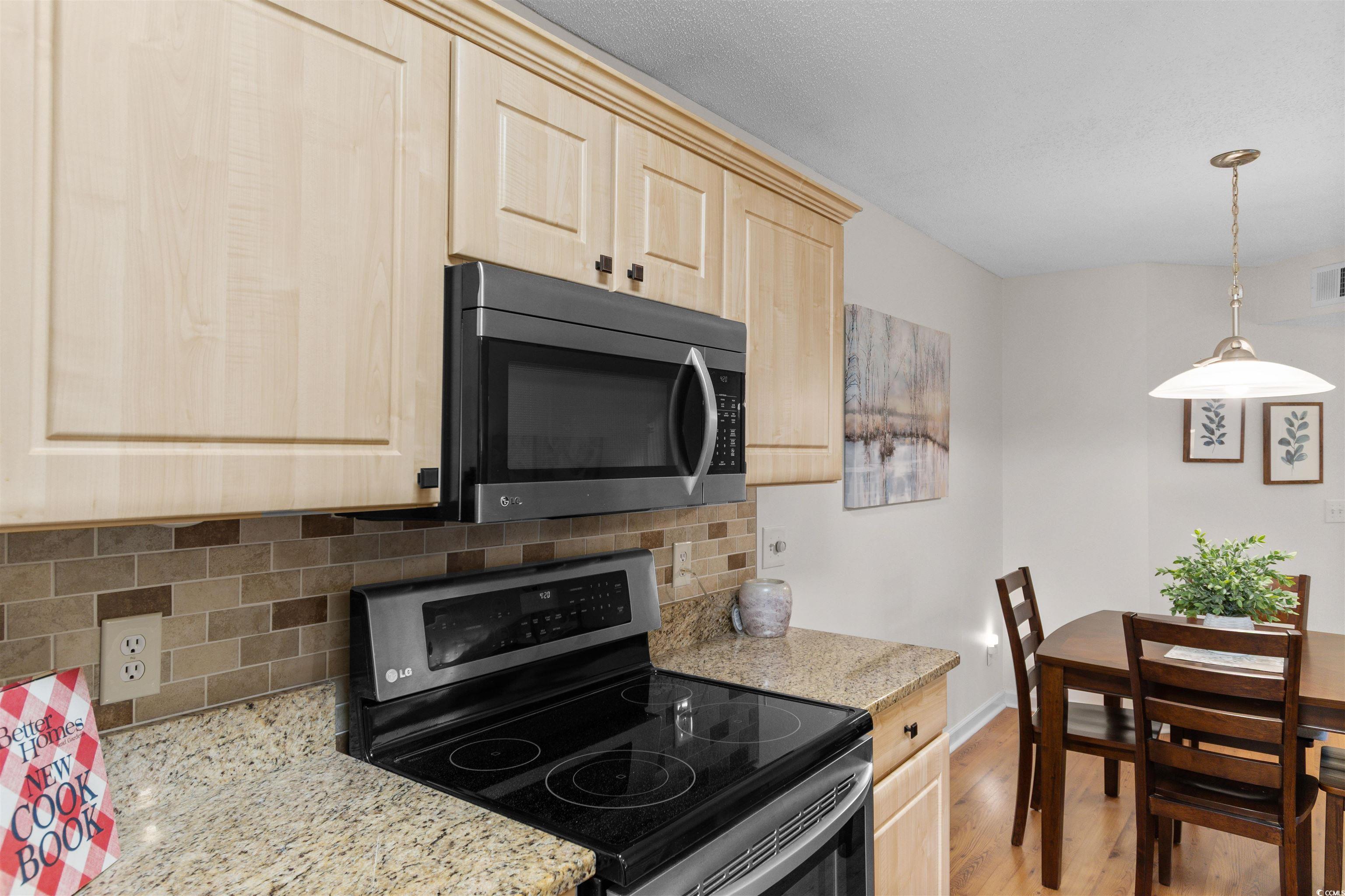 Step into effortless coastal comfort with this beautifully cared-for first-floor 2-bedroom, 2-bath condo tucked within the inviting South Bridge community of Surfside Beach. Thoughtfully designed and filled with natural light, this home offers a warm and welcoming atmosphere from the moment you enter. Recent upgrades include a new HVAC system and a new water heater, providing added peace of mind and energy efficiency for the next owner. The open-concept living and dining area feels spacious and airy, creating the ideal backdrop for quiet evenings, casual get-togethers, or weekend relaxation. Large windows frame calming views and allow sunlight to fill the space throughout the day. At the heart of the home is a stylish, well-equipped kitchen featuring sleek stainless steel appliances, rich granite countertops, a modern glass tile backsplash, and a convenient breakfast bar perfect for morning coffee or quick meals. Every detail comes together to create a kitchen that is as functional as it is attractive. The primary bedroom is generously sized and offers a peaceful retreat with abundant natural light and a private full bathroom. The second bedroom is equally comfortable, providing flexibility for guests or additional family members. A standout feature of this condo is the versatile den/flex room, which overlooks the community lake. This serene space can easily serve as a home office, cozy reading nook, craft room, or secondary sitting area—ideal for anyone seeking a quiet corner with a view. South Bridge enhances everyday living with great amenities, including a sparkling community pool and a shaded picnic area—perfect for enjoying warm coastal afternoons. Located just minutes from the shoreline, you’ll have quick access to Surfside Beach’s beautiful coast, as well as an abundance of shopping, dining, golf, and entertainment options throughout the Grand Strand. Whether you’re seeking a full-time home, a relaxing vacation retreat, or a smart investment, this first-floor condo delivers comfort, convenience, and an unmistakable coastal charm.