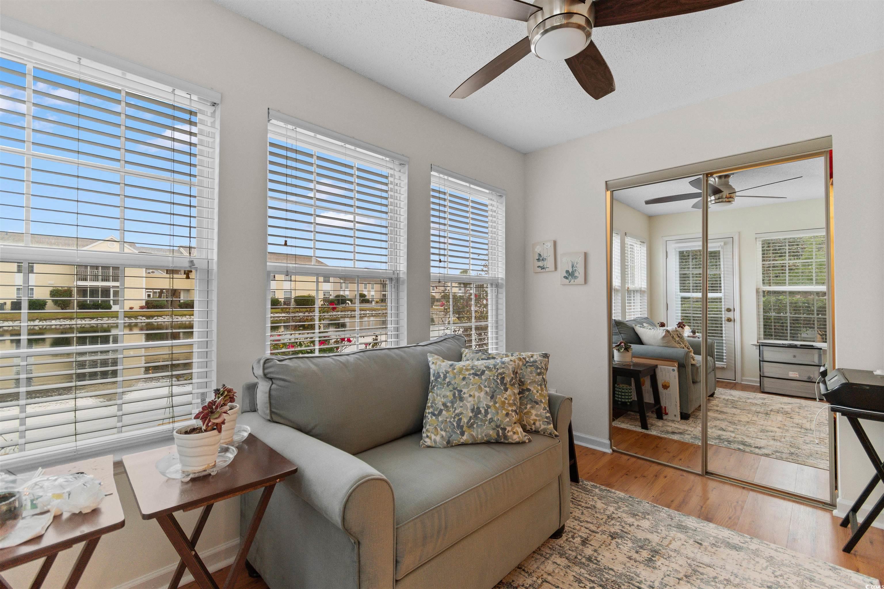 Step into effortless coastal comfort with this beautifully cared-for first-floor 2-bedroom, 2-bath 1st floor condo tucked within the inviting South Bridge community of Surfside Beach. Thoughtfully designed and filled with natural light, this home offers a warm and welcoming atmosphere from the moment you enter. The open-concept living and dining area feels spacious and airy, creating the ideal backdrop for quiet evenings, casual get-togethers, or weekend relaxation. Large windows frame calming views and allow sunlight to fill the space throughout the day. At the heart of the home is a stylish, well-equipped kitchen featuring sleek stainless steel appliances, rich granite countertops, a modern glass tile backsplash, and a convenient breakfast bar perfect for morning coffee or quick meals. Every detail comes together to create a kitchen that is as functional as it is attractive. The primary bedroom is generously sized and offers a peaceful retreat with abundant natural light and a private full bathroom. The second bedroom is equally comfortable, providing flexibility for guests or additional family members. A standout feature of this condo is the versatile den/flex room, which overlooks the community lake. This serene space can easily serve as a home office, cozy reading nook, craft room, or secondary sitting area—ideal for anyone seeking a quiet corner with a view. South Bridge enhances everyday living with great amenities, including a sparkling community pool and a shaded picnic area—perfect for enjoying warm coastal afternoons. Located just minutes from the shoreline, you’ll have quick access to Surfside Beach’s beautiful coast, as well as an abundance of shopping, dining, golf, and entertainment options throughout the Grand Strand. Whether you’re seeking a full-time home, a relaxing vacation retreat, or a smart investment, this first-floor condo delivers comfort, convenience, and an unmistakable coastal charm.