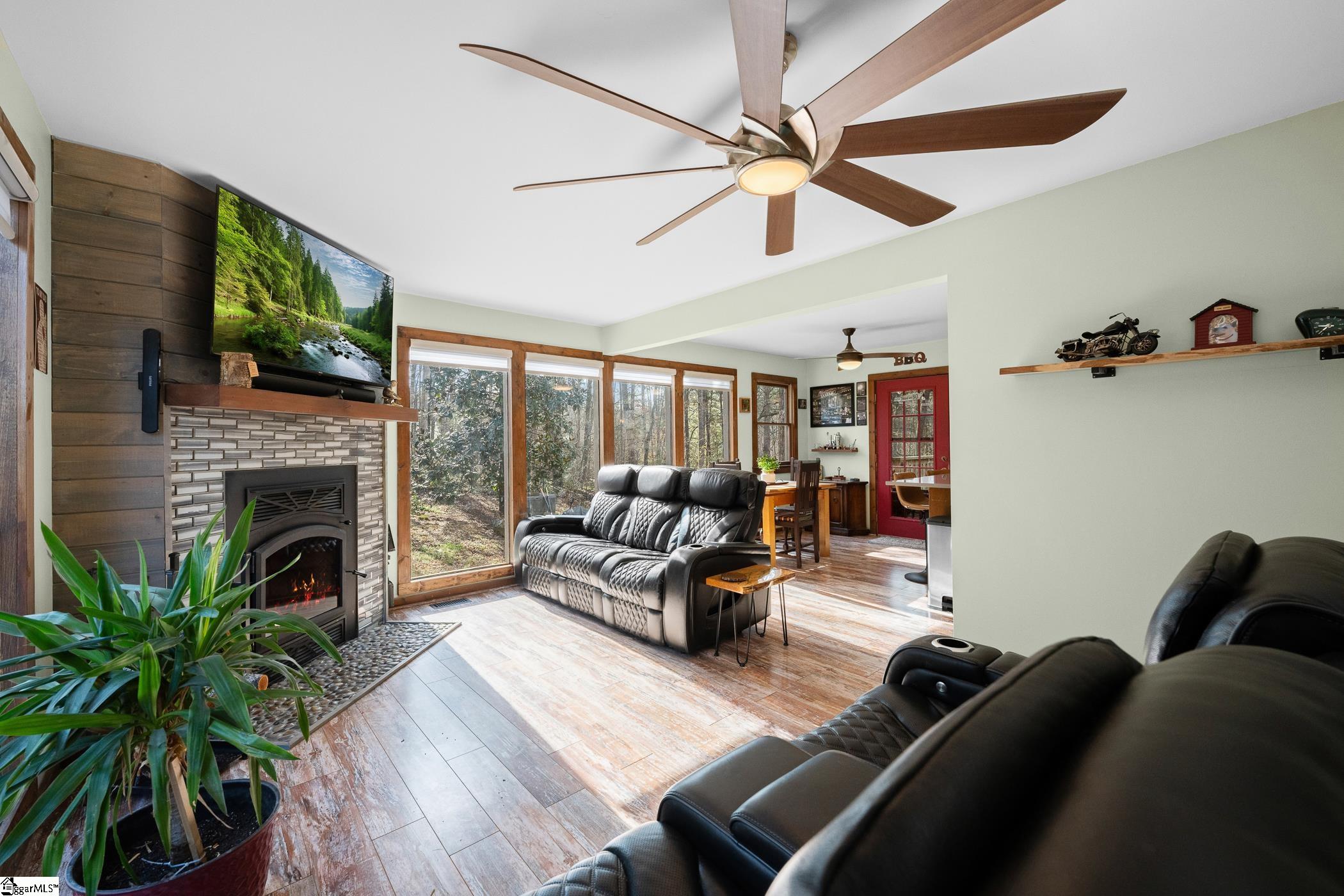 Your search is over! This home with like new LVP flooring is pure sweetness and offers a cozy welcome the moment you walk through the door. The charming den features a beautifully surrounded wood burning insert and large windows that flow seamlessly into the kitchen. The light and airy feel creates a bright, inviting, and spacious treehouse atmosphere with peaceful views. The generously sized kitchen boasts solid wood cabinets, quartz countertops with bar seating, and abundant storage. The private primary bedroom is conveniently tucked away on the main floor and includes two walk in closets. A renovated and stylish main floor bathroom with a walk-in tiled shower provides access from both the primary suite and the hallway. Upstairs you will find another full bathroom with a shower and bath combination, along with two additional bedrooms. One of the bedrooms is oversized and features large windows and ample closet space. The bonus basement area includes the laundry and offers both finished and unfinished spaces, giving you flexibility to customize it to your needs. Situated on over an acre, the property offers privacy and a charming mini homestead feel, complete with a chicken coop, small livestock shelter, greenhouse, storage building, and space for gardening. The covered deck off the kitchen overlooks the fenced in backyard and is perfect for morning coffee, grilling, and entertaining. All of this plus the HVAC was installed in 2024! The location is also ideal, with a short drive to favorite Upstate destinations and lakes including lake Hartwell and Lake Keowee, along with plenty of additional outdoor recreation nearby.