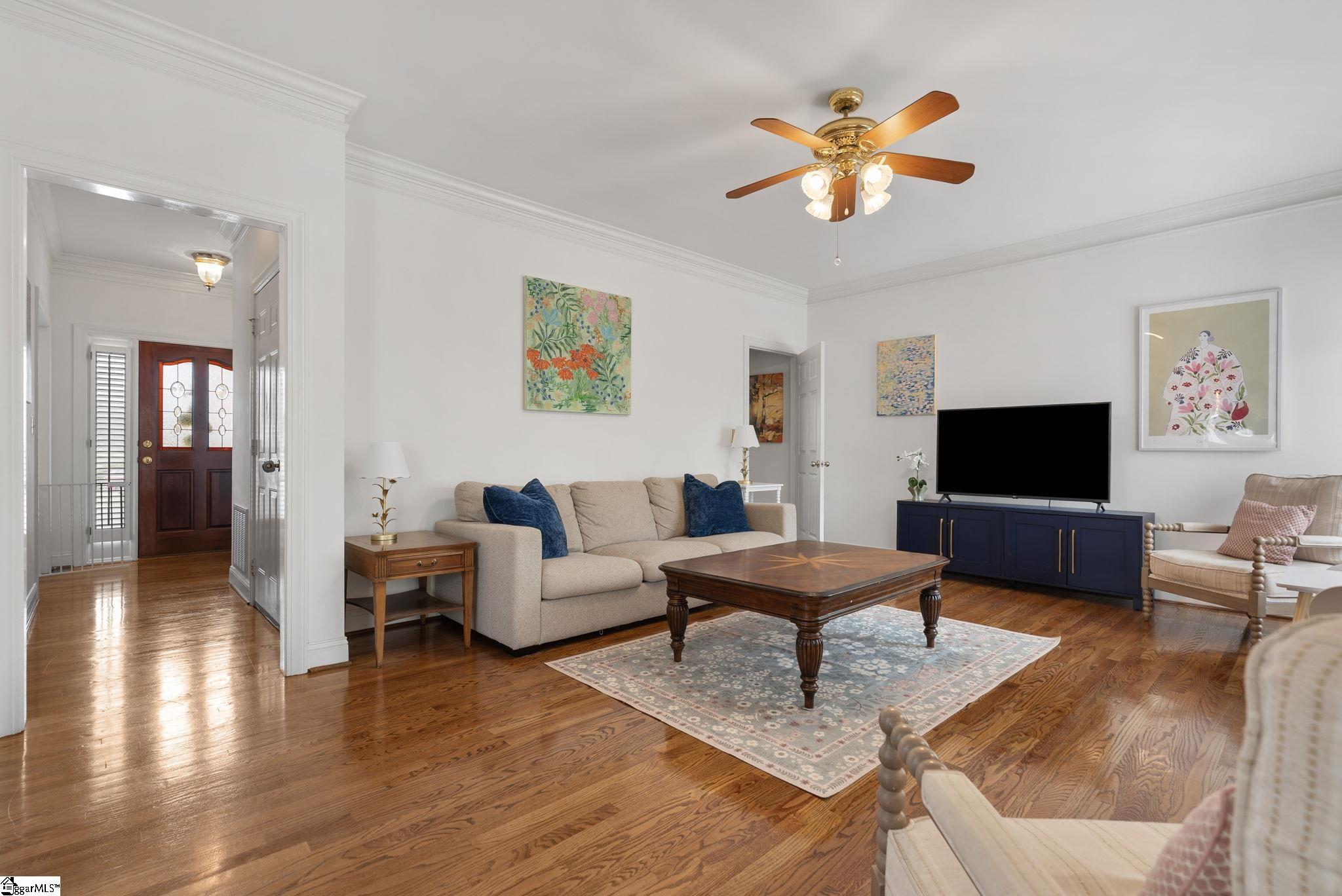 Situated in the premier location on a quiet cul de sac, 23 Brookstone Green is a charming, spacious home, filled with natural light and nestled on a large lot complete with mature hardwoods, a flowing creek and unobstructed golf course fairway views. From the wide front porch, enter the gracious foyer with a view straight through to the beautiful back yard. A formal dining with large plantation shuttered windows, powder room and den, all with gleaming hardwood floors are off the central hall. Fully renovated, including new cabinetry, granite countertops and all new appliances, the eat in kitchen features a green house window over the large stainless steel sink and a bay window, both with views of the yard and golf course fairways. The large den is anchored by a fire place with gas logs under a pretty fanlight window. Off the den, an expansive three season screened porch with removable plexiglass porch panels overlooks the peaceful backyard. An adjoining grilling porch completes the space, perfect for relaxing or hosting gatherings. The main floor also includes a generous primary suite with double vanity and separate large bathroom with both a garden tub and shower. Carpeted stairs lead up to the second floor with two large bedrooms, a cozy nook for relaxing and a linen closet and full bath, again with double sinks and a separate tub/shower combo. And there is more! The lower level features a fully finished flex/family room with half bath and ample storage space. This generously sized room with distinct exterior access (as well as access from one of the garage bays) could also be used as an office, gym, media room, workshop, bedroom or combination of these. A french door opens onto yet another porch, steps away from the lovely yard. Offering exceptional convenience with easy access to both Rutherford and Stallings Roads, and a highly desirable location close to downtown Greenville , Greer and Traveler's Rest, this home is a true gem. Thoughtfully cared for by the same family since 2004, this functional and versatile move in ready home offers an exceptional opportunity to live, work, relax and entertain with a backdrop of sunny serenity at 23 Brookstone Green. Buyers should verify square footage both above and below grade. Buyers should verify the school district for elementary, middle and high schools as changes may occur from time to time. Membership and/or public play at Pebble Creek Golf is available at a separate cost. Buyers should verify membership and public play opportunities, and any strategic and development plans for the golf course and holes. A recent CL-100 report, dated April 1, 2026, issued by AMERICAN TERMAPEST, INC., is available for information purposes only and Buyers should procure their own CL-100 report as part of the due diligence process.