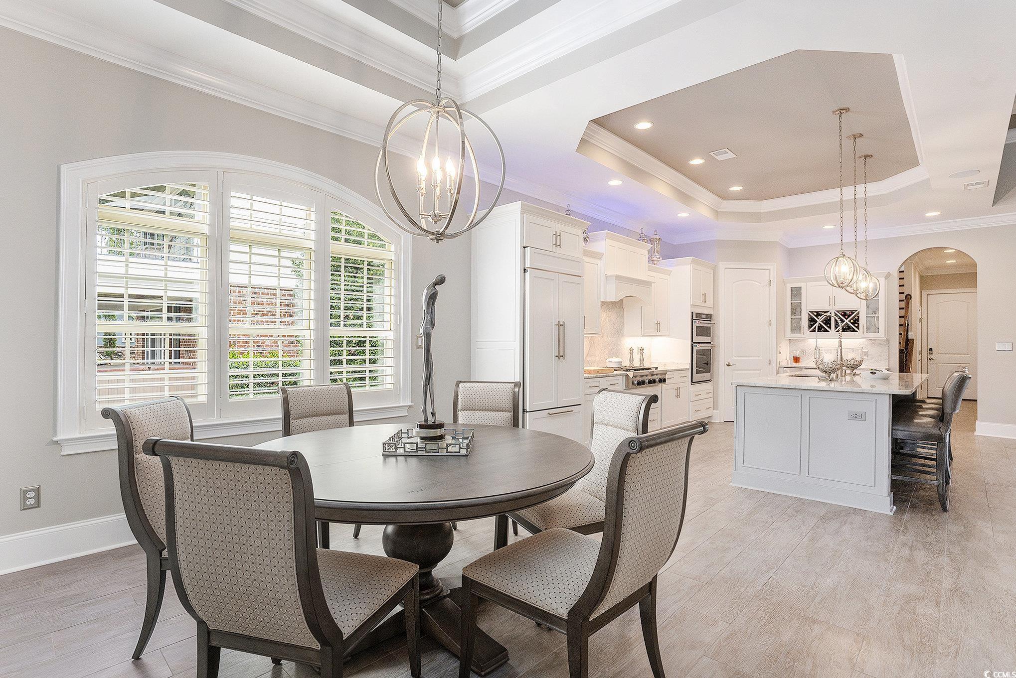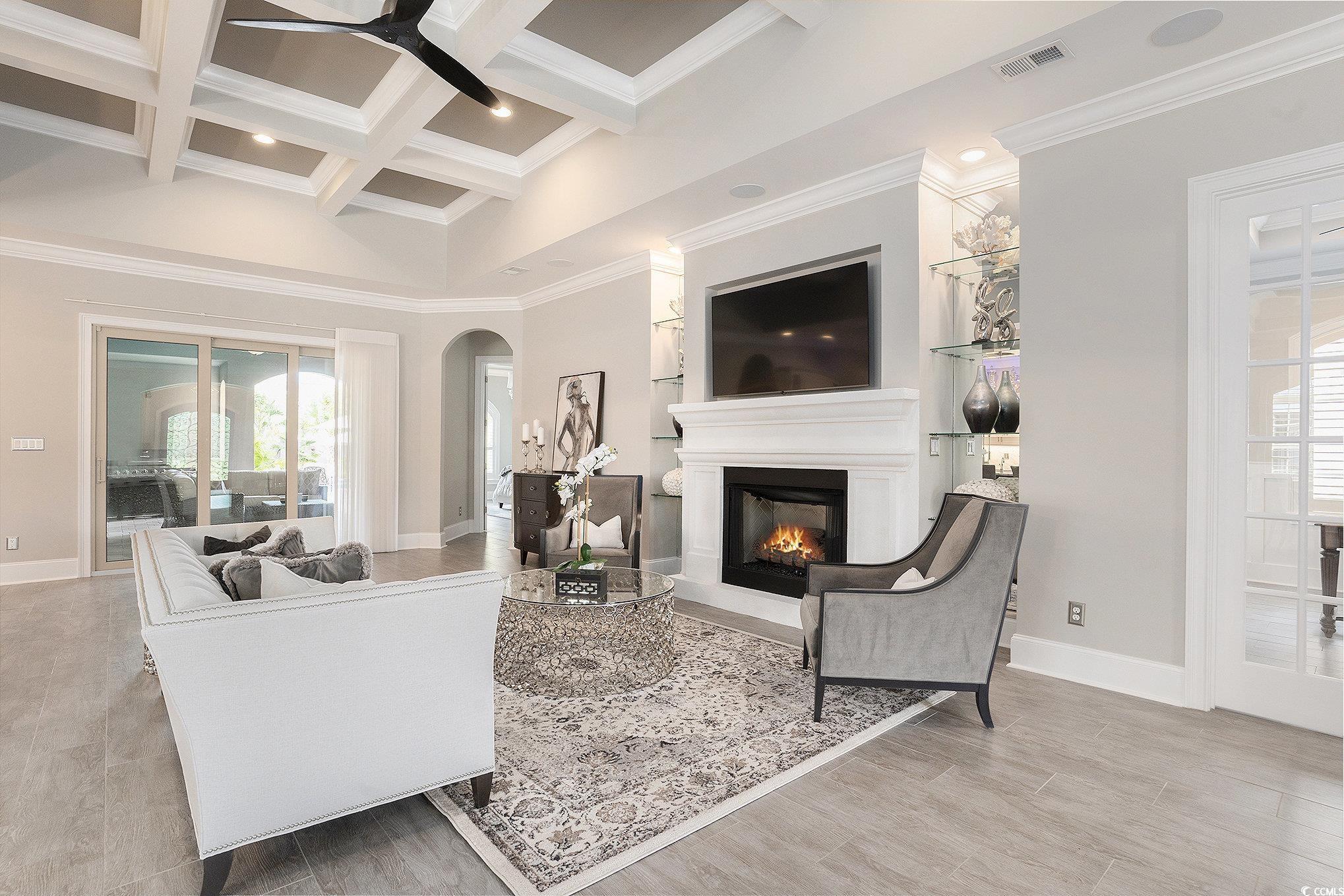 Welcome to The Bluffs on the Waterway, one of Myrtle Beach’s most sought-after gated communities along the Intracoastal Waterway. This stunning 4-bedroom, 4-bathroom custom home perfectly blends timeless elegance with coastal sophistication—offering comfort, privacy, and luxurious design at every turn. From the moment you arrive, the curved driveway and manicured landscaping framed by palm trees make a grand first impression. Step through the arched front porch into a bright, open floor plan featuring high ceilings, custom millwork, and abundant natural light. The open-concept living area is both elegant and inviting, showcasing coffered ceilings, a modern ceiling fan, and a gas fireplace framed by custom built-ins. Expansive sliding glass doors fill the space with sunlight and connect seamlessly to the outdoor living area, enhancing the home’s indoor-outdoor flow. The gourmet kitchen is a true showstopper, featuring timeless white cabinetry, marble countertops, and a full-height marble backsplash behind a professional-grade gas range. Pendant lighting, under-cabinet illumination, and a large island with seating create a functional yet stylish centerpiece. Additional highlights include double ovens, a paneled refrigerator, built-in wine storage, and a beverage cooler—ideal for entertaining. All kitchen appliances are KitchenAid. The adjacent dining area features tray ceilings, a statement chandelier, and arched plantation-shuttered windows. The primary suite is a serene retreat featuring detailed tray ceilings, a designer chandelier, and soft natural light from arched windows. The spa-inspired ensuite bathroom boasts dual vanities, a soaking tub, and an oversized walk-in tile shower with decorative inlays. A spacious custom closet provides exceptional organization and storage. Three additional bedrooms and three full bathrooms ensure comfort and privacy for family and guests. One of the bedrooms has been converted into a cozy media room—perfect for movie nights or game days. The dedicated home office offers a quiet workspace with French doors, wainscoting, and elegant trim details. Upstairs, a versatile flex room currently serves as a home gym but can easily adapt as a studio, playroom, or guest suite. A stylish laundry room adds convenience with custom cabinetry, marble-style counters, and a utility sink. Step outside to your own private coastal oasis. The backyard is designed for relaxation and entertaining, featuring a sparkling pool surrounded by tropical landscaping and privacy walls. Water features add a tranquil, resort-like ambiance, while the expansive paver patio offers plenty of space for lounging and outdoor dining. The covered patio provides a shaded retreat with a wood-paneled ceiling, ceiling fan, outdoor television, and space for a grill—ideal for al fresco living. Living in The Bluffs on the Waterway means access to unmatched community amenities, including a private boat launch, day docks, clubhouse, outdoor pool, playground, tennis courts, and scenic walking trails—all just minutes from Myrtle Beach’s finest dining, golf, and coastline.