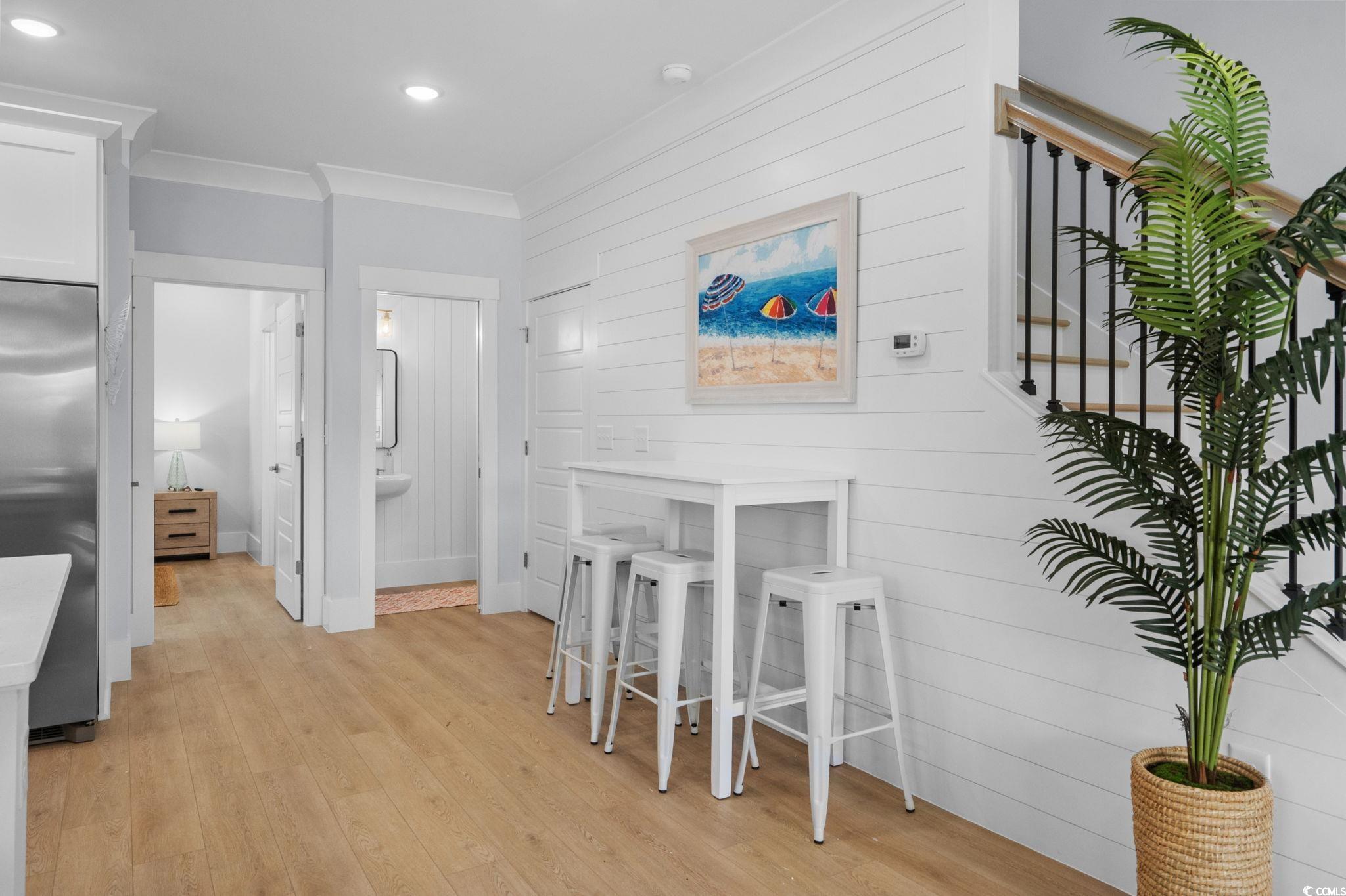 Welcome to 2302 Seaseeker Ln., a move-in-ready, furnished raised beach home with exceptional space and rental flexibility! This property offers 4 bedrooms, 3.5 baths, a loft, and two primary suites. Located in Seabreeze II just east of Highway 17 where short-term rentals are allowed, and the ocean is just a short walk away. The ground level includes covered parking, an outdoor shower, and an insulated one-car garage. Inside the open-concept living and kitchen area is outfitted with quartz countertops, stainless steel appliances, soft-close cabinetry, and a breakfast bar. The main level also includes a powder room, a covered walkout balcony, and a primary suite with a fully tiled, glass-enclosed shower and dual vanities. The third floor offers a loft or flex office space, three additional bedrooms, and two full bathrooms, both with dual vanities.