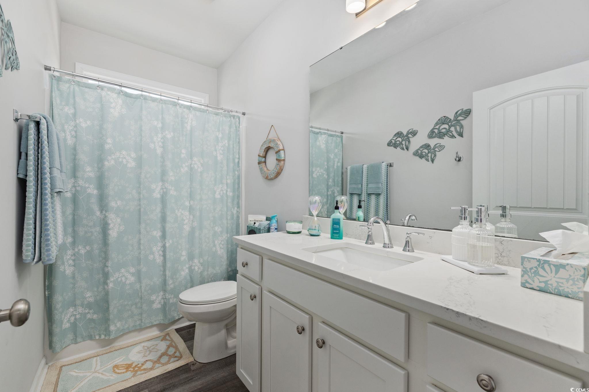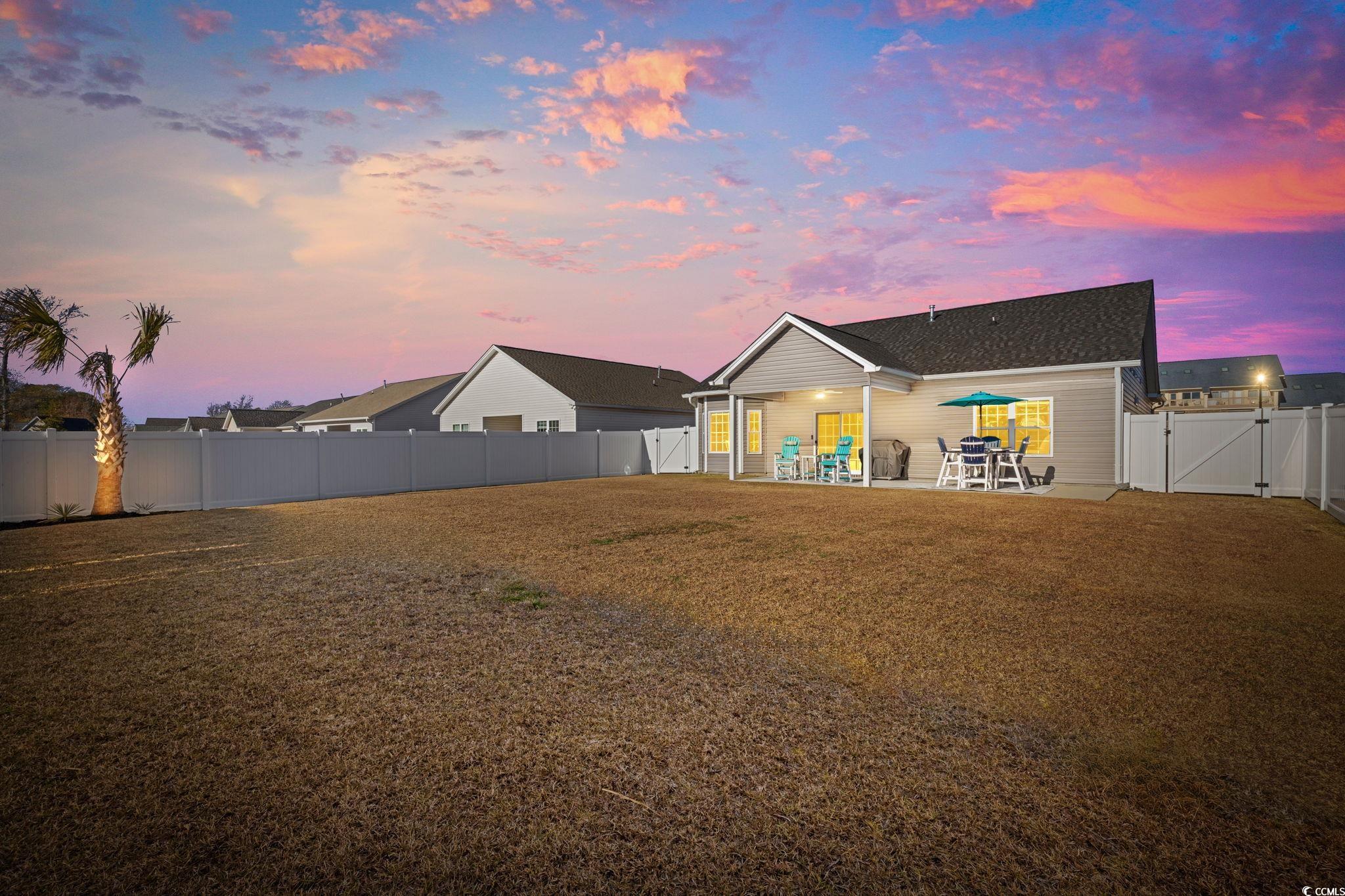 Welcome to 231 Lifestyle Court, a beautifully designed 2023-built home located in one of the most desirable areas of Surfside Beach within the Ocean Palms community. Set on a private lot, this home offers the perfect blend of coastal convenience and peaceful seclusion, all just a short golf cart ride to the beach. Designed for effortless coastal living, this 3-bedroom, 2-bath home features a spacious open-concept, single-level floor plan filled with natural light. The main living area is highlighted by a vaulted ceiling, enhancing the airy coastal feel and creating an inviting space for both everyday living and entertaining. Sliding glass doors open to a covered rear porch with a ceiling fan and an extended concrete patio, ideal for relaxing or hosting gatherings in a private outdoor setting. Luxury vinyl plank flooring is located throughout the entire home, offering both durability and timeless style. The kitchen is a true showpiece, featuring stainless steel appliances with a natural gas oven, a beautiful porcelain farmhouse sink, quartz countertops, a white subway tile backsplash, and a generously sized island perfect for entertaining and casual dining. The owner’s suite serves as a quiet retreat with a tray ceiling, walk-in closet, and a well-appointed en-suite bath featuring a double vanity and oversized shower. Two additional bedrooms provide flexibility for guests, family, or a home office. Step outside to enjoy the oversized, fully fenced backyard that backs to a private setting, complete with lawn irrigation and plenty of space to create your own outdoor oasis. Whether you envision a pool, outdoor entertaining area, or peaceful garden, this lot provides endless possibilities. The attached 2-car garage has been fully finished with painted walls and trim and a durable epoxy-coated floor, offering a clean, polished space ideal for storage, hobbies, or beach gear. Additional upgrades include new light fixtures, custom window treatments, ceiling fans throughout, a storm door, and a 6-foot privacy fence. Located just minutes from the Surfside Beach shoreline, this home offers convenient access to local dining, shopping, entertainment, golf, medical facilities, and Myrtle Beach International Airport. Whether you are looking for a full-time residence or the ultimate beach retreat, 231 Lifestyle Court delivers the ideal blend of coastal charm, privacy, and modern upgrades. Don’t miss the opportunity to live in one of the Grand Strand’s most sought-after communities. Experience the Surfside Beach lifestyle at its finest at 231 Lifestyle Court.