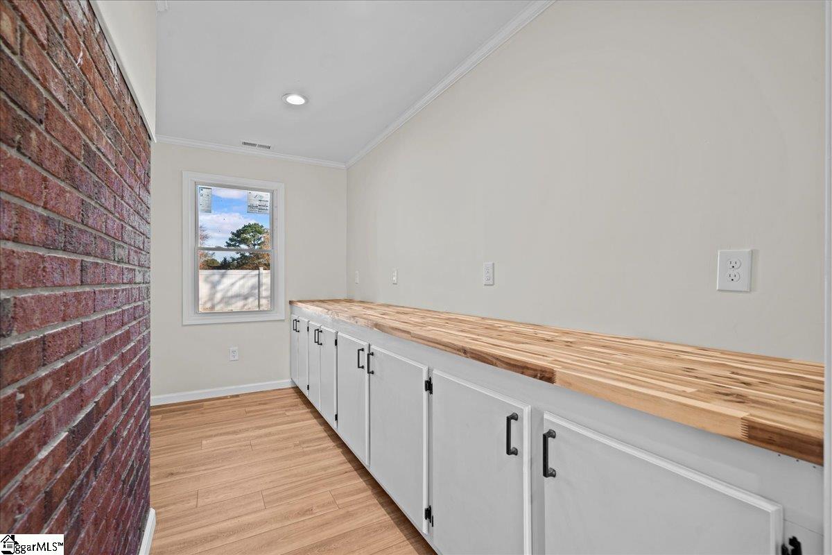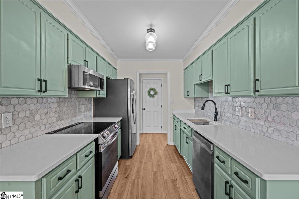 Tired of stairs lately? This recently updated one-level brick home, on a level lot, waits for you to call it your new home! Conveniently located within a short drive to shopping, restaurants, Greenville/Spartanburg, GSP airport and Interstates. This lovely home features 4 bedrooms and 3 full baths, beautifully updated galley kitchen with quartz countertop, backsplash, stainless steel appliances and more. Updated lighting, wide luxury planks, ceiling fans and fresh paint throughout. The most recent addition includes the addition of the 4th bedroom and a luxurious full bath with tiled wall shower including the back section of the home. The butler's pantry or flex room offers added counter space for small appliances or placement for meals during gatherings. Gather in the great room for a cozy evening in front of the fireplace or just step out back under the spacious covered patio to enjoy some fresh air. The expanded 13x18 uncovered patio offers plenty of space for outdoor cooking appliances and outdoor furniture. The HVAC was installed in 2024. Gorgeous window plantation shutters remain. Don't delay, not too many one level home with side entry garage and this much land come on the market often. Call and schedule your private tour soon!