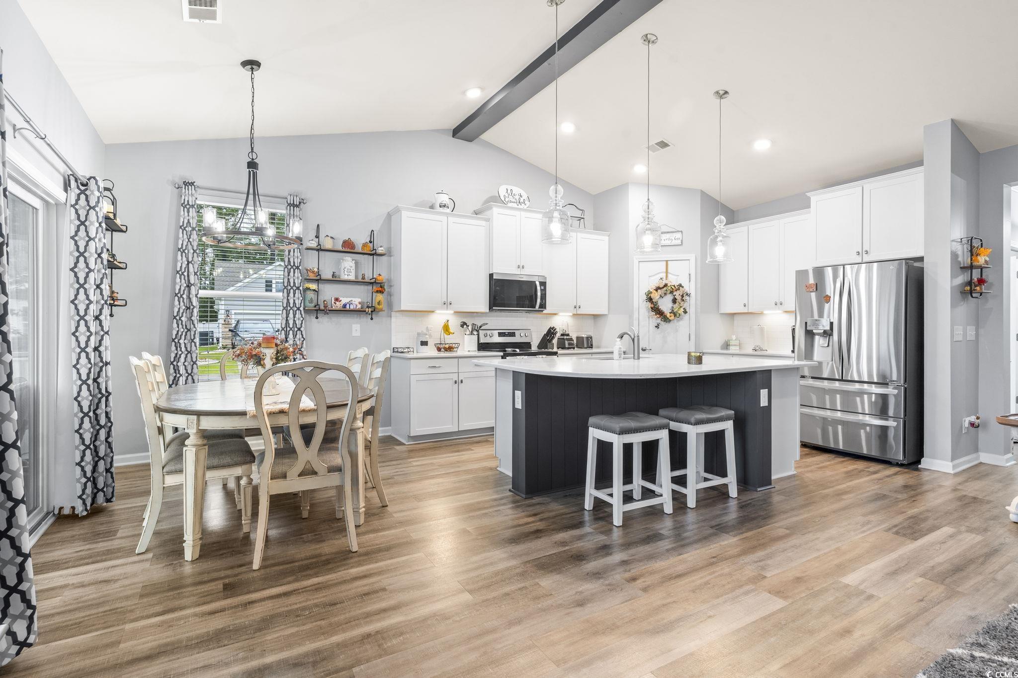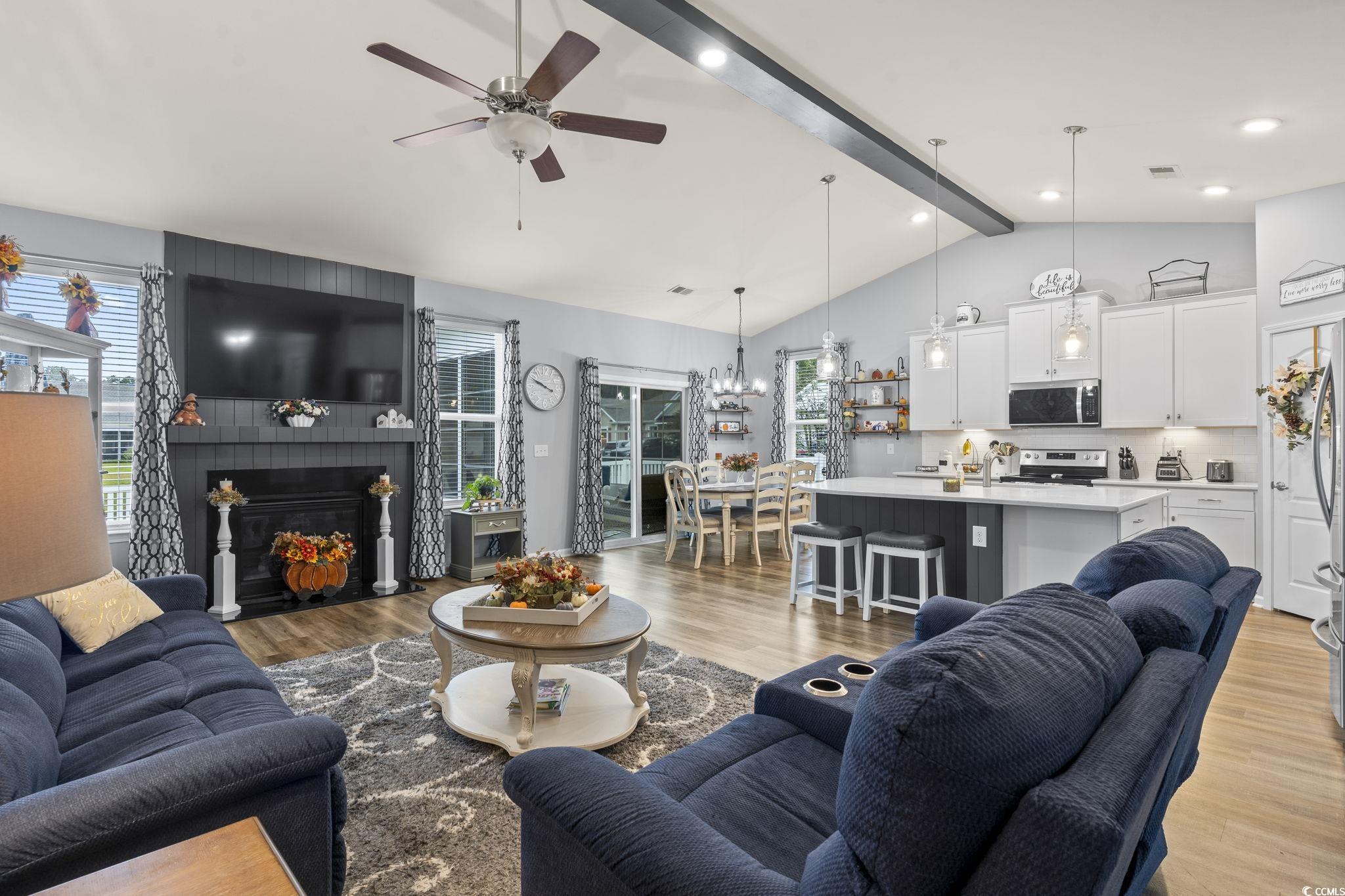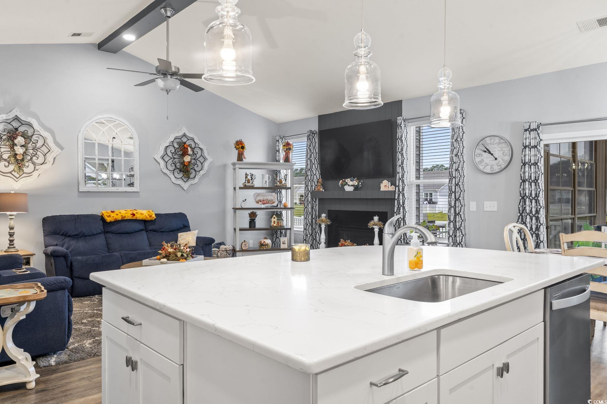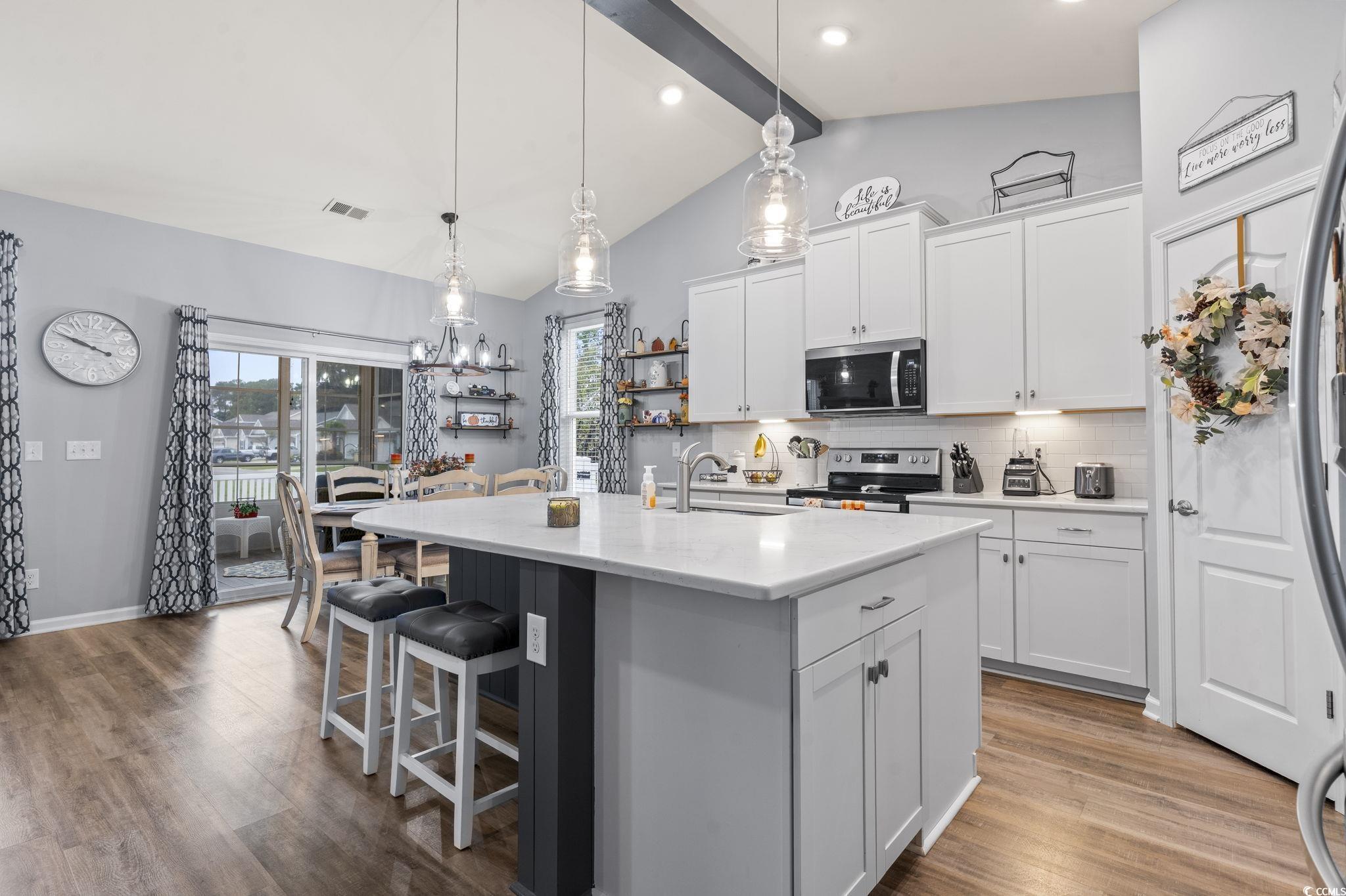 Welcome to this inviting single-story home situated in the desirable Cameron Village community. Designed with an open floor plan, the kitchen flows into the spacious great room, both highlighted by elegant, vaulted ceilings. French doors lead to a flexible room, which can be customized as a home office, playroom, or dining area, offering versatility to suit your lifestyle needs The expansive primary suite is crafted for ultimate comfort and relaxation. It features a stunning bay window that bathes the room in natural light, creating a warm and welcoming ambiance. The en suite bathroom includes double vanity sinks and a generously sized tile shower, presenting a spa-like atmosphere for daily indulgence. This home is enhanced by a selection of premium upgrades. Enjoy the durability and style of luxury vinyl plank flooring in the main living areas, complemented by Quartz countertops, a tiled backsplash and pendant lighting in the kitchen. The custom tile shower adds a touch of luxury, while shiplap accents in the primary bedroom and on the fireplace deliver modern flair. Additionally, a decorative beam with integrated lighting elevates the look and feel of the kitchen and family room. This home has a split-bedroom layout, and the main bathroom is equipped with a newly installed soaking tub complemented by a tiled accent wall. Step outside onto the back porch, designed for year-round enjoyment with Eze-Breeze windows and a tiled floor. This comfortable space is perfect for relaxing or entertaining. The extended patio overlooks a tranquil pond, making it an ideal setting for gatherings with family and friends. This home also features beautiful landscaping with lights. See the complete list of upgrades in the documents section. Residents of Cameron Village benefit from a variety of amenities, including a swimming pool, clubhouse, pickleball and tennis courts, basketball facilities, and a playground. These features ensure that there is something for everyone to enjoy within the community. Conveniently located off Highway 707, this home is just one mile from Route 31. Residents have quick access to local shopping, dining, and entertainment options, making everyday living both easy and enjoyable. REFRIGERATOR DOES NOT CONVEY!