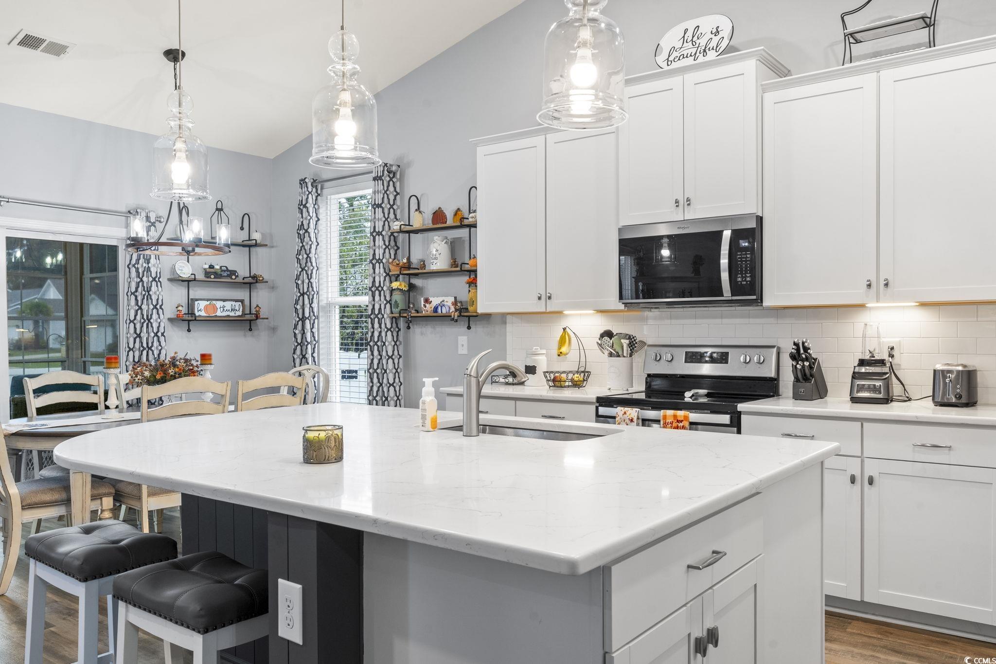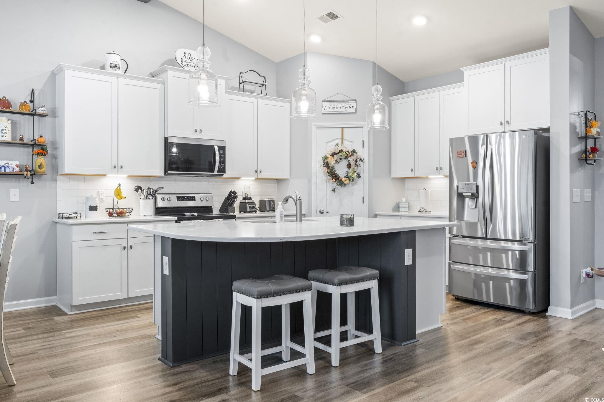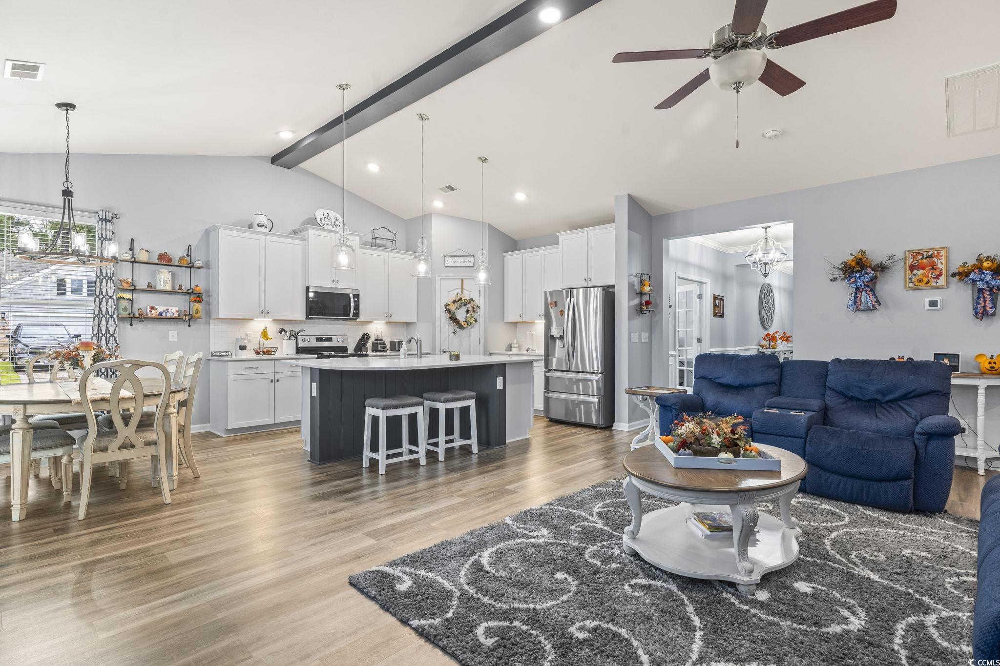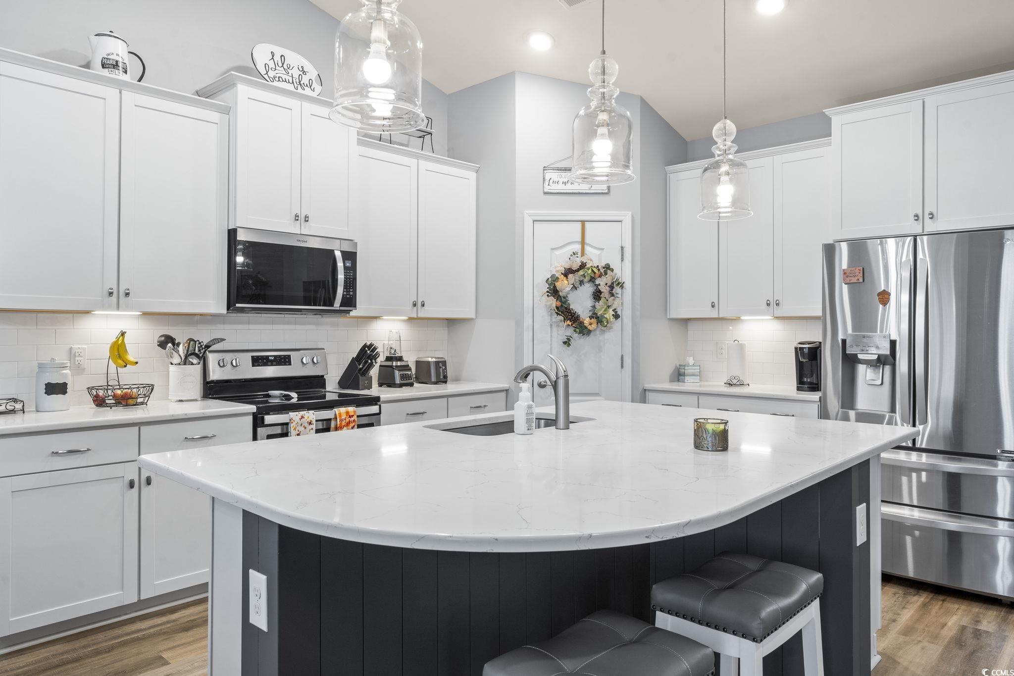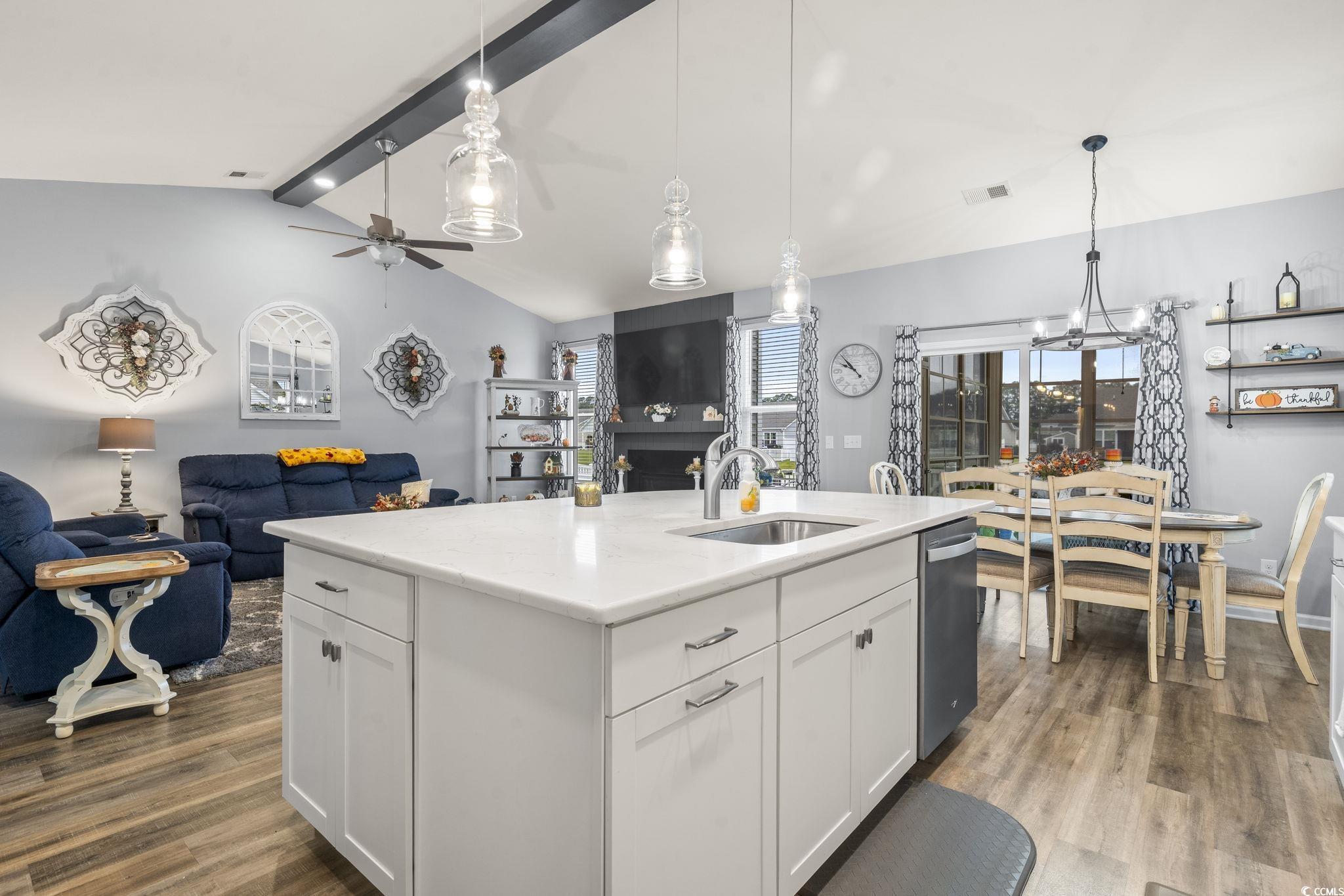 Welcome to this inviting single-story home situated in the desirable Cameron Village community. Designed with an open floor plan, the kitchen flows into the spacious great room, both highlighted by elegant, vaulted ceilings. French doors lead to a flexible room, which can be customized as a home office, playroom, or dining area, offering versatility to suit your lifestyle needs The expansive primary suite is crafted for ultimate comfort and relaxation. It features a stunning bay window that bathes the room in natural light, creating a warm and welcoming ambiance. The en suite bathroom includes double vanity sinks and a generously sized tile shower, presenting a spa-like atmosphere for daily indulgence. This home is enhanced by a selection of premium upgrades. Enjoy the durability and style of luxury vinyl plank flooring in the main living areas, complemented by Quartz countertops, a tiled backsplash and pendant lighting in the kitchen. The custom tile shower adds a touch of luxury, while shiplap accents in the primary bedroom and on the fireplace deliver modern flair. Additionally, a decorative beam with integrated lighting elevates the look and feel of the kitchen and family room. This home has a split-bedroom layout, and the main bathroom is equipped with a newly installed soaking tub complemented by a tiled accent wall. Step outside onto the back porch, designed for year-round enjoyment with Eze-Breeze windows and a tiled floor. This comfortable space is perfect for relaxing or entertaining. The extended patio overlooks a tranquil pond, making it an ideal setting for gatherings with family and friends. This home also features beautiful landscaping with lights. See the complete list of upgrades in the documents section. Residents of Cameron Village benefit from a variety of amenities, including a swimming pool, clubhouse, pickleball and tennis courts, basketball facilities, and a playground. These features ensure that there is something for everyone to enjoy within the community. Conveniently located off Highway 707, this home is just one mile from Route 31. Residents have quick access to local shopping, dining, and entertainment options, making everyday living both easy and enjoyable. REFRIGERATOR DOES NOT CONVEY!