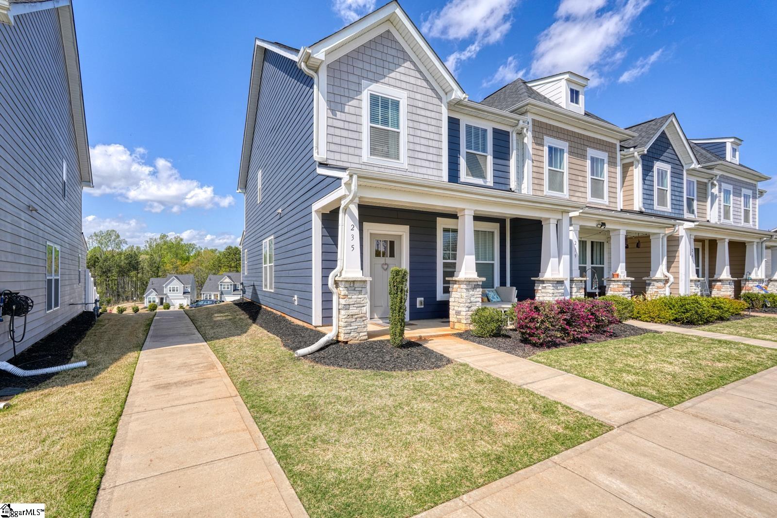 Welcome to 235 Dalmatian Drive in Spartanburg, SC, a well-maintained end-unit single-family home located in the desirable Trailside at Drayton Mills community. Built in 2022, this 4-bedroom, 3-bath home offers an open-concept layout ideal for everyday living and entertaining. The main living area features smooth ceilings, 9+ foot ceiling heights, and abundant natural light, while the kitchen includes solid surface countertops, gas cooktop, and modern appliances. A standout feature is the main-level bedroom, ideal for guests, a home office, or flex space, paired with a full bathroom on the main floor for added convenience. Upstairs, spacious bedrooms include a primary suite with two walk-in closets and a double vanity, offering both comfort and functional storage. As an end unit, the home offers added privacy along with a welcoming front porch and exterior storage. The low-maintenance lifestyle is enhanced by HOA services that include lawn care, trash service, and common area upkeep. Residents enjoy sidewalks, community lighting, and walking trails, with direct connectivity to the Daniel Morgan Trail system, a 50-mile paved urban trail ideal for walking, running, and biking. Conveniently located just minutes from Highway 29 and under 15 minutes to I-85, this home provides quick access to shopping, dining, and daily essentials. Nearby anchors include Mary Black Hospital, Spartanburg Day School, and Spartanburg High School. Zoned for Spartanburg District 7, this location offers strong accessibility and community appeal. Schedule your private showing today.