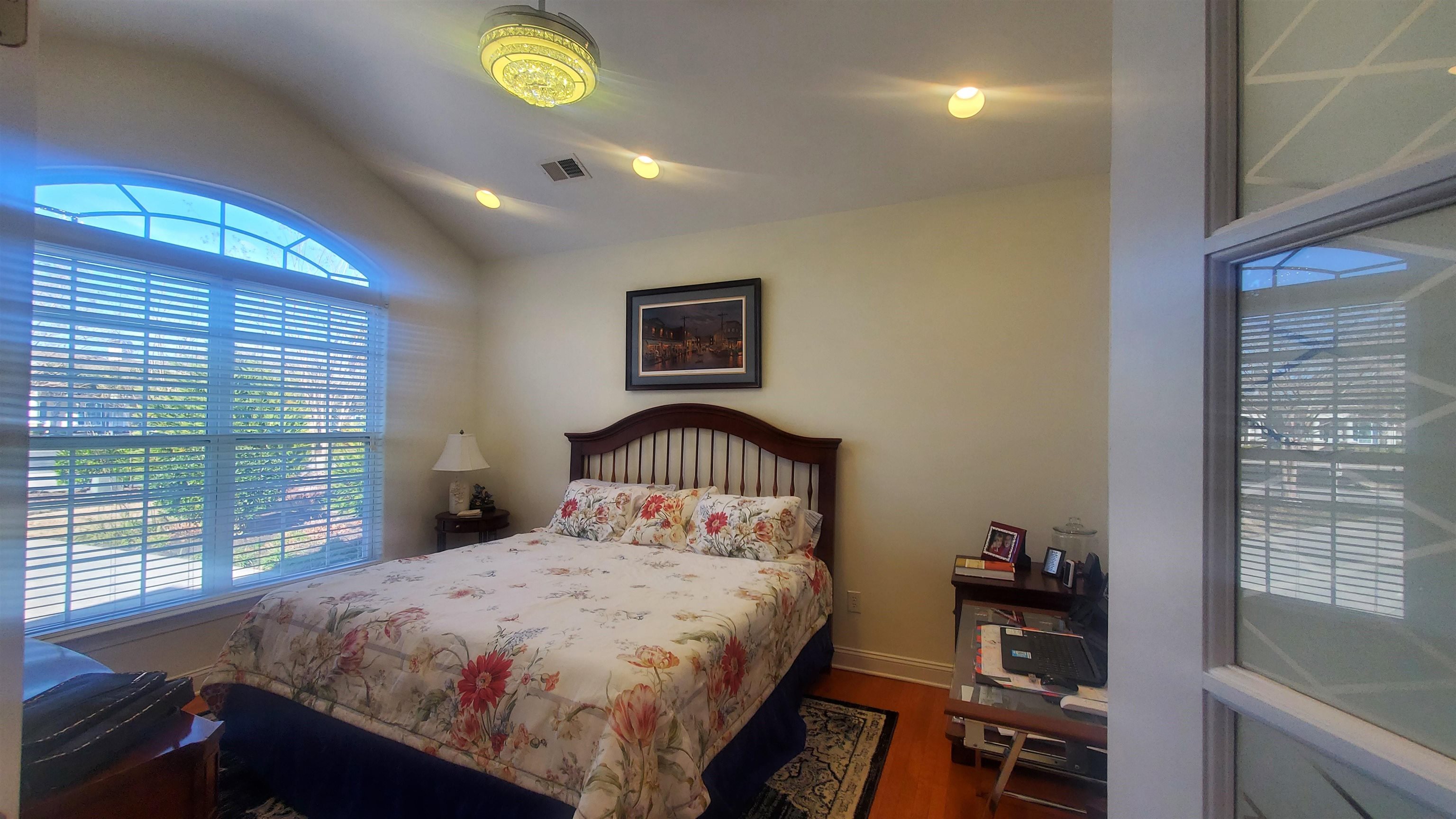 Beautifully landscaped & fountain-lined entrance leads to the gated Saint David's section of Windsor Plantation. This brick front 3BR/3Bath home has it all! Fresh Paint inside & out, Pond view & numerous perennial garden landscaped areas thru-out property. Upgrades thru-out this lovely home include French Doors, Transom, Side-Light & Eyebrow-Arch windows, Cathedral & Presidential Tray ceilings, columns, bullnose corners and extended square footage of climate-controlled Garage, Bonus Room & Kitchen Breakfast Room w/Bay Window. Upgraded Lighting fixtures, ceiling fans, Hardwood flooring, tile & carpet. Kitchen countertops & backsplash have recently been upgraded to Quartz. In addition to the Breakfast Room there is a breakfast bar, pantry & Stainless-Steel appliances. Formal DR with columns & elegant LR, both have 12'ceilings with double trays. French Door from LR leads to custom designed patio overlooking the pond. Primary BR suite with sitting area has Presidential tray ceiling & full Bath with vanity & double sinks and has floor to ceiling tiled Shower with Bench Seat and a large walk-in closet. This split floor plan offers privacy for guests with the 2nd BR & full Bath with additional linen/closet storage in hallway. Just off entry is a large office/3rd BR with French Doors & Cathedral Ceiling. Upstairs is the extended Bonus Room & the 3rd full bath with floor to ceiling tile shower with bench seat. Long driveway allows space for multiple vehicles with courtyard entry to garage. Across the street is the Community Amenity Center with Fitness room, Kitchen, gathering room w/FP, 3 season Porch, Saltwater Pool, Spa Hot Tub & shallow pool with shade water feature as well as a bath house. Windsor Plantation is a natural gas community and close to major roads, golf and entertainment, shopping, restaurants and the beach!