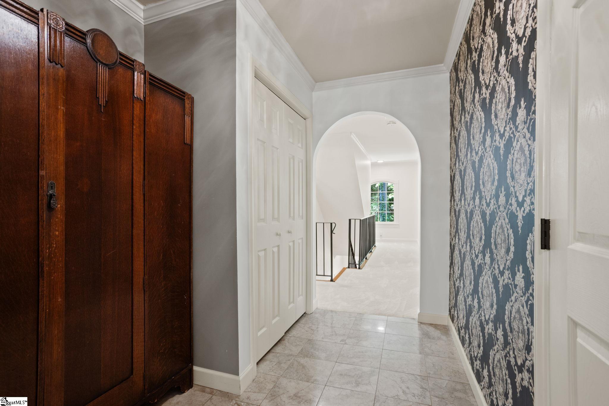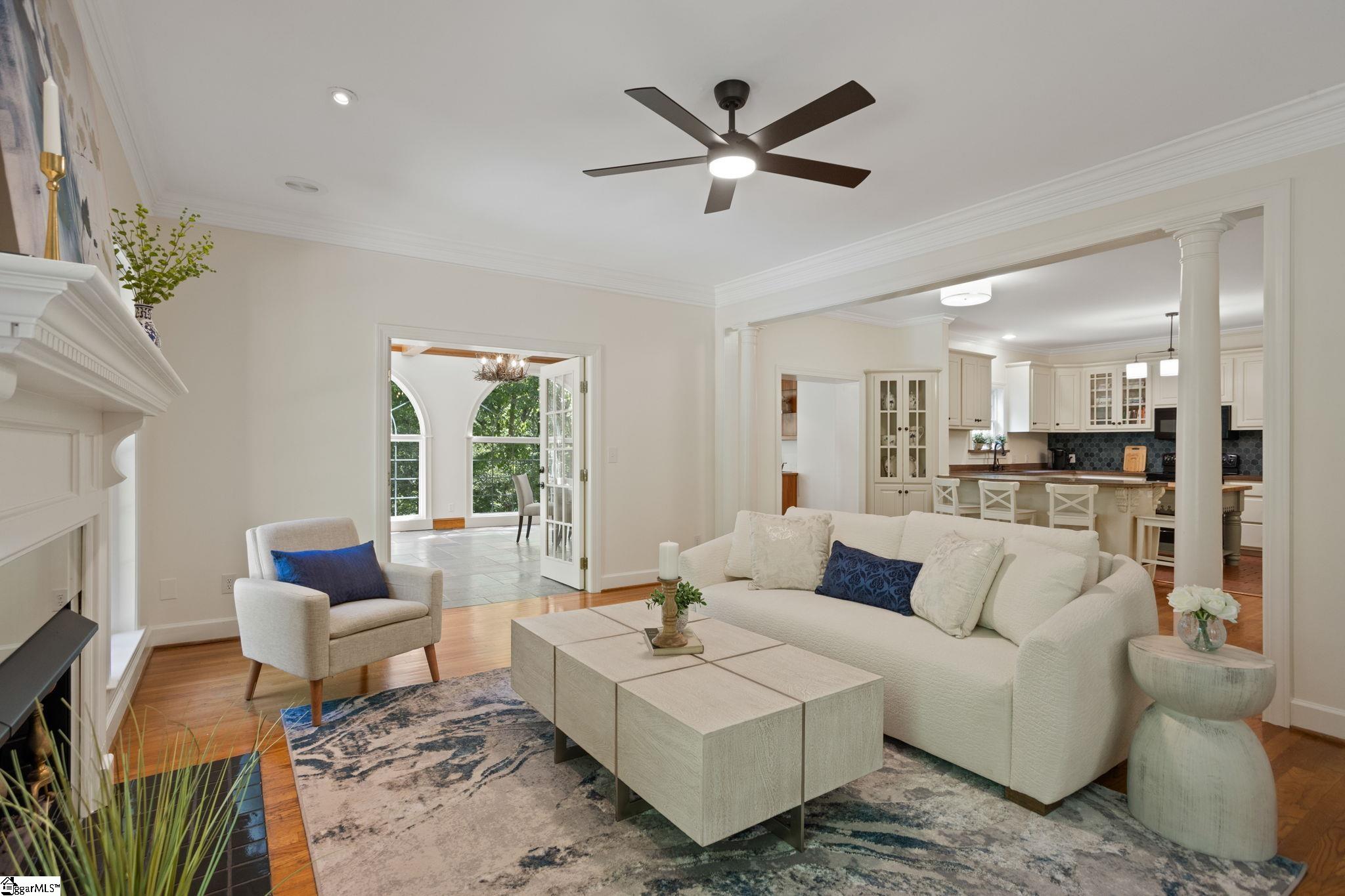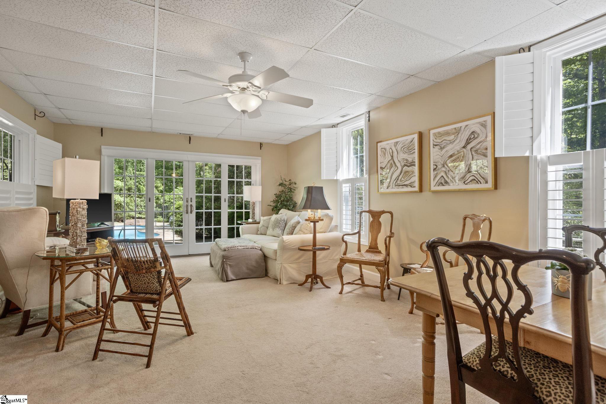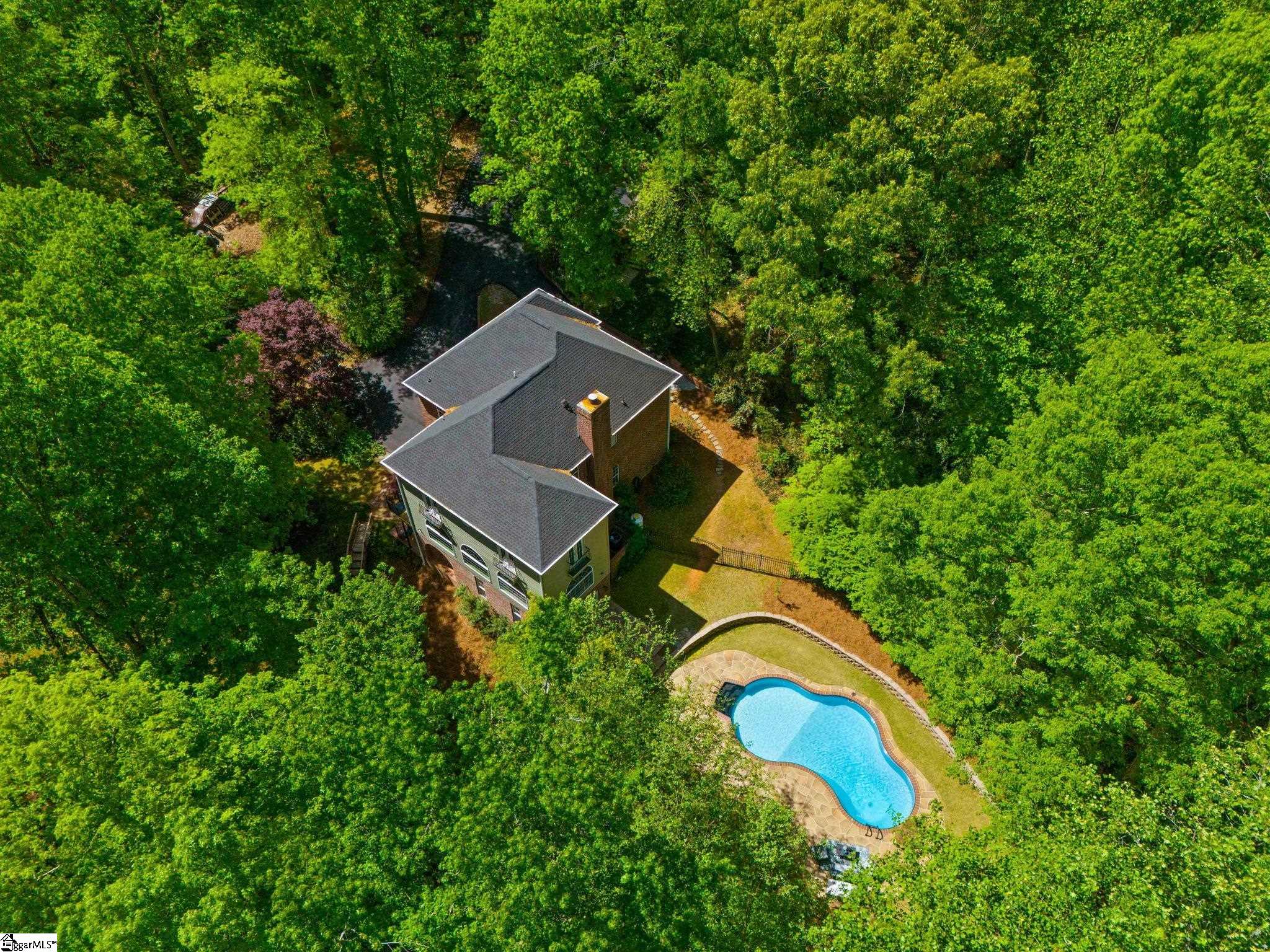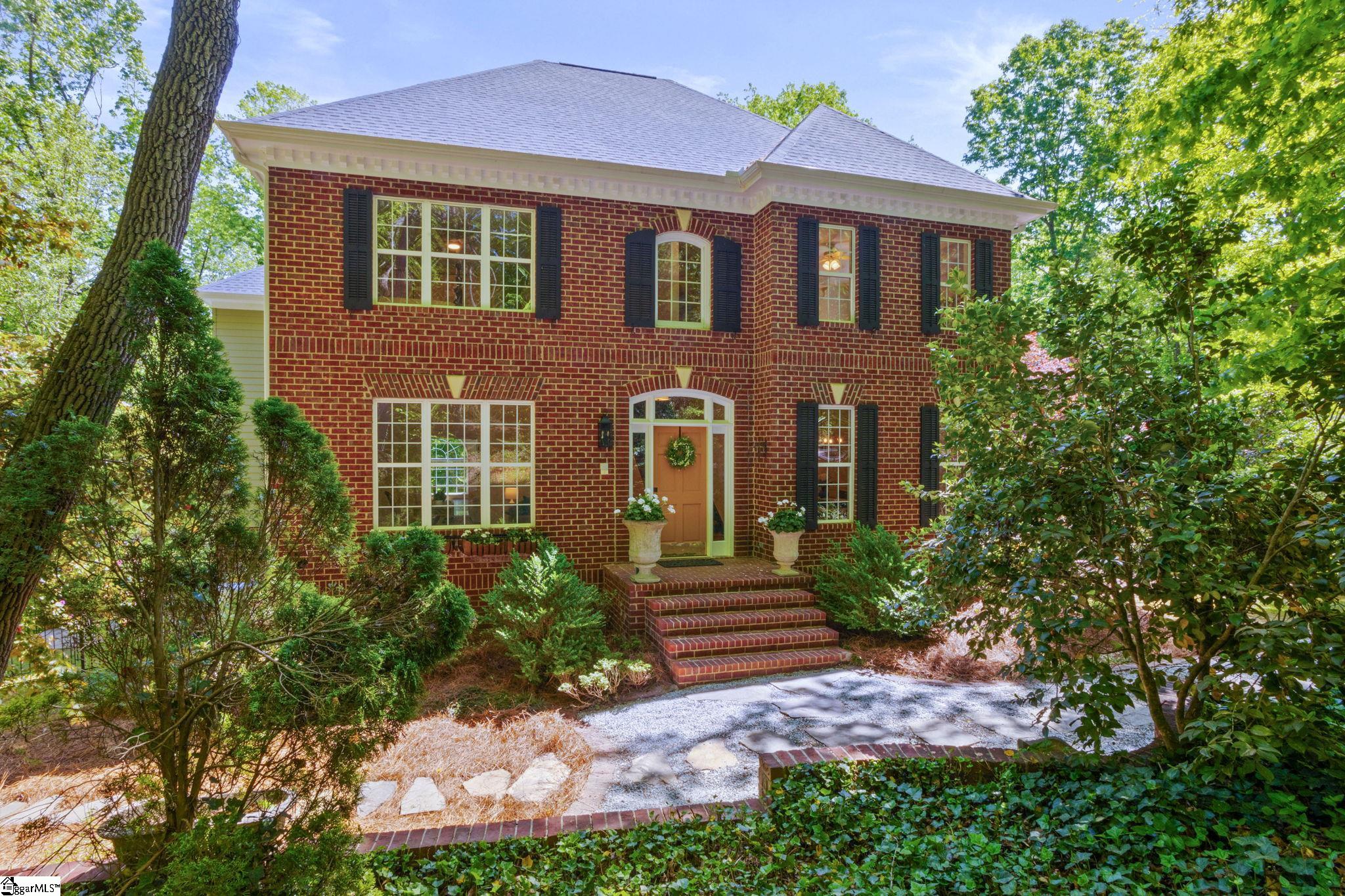 Tucked away on approximately 3.5 private acres just minutes from the heart of downtown Travelers Rest, this all-brick estate offers a rare blend of timeless architecture, refined living, and serene natural surroundings. With over 4,600 square feet, the home is thoughtfully designed for both everyday comfort and exceptional entertaining. A striking first impression leads into beautifully curated interiors featuring hardwood floors, elegant moldings, and an effortless flow between formal and casual spaces. The showpiece of the home is the breathtaking sunroom, where exposed wood beams and dramatic arched windows frame peaceful wooded views, creating a light-filled retreat that feels both grand and inviting. The main level offers multiple living areas, a spacious kitchen with adjoining breakfast space, a formal dining room, and a private office ideal for working from home. The luxurious primary suite serves as a true sanctuary, complete with charming Juliet balconies and a secluded office that connects via a spiral staircase to a library-style space below, adding a unique architectural touch rarely found. Designed with flexibility in mind, the home includes a well-appointed in-law suite and a walkout basement that expands living and entertaining options. Fresh interior paint enhances the home’s crisp, move-in-ready appeal. Outdoors, the property continues to impress with a private pool and expansive grounds that offer both tranquility and room to roam, all surrounded by mature landscaping and natural beauty. Tucked within the woods, a charming firepit retreat with a custom A-frame shelter creates the perfect setting for quiet evenings, or a one-of-a-kind outdoor escape. This is a rare opportunity to own a distinctive, private estate with character, space, and an unbeatable location just under ten minutes from downtown Travelers Rest’s dining, shopping, and outdoor lifestyle.