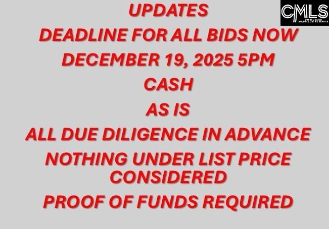 UPDATED! Deadline to submit all bids is NOW Friday, December 19th, 2025, 5PM CALLING ALL INVESTORS! This ALL Brick 2-bed 1-bath Bungalow is ready for your vision to come to life! This is a renovation project that gives you the opportunity to bring this 1930s bungalow back to its original glory with a little patience and time! There are original hardwoods in the majority of the home. There are still charming features just waiting for the right person to bring them to their original glory! There is a gas tankless water heater. The detached one-car garage has shop space to one side and sits behind the home with a side drive entrance. This home is located at the heart of Blossom Street, just a few blocks from the corner of Harden and Blossom, with easy access to 5 Points and USC. This was owned by ONLY one family since the original build. This is an ESTATE SALE; no property disclosure will be provided. CASH ONLY AS IS, with all due diligence done in advance of submitting bid. A Hold Harmless must be signed to show the home. This is a probate estate sale with strict guidelines that must be followed. Disclaimer: CMLS has not reviewed and, therefore, does not endorse vendors who may appear in listings.