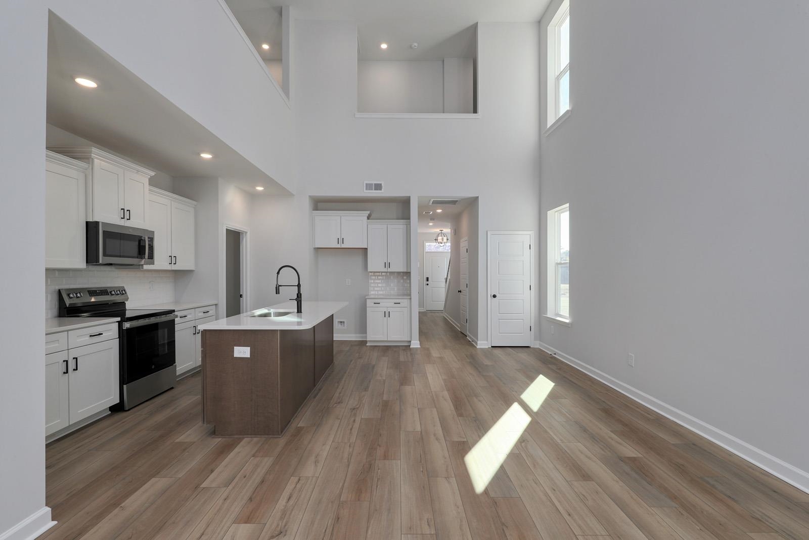Welcome to the Hydrangea! This thoughtfully designed end-unit features three bedrooms, two-and-one-half baths, and a spacious loft. Upon entry, an extended foyer leads into an open-concept kitchen, eat-in area, and great room that is sure to impress. The kitchen sits at the heart of the home and showcases white cabinets with a brown accent island, quartz countertops, a tiled backsplash, and black hardware paired with a GE stainless steel appliance package. The kitchen overlooks the eat-in and great room, which boasts a soaring two-story ceiling that floods the home with natural light. Tucked beyond the great room is the primary bedroom, complete with a tray ceiling and ceiling fan. The en-suite bath features dual sinks with quartz countertops, a tiled shower with glass enclosure, and a walk-in closet. Out back, a covered porch overlooking a private tree line provides the perfect place to enjoy your morning coffee. Upstairs, you’ll find two additional bedrooms, a full bath, and a loft that overlooks the impressive two-story great room. A generous unfinished storage room offers the perfect space to keep seasonal items organized. A laundry room off the kitchen and a convenient half bath under the stairs completes the home. Live a laid-back lifestyle and enjoy all that Murrells Inlet has to offer—just minutes from this boutique new community, Bally Castle!