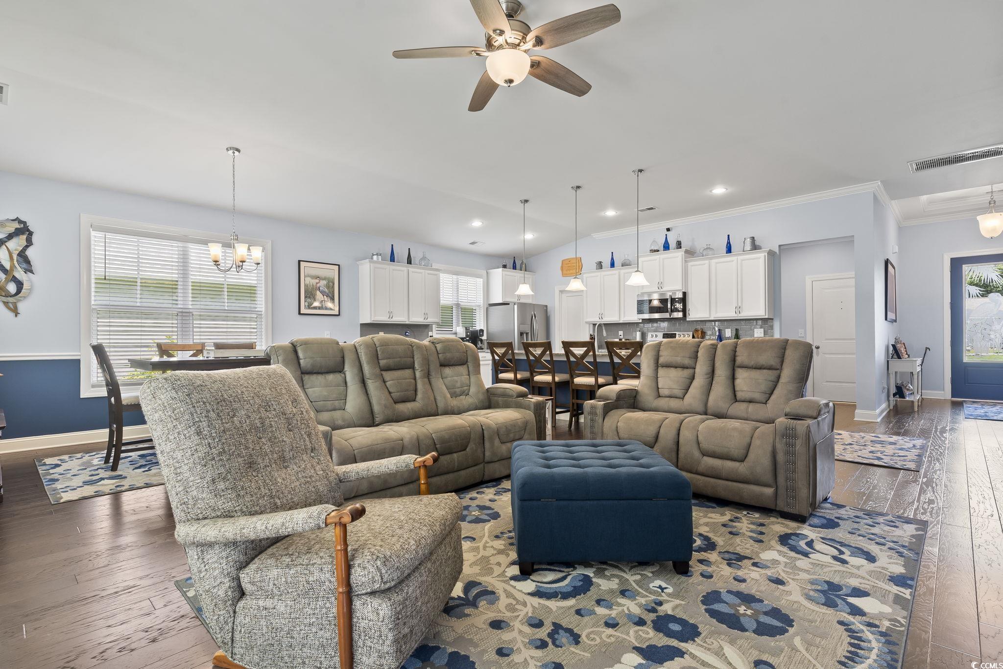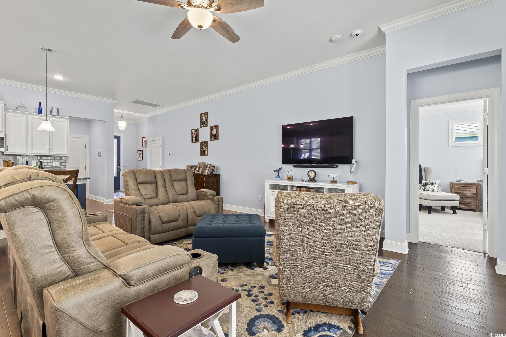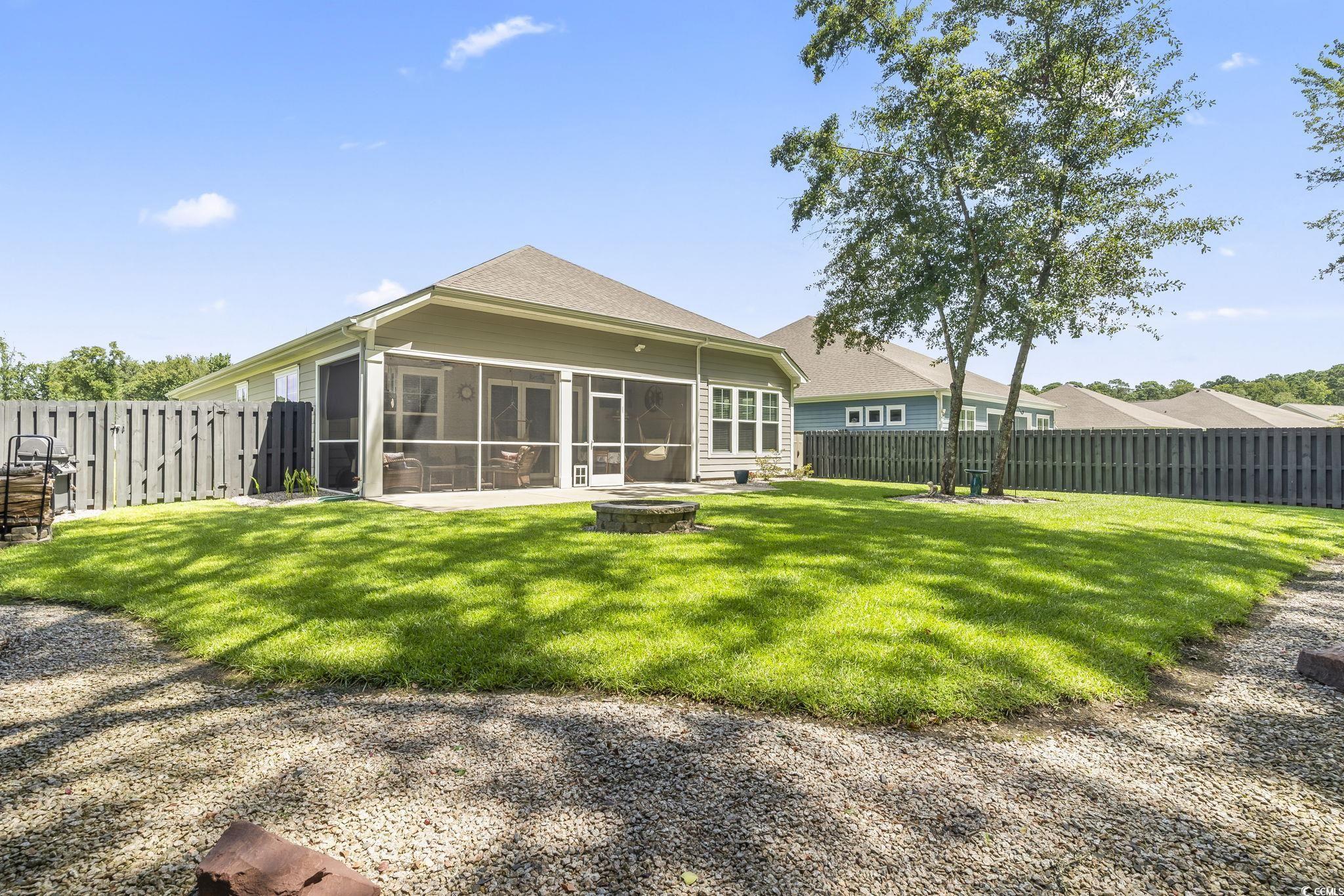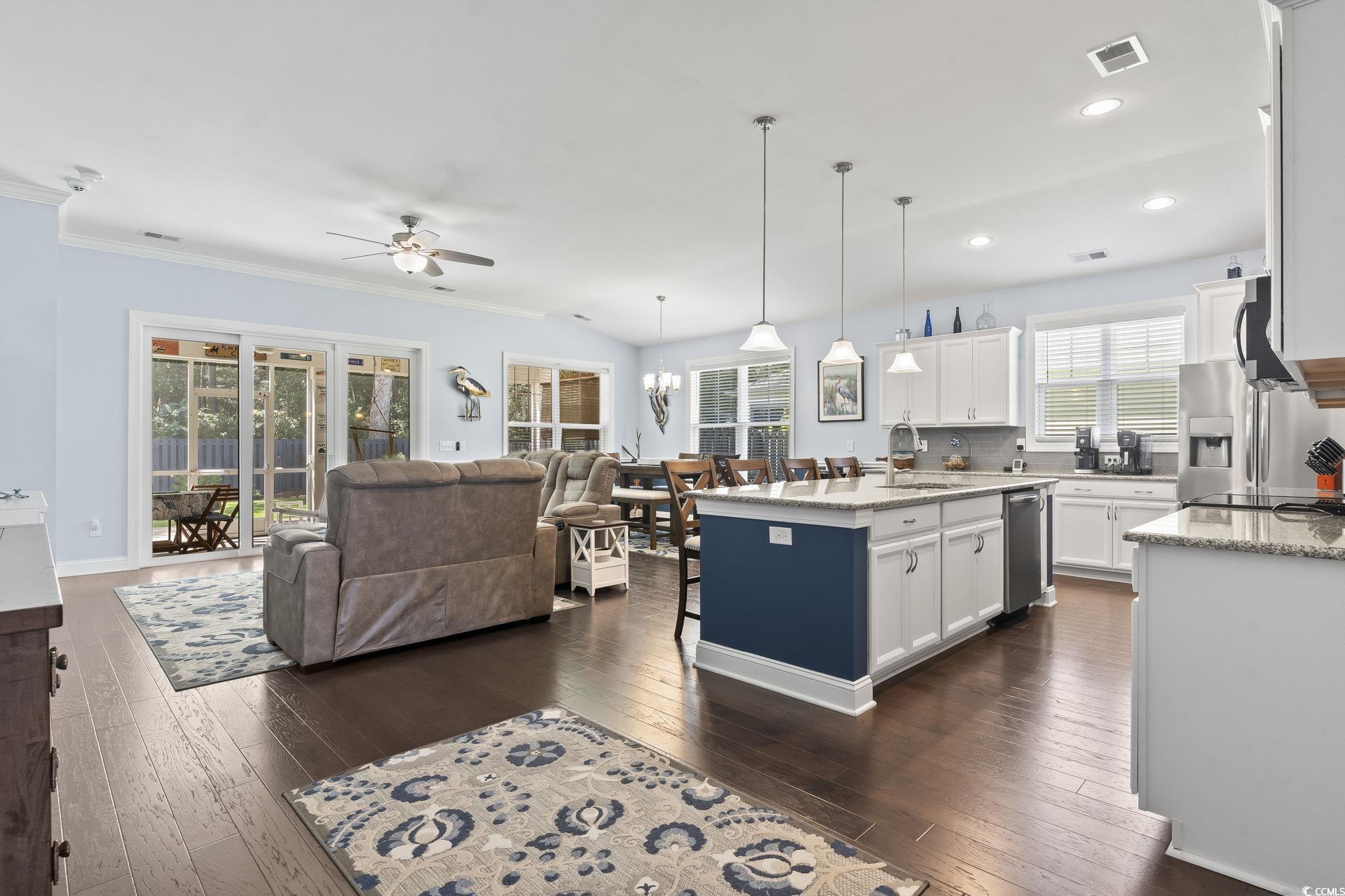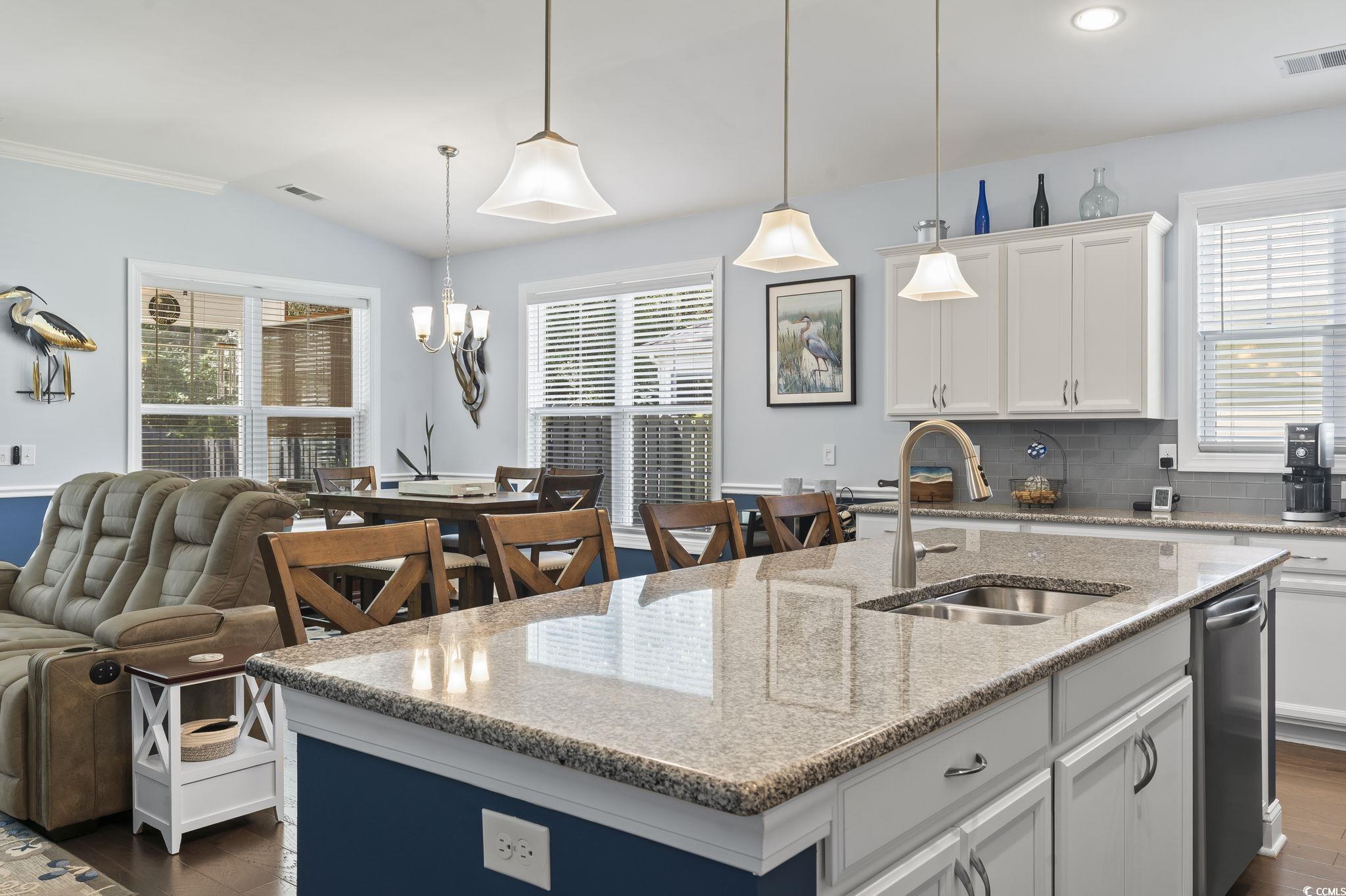 Located in the desirable Hammock Cove community, this single-level home offers a perfect blend of style, comfort, and thoughtful design just minutes from beaches, marinas, golf courses, dining, shopping, and medical facilities. The open concept layout is enhanced by 10-foot ceilings in the main living area and upgraded vinyl plank flooring that flows seamlessly through the primary spaces. The kitchen is both functional and impressive, featuring granite countertops, a large island ideal for gathering, stainless steel appliances, a tiled backsplash, and a generous walk-in pantry. Elegant crown molding, 5¼-inch baseboards, and quality finishes throughout add an elevated touch to the interiors. The owners' suite is a private retreat with a spacious walk-in closet, dual vanities, a 5-foot tiled shower, and two linen closets. Additional highlights include a home pre-wired for a generator, a large screened-in porch, and an extended patio overlooking a private backyard with a wooded backdrop perfect size for that future pool, offering both beauty and privacy year-round. Designed for both everyday living and entertaining, this property provides ample space indoors and out, with room to personalize your outdoor living area or even add a pool. Move-in ready and set in a prime coastal location, it's a rare opportunity to enjoy the best of Lowcountry living. Measurements are not guaranteed. Buyer is responsible for verifying.