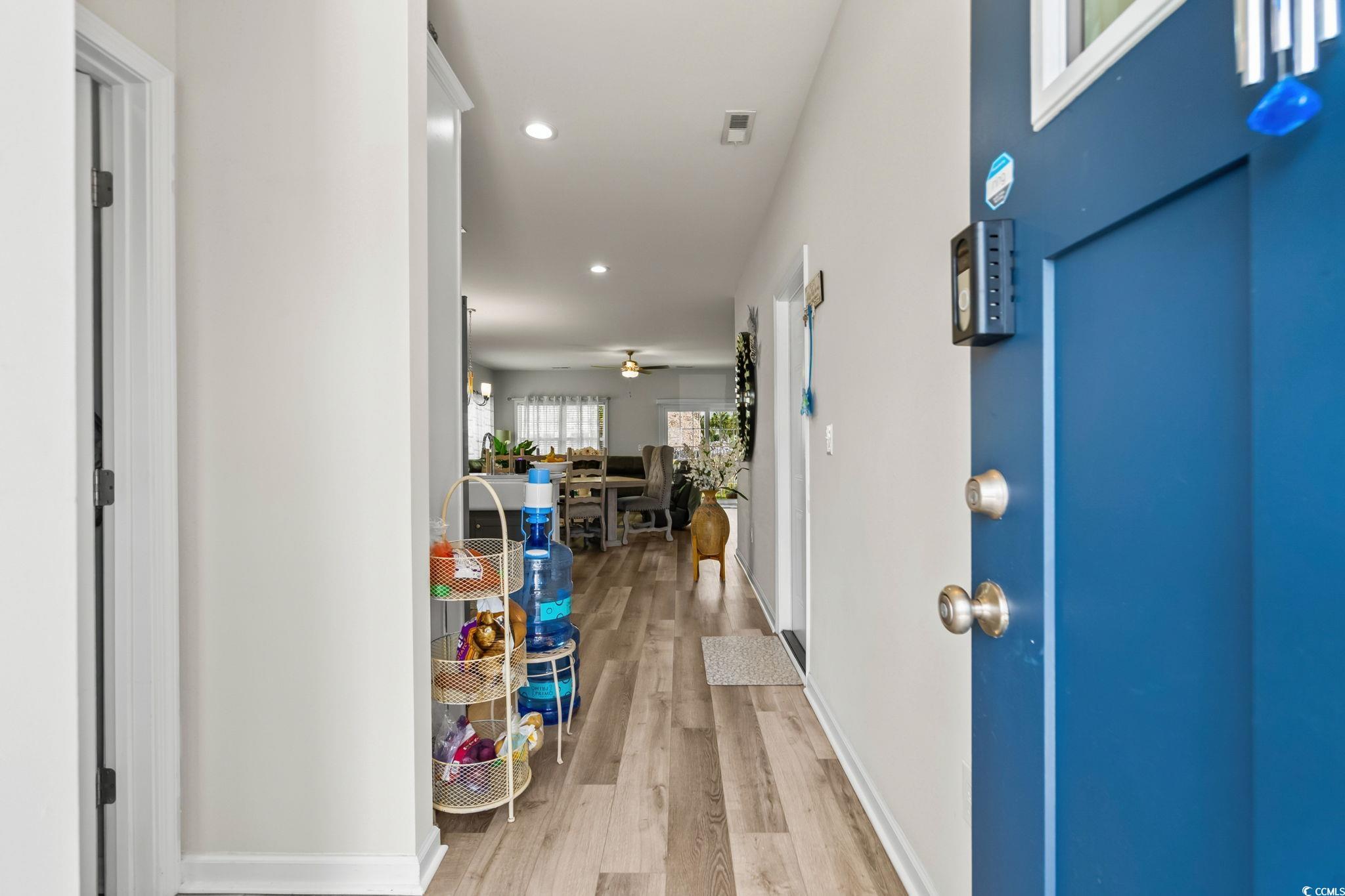 Modern Comforts Near the Atlantic Ocean Nestled just 1.9 miles from the white sandy beaches of the South Carolina coast, and the ever-changing coastline of the Atlantic Ocean, this two-year-old residence offers a unique blend of modern sophistication and coastal serenity. Designed for those who cherish the rhythm of the tides and the need for ocean breezes, the home stands as a testament to the enduring allure of coastal living. Stepping through the front door, you are welcomed by an airy foyer flooded with natural light. The open-concept design immediately reveals the home’s modern sensibility. Wide-plank LVP floors stretch into the spacious living room and the entire 1st floor. The living area flows seamlessly into the dining area, which can easily fit a table for 8—a natural gathering place for family dinners or lively weekend brunches. The efficient kitchen is a cooks dream. Beautiful white countertops and subway tile backsplash gleam beneath recessed lights, and the generous breakfast bar provides both workspace and casual seating. Stainless steel appliances—from the 5-burner gas range to the double-door refrigerator—fit harmoniously into 2 tone cabinetry, white upper cabinets and deep rich blue-gray lower cabinets featuring the quincentennial farm house sink. A walk-in pantry, ensures that ingredients and supplies are always within reach. A large dining area nestled in front of a double window, offers the perfect spot to savor a morning coffee Built with modern technology in mind, this home includes wi-fi garage door, energy-efficient windows and insulation keep the house cool in summer and cozy through mild Atlantic winters. This home’s recent construction allows for the inclusion of the latest building best practices. Enjoy high-efficiency gas HVAC system, tankless water heater and gas range. The home features 3 bedrooms, each thoughtfully designed for comfort and relaxation. The primary suite is a sanctuary, complete with LVP flooring, and ensuite bath with double vanities, a walk-in shower. Two additional upstairs bedrooms offer flexibility with plush carpeting, whether for children, guests, or a dedicated home office. Every room is suffused with natural light. In addition to the master bath, the home includes a full bathroom upstairs and a half bath powder room downstairs for guests. Each is outfitted with modern fixtures and ample storage. The low maintenance backyard is an entertainer’s paradise. A 8x19 ft covered patio extends from the living room, plenty of room for alfresco dining and also stands ready for a hammock! The additional 16 ft. uncovered patio is perfect for grilling and enjoying the warm South Carolina sun. An attached two-car garage offers storage for beach chairs, bikes, and surfboards, ensuring you’re always ready for a spontaneous outing to the ocean. Within a short drive, golf cart ride, or pleasant bike ride, you’ll discover a charming seaside community, fresh seafood restaurants, and amazing cafés. The local schools are highly regarded, making the area popular with families as well as retirees drawn to its easy pace and scenic beauty. Being just 6 minutes from the Atlantic Ocean, the beach is both a daily backdrop and a constant invitation. Early risers will relish morning jogs along the surf, while sunset promises a magical show of color and light. Whether you’re an avid surfer, shell collector, or simply love to stroll barefoot along the shore, the Atlantic is always close enough to shape your daily life. Lovely landscaping completes the picturesque comfort and beauty of this home.