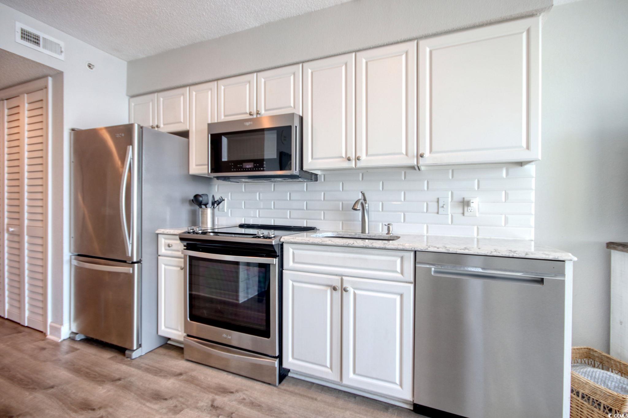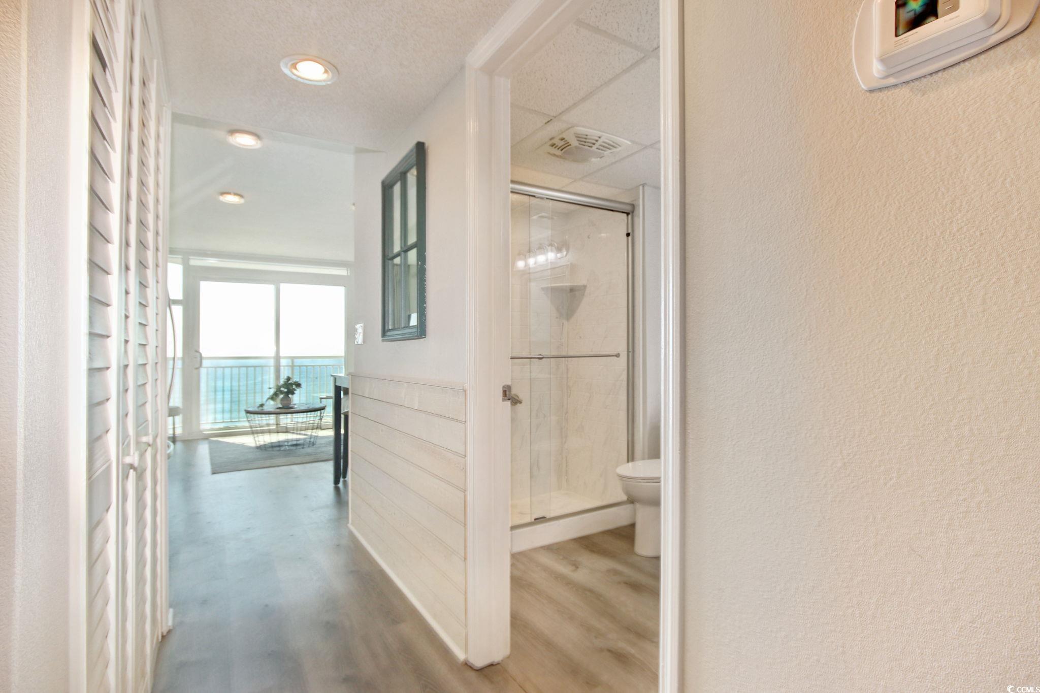 This uniquely and beautifully remodeled 1-bedroom 1-bath ninth floor ocean-front condo is ready to be your perfect permanent residence, second home or investment property. This immaculate unit has been the primary residence of the owners for several years, and it has been remodeled and maintained to provide maximum comfort and storage. Entry into the building from the attached parking garage is through secured doors into climate-controlled foyers and hallways. Carts are available so you can easily transport your belongings to the 9th floor. Upon entry into the unit, you are immediately greeted with an amazing view of the ocean. The oceanfront living room wall is floor to ceiling glass with a sliding door onto the balcony, and the oceanfront building's closeness to the beach affords views from the condo as good or better than any on the Grand Strand. Inside the condo, the owners have completed many upgrades, and a complete list is in the associated documents. Highlights include: LVP flooring in the LR, DR, bathroom and hallway; new carpet in the BR; fresh paint throughout; SS Whirlpool appliances purchased in 2018; white subway tile backsplash; quartz kitchen countertop; and shiplap wood paneling in the hallway. In the kitchen/dining area, the original Murphy bed was removed and replaced with a large pantry. The bathroom was totally updated in 2022 with a new bathroom vanity and Carra marble top, lighting, mirror and beautiful walk-in shower. The stacked W/D was purchased in 2020, and the HVAC system (Carrier) was installed new in 2021. A wall-to-wall large closet was added to the bedroom, and heavy-duty wood shelves were installed in the owners' security closet. The bedroom also has a third closet, so there is as much storage available as possible in a 1-bedroom condo. The Holiday Sands @Southbeach property has a lot of amenities to enjoy, and your master deed authorizes you to also use the amenities at the next-door Holiday Sands South hotel. The amenities include indoor and outdoor pools, indoor lazy river, indoor kiddie pool, two hot tubs, well equipped exercise facility, and oceanfront lawn with loungers, tables and chairs. The building has a gated attached garage, and the owner of this unit is allocated one parking spot. Holiday Sands @ Southbeach is conveniently located within 5 minutes of the MB International Airport, and very short drives to Market Common, Coastal Grand Mall and a host of other entertainment, grocery, restaurant and shopping venues.