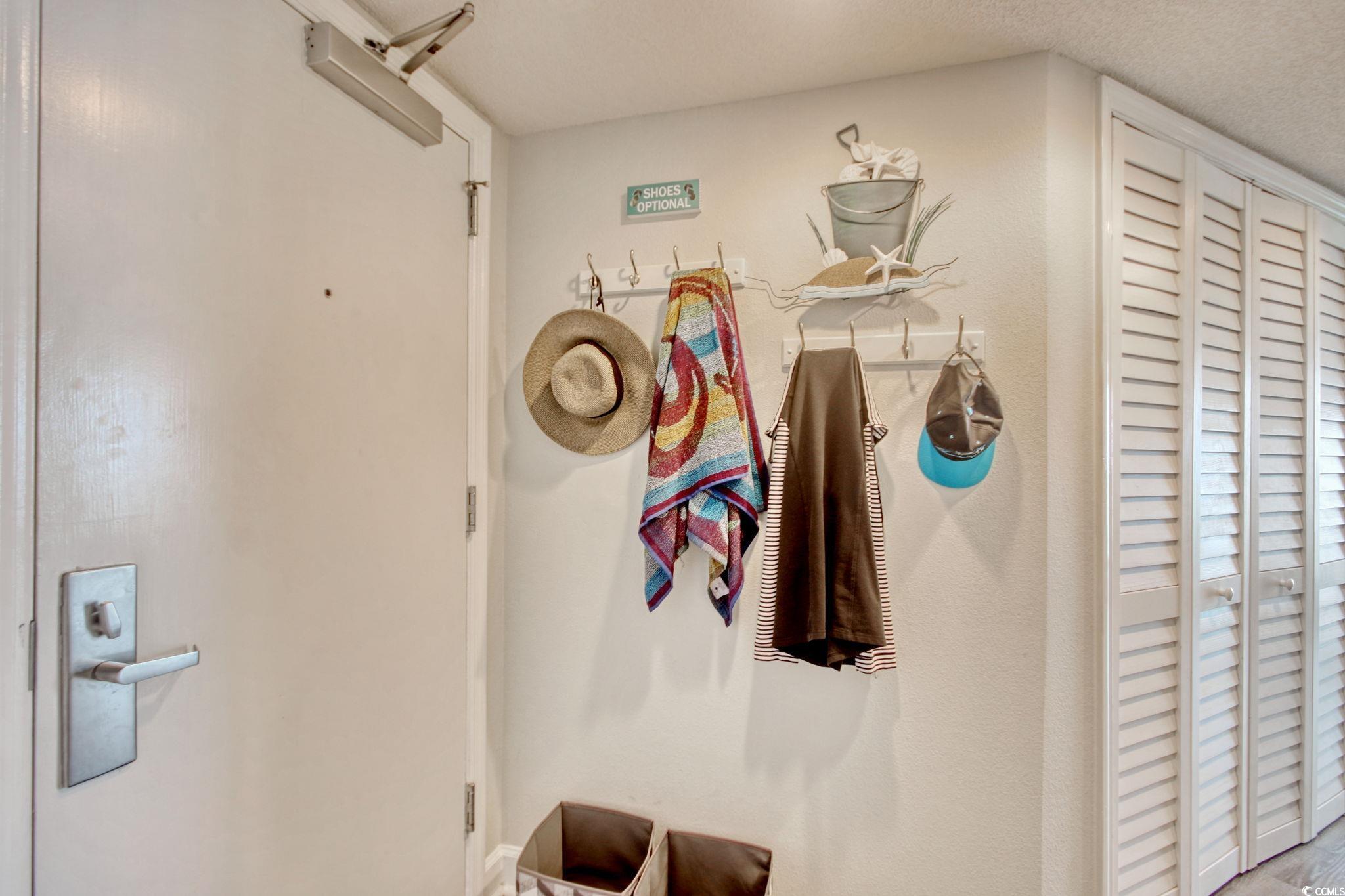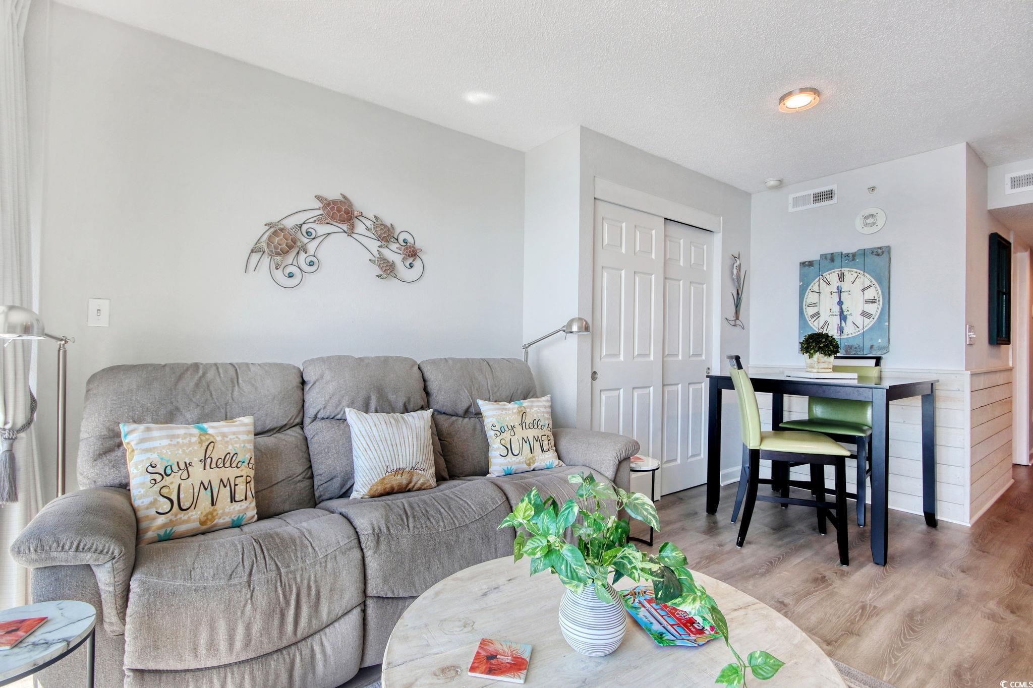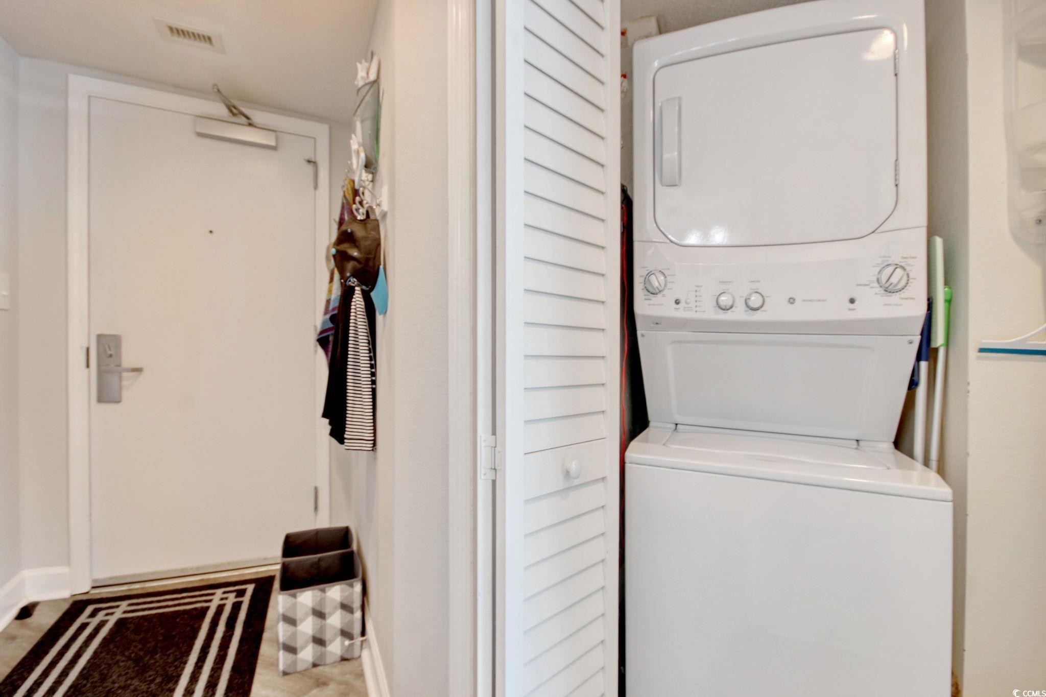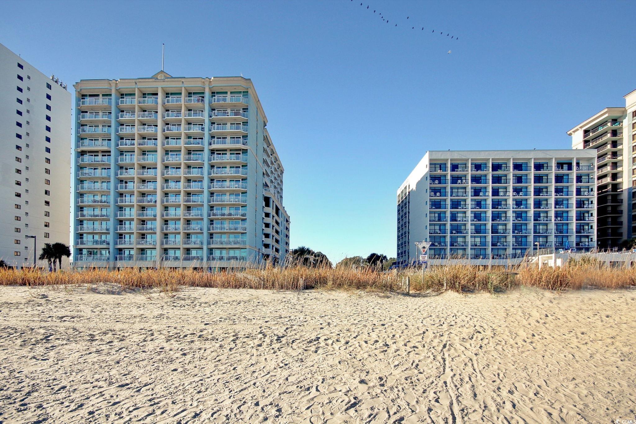 MOTIVATED SELLER! Original owners of this completely upgraded oceanfront 9th-floor unit. Beautifully remodeled to provide maximum comfort, style, and storage. Upon entry, breathtaking ocean views immediately captivate through the floor-to-ceiling sliding glass doors in the living room. UPGRADES include luxury vinyl plank flooring, stainless steel appliances, quartz countertops, subway tile backsplash, and a fully renovated bathroom with walk-in shower, new vanity, and toilet. Additional improvements include HVAC system (2021) and stacked washer/dryer (2020). An abundance of custom closets throughout, including two lockable closets in the bedroom, provide excellent secure storage. The building features an attached gated garage, interior hallways, and four elevators for convenience. Resort-style amenities include indoor and outdoor pools, hot tub, lazy river, and kiddie pool. Ideally located near Myrtle Beach Airport, Market Common, Coastal Grand Mall, and more.