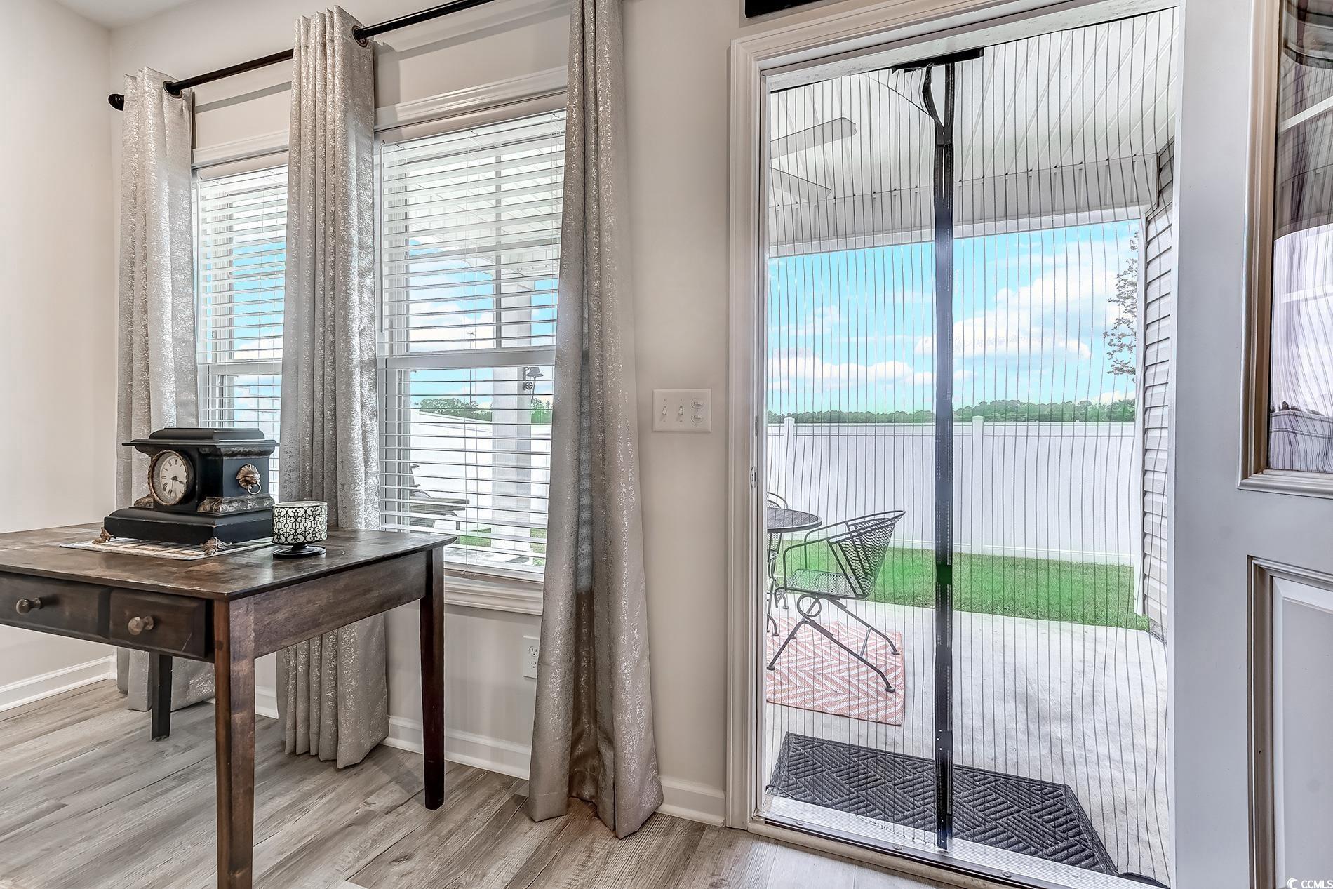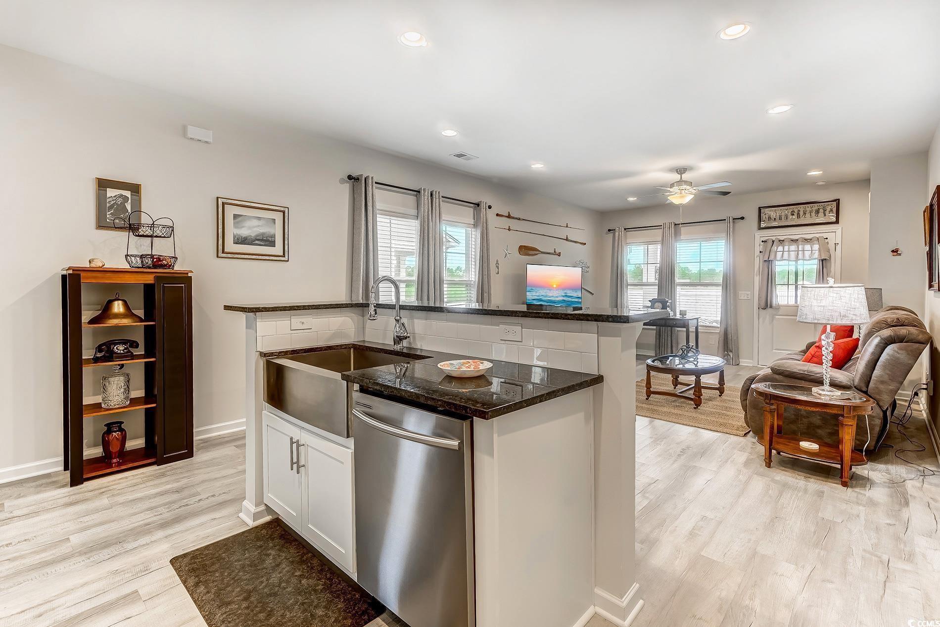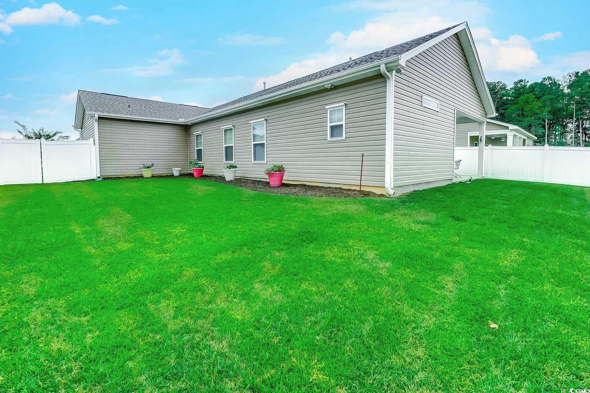 Like a new, well-maintained and immaculate 3-bedroom, 2-full-bath home that has all the costly extras already done and is move-in ready. Set in the quaint and quiet Timber Ridge subdivision, with some of the lowest HOA dues. This home has hurricane shutters, LVP floors throughout the home. Gutters and privacy fencing all very expensive upgrade and all done. Inside, there's an open floor plan, with granite in all bathrooms and the Kitchen, along with an farmhouse sink, beautiful Stainless-steel appliances, and window treatment. a tray ceiling in the primary bedroom, a spacious walk-in closet, and bathroom .The home flows out to a covered porch. There is a laundry room with cabinets and counter space along with a tons of closets, and storage throughout. The primary bedroom, a spacious primary bath with an easy walk-in Shower. This home was built by Great Southern Homes, 2024 builders of the year! in Myrtle Beach, known for their green building and upgrades like on-demand hot water and lawn irrigation. The seller has only lived here 2 to 3 months out of the year. This home is must-see.