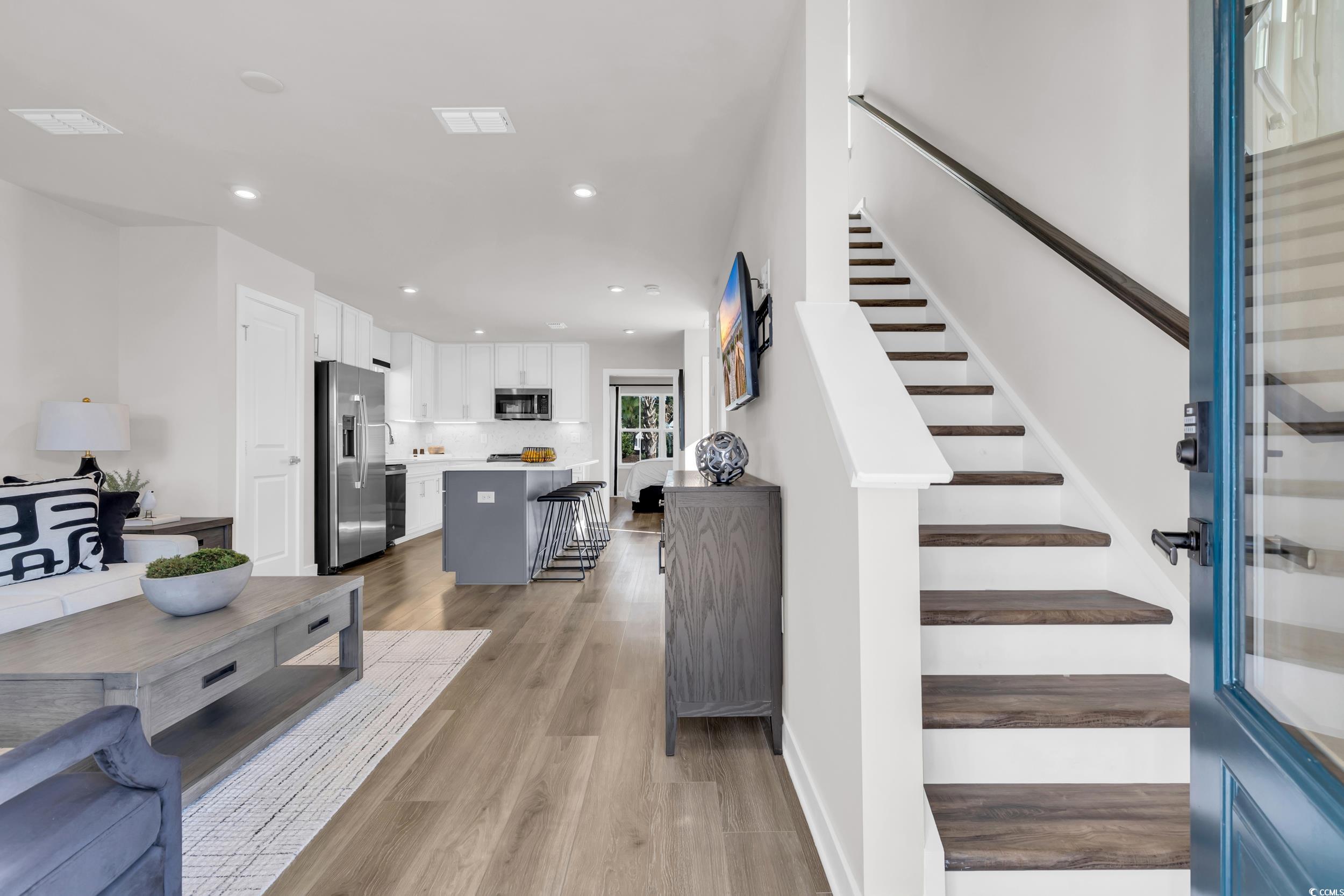 Located in Grande Dunes North Village, a gated community along the Intracoastal Waterway, this beautifully designed home offers the ultimate Grande Dunes lifestyle. HOA includes lawn care, pools, playground, clubhouse, and access to the exclusive Ocean Club with private oceanfront dining, beach service, and resort-style pools. Residents also enjoy the nearby Members Club, public Resort Golf Course, Anchor Café, and Grande Dunes Marina. This 3 bedroom, 2.5 bath cottage-style home has never been occupied and was previously used only as the builder’s model. The first floor features the primary suite with private bath, a bright open living area, and fully furnished spaces including sofa, dining table, barstools, beds, bedding, window treatments, washer, and dryer. Upstairs, you’ll find two additional bedrooms and a full bath. The home sits on a .14 acre lot with a paver-lined driveway and detached rear garage. This property is move-in ready, never lived in, and perfectly located in one of Myrtle Beach’s most prestigious areas.