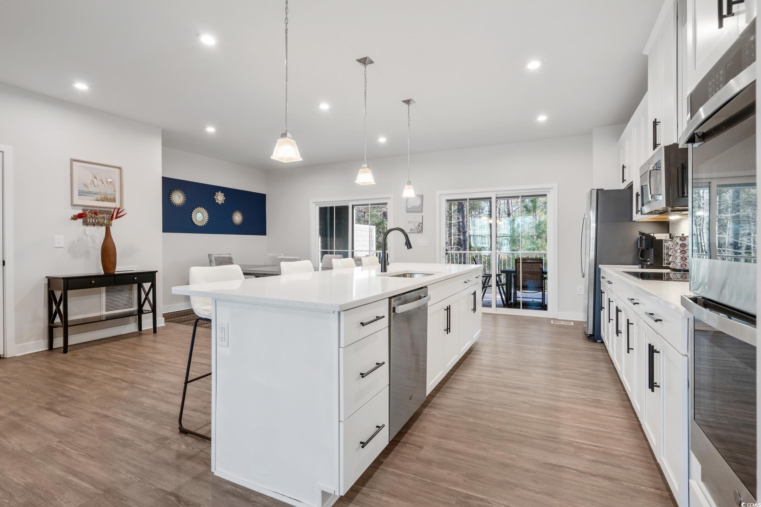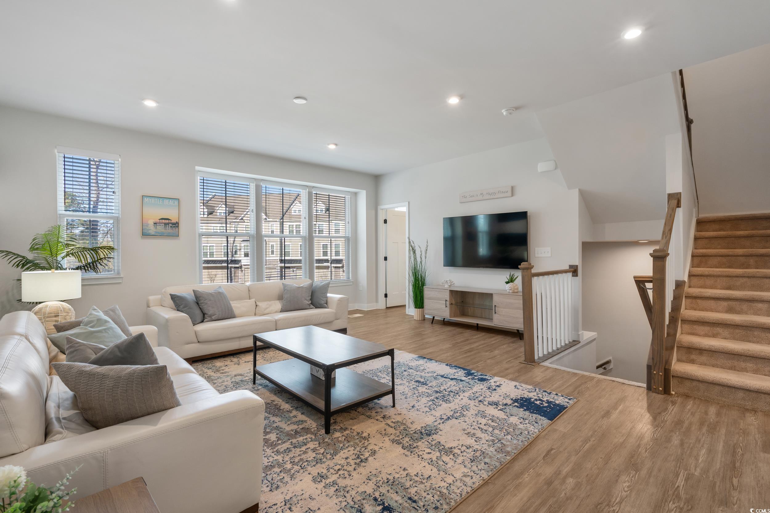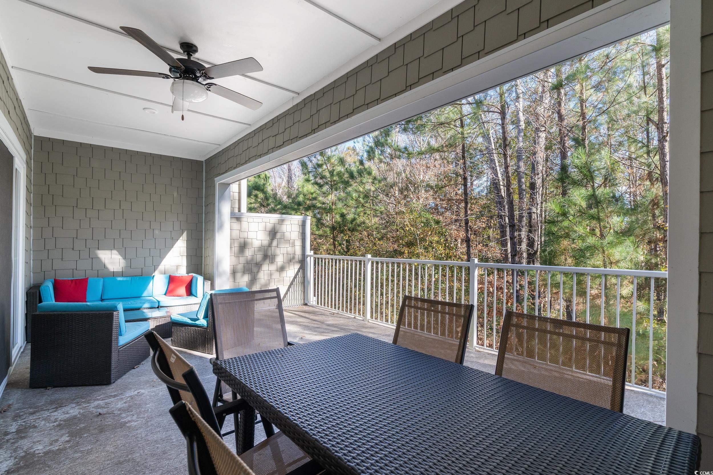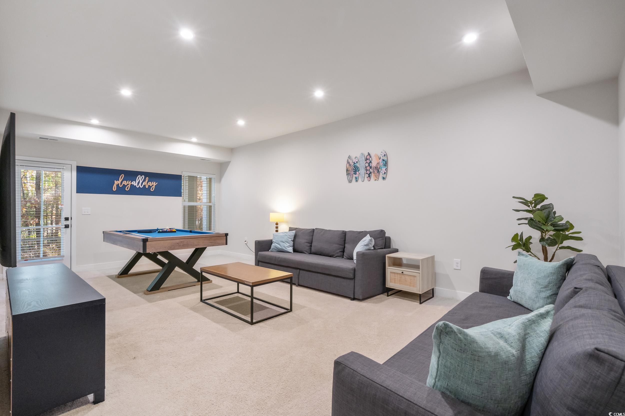 Welcome to the Dye Estates Townhomes, a prestigious gated community located in the Barefoot Resort area in North Myrtle Beach. This 4 bedroom, 3.5 bathroom townhome style condo with bonus room is perfect for a primary residence or second home. This unit also comes completely furnished with modern furniture and decor, just bring your suitcase and golf clubs! This condo is ideally positioned right next to the Dye Golf Course, allowing golf enthusiasts to enjoy convenient access to their favorite pastime. Imagine the convenience of taking your personal golf cart and cruising to the course within minutes. Inside, the unit provides ample space and comfort for everyone, with over 2600 heated sq ft of living area. The open floor plan of the main living area seamlessly combines the living room, kitchen, and dining area, offering plenty space for group gatherings, and a conveniently located half bathroom. The kitchen features modern white cabinets with black hardware, stainless steel appliances, a double wall oven, and a beautiful tile backsplash. Off of the kitchen you will have access to an oversized private balcony facing the lush landscaping, with room for an outdoor dining area and lounge space. The top floor of this home encompasses the primary suite along with two additional bedrooms, a full bathroom with dual vanity sinks, a tiled tub/shower combo, and a laundry room with full size washer and dryer. The primary suite features a large walk-in closet, and a spacious en suite bathroom with dual vanity sinks, tile shower and separate water closet. The lower level of this home includes a bonus room that could function as a fourth bedroom, and includes two sleeper sofas, a pool table, and a full bathroom with tile shower. This room also has access to a screened in porch at the rear of the home leading to outdoor space that backs up to trees. This unit also comes with a 2 car garage perfect for storing a golf cart, and a driveway for additional parking. As an owner in Barefoot Resort, you will have access to a beautiful oceanfront cabana and a swimming pool located nearby. This condo is perfectly situated to explore North Myrtle Beach’s best attractions including the beautiful Atlantic Ocean, Barefoot Landing, shopping, dining and entertainment. Short Term Rentals Welcome! Schedule your tour today!