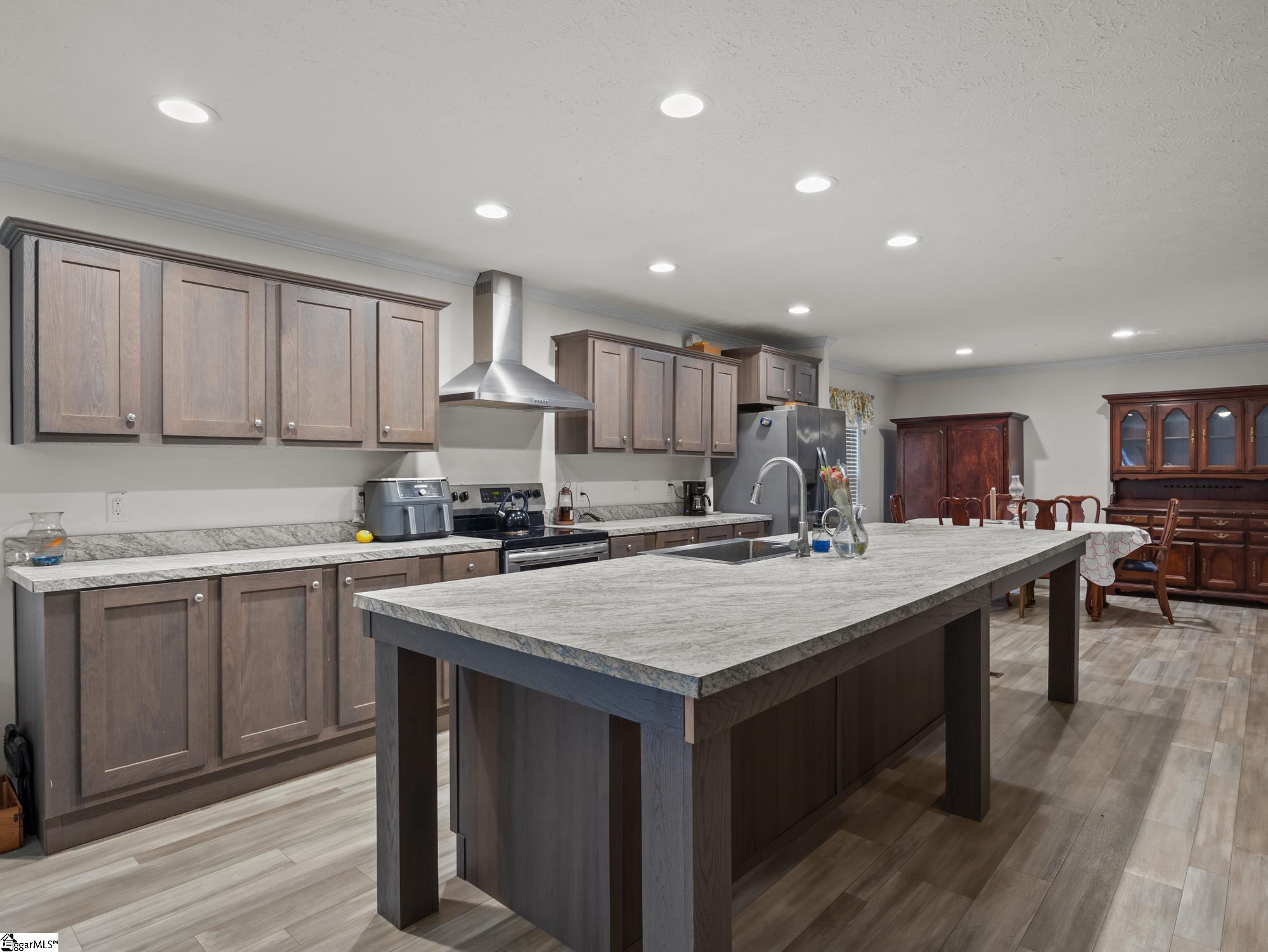 Escape to the quiet life without sacrificing convenience. This 4-bedroom, 2 full bathroom home, spanning over 2,000 square feet sits on just over a one-acre lot with a permanent foundation and classic brick underpinning. Stepping onto the cozy front porch made for rocking, through the front door, you will be welcomed by a large living room that flows seamlessly into the kitchen designed for entertaining. The focal point of the kitchen is the expansive island large enough to comfortably seat 8. Off the kitchen you will find a den overlooking the private back yard. A perfect space for a second living room, home office, or media/gaming room. The possibilities are endless. This home has a split floor plan providing privacy, with the Primary on one side of the home and the other 3 bedrooms on the opposite side. The spacious primary features a walk-in closet, as well as full size bathroom with a walk-in shower that goes from the floor to the ceiling, and a double sink vanity. For the outdoor lovers the back porch spanning 49' allows plenty of room for grilling, lounging, and enjoying nature. With no HOA and an acre of land, you have the freedom to truly make this property your own.