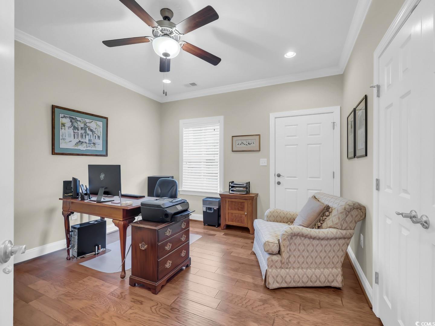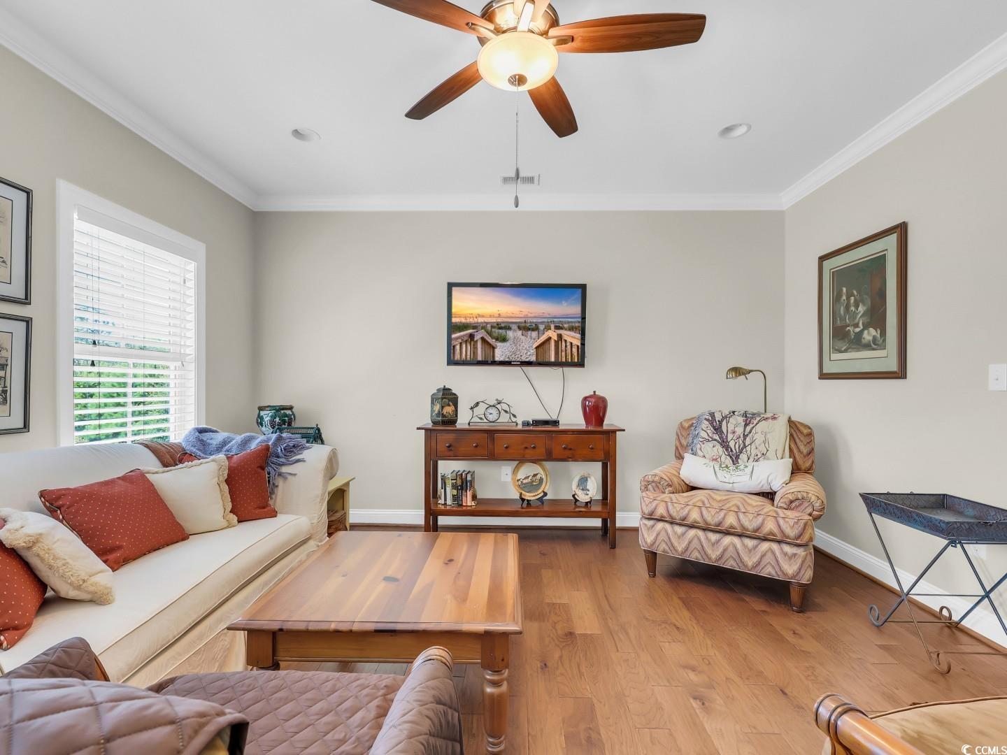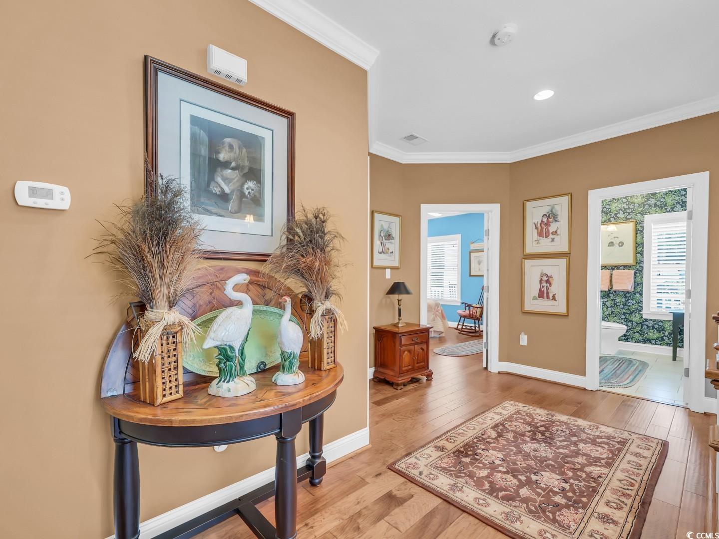 Welcome to Litchfield Plantation, a gated Lowcountry community where a brick and wrought-iron entrance opens onto a live oak-lined avenue. Tucked on a quiet cul-de-sac and surrounded by mature, garden-like landscaping, this home radiates timeless Southern charm. The main floor blends living, dining, and kitchen areas into a warm, open space anchored by a cozy fireplace and rich hardwood floors. From the kitchen, step onto a large wraparound porch with a sitting area, perfect for morning coffee, alfresco dining, or evenings enjoying coastal breezes. A serene primary suite with a spa-like bath, a half bath, large laundry, and an oversized two-car garage complete the main level. Upstairs, three bedrooms or two plus a flexible bonus room share a full bath with a large tile shower, and each bedroom opens to the wraparound porch, offering peaceful retreats. Residents enjoy a pool tucked among historic rice fields and a private Pawleys Island beach house, blending Lowcountry serenity with coastal living. Embrace Lowcountry living and make this beautiful home your own.