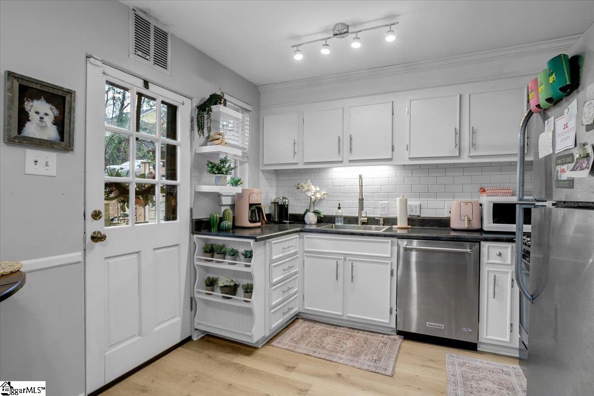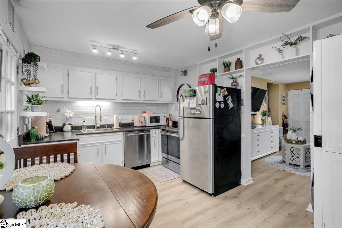 Charming 2 bedroom and 1 full bath in the Augusta Road area! ULTIMATE location off of E. Faris near the Swamp Rabbit Trail, Cleveland Park, Augusta Road, Greenville Technical College, Greenville Memorial Hospital and Caine Halter YMCA. Easy access to Downtown Greenville, S. Pleasantburg Rd, Laurens Rd and I-85. Newly installed luxury vinyl flooring on first/second floor and carpet on the stairs. Kitchen updated in 2021 and bathroom updated in 2022. Relaxing 9x10 deck with built in seating. Come check out 26 Faris Circle and be part of the Augusta Road area at a great price!