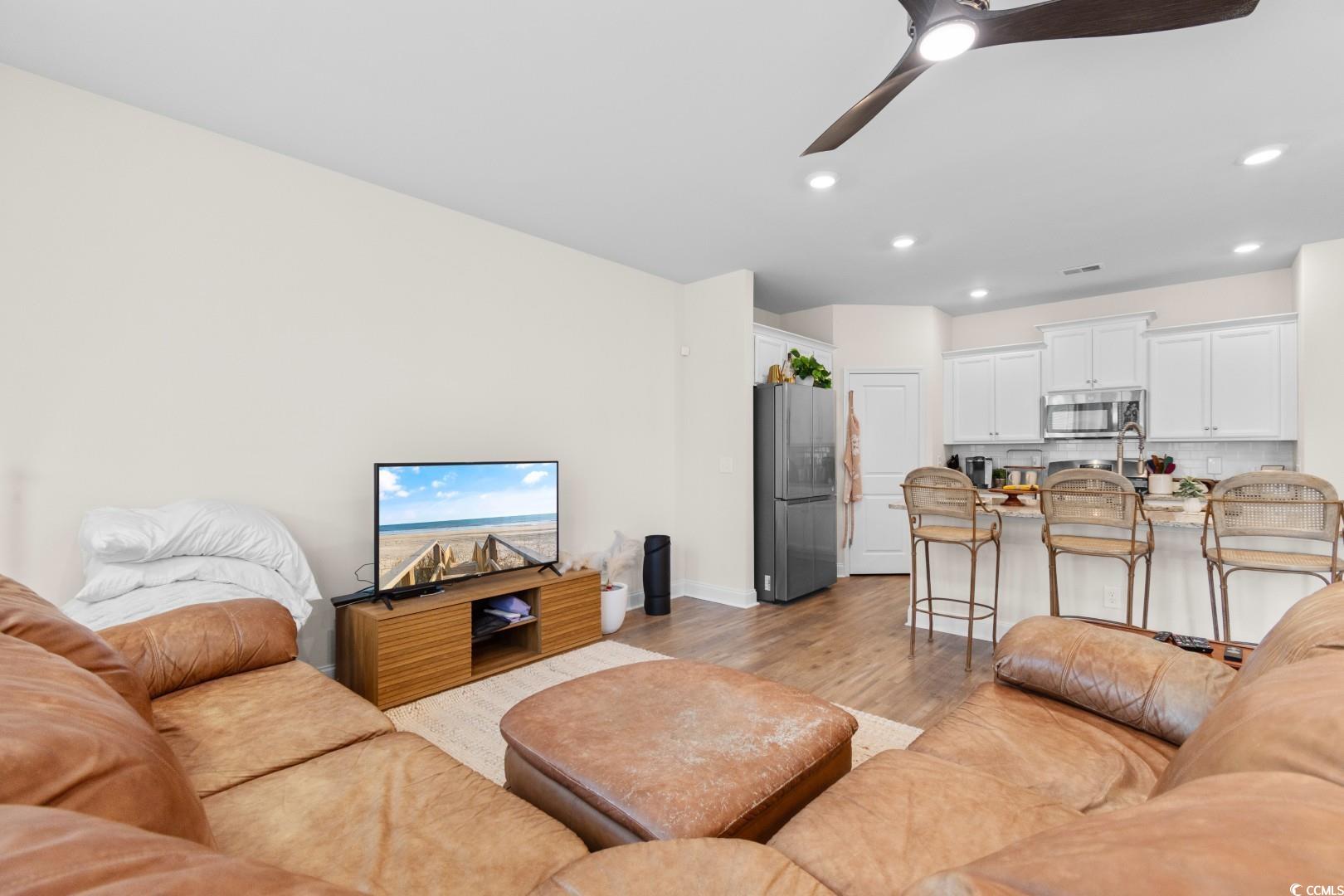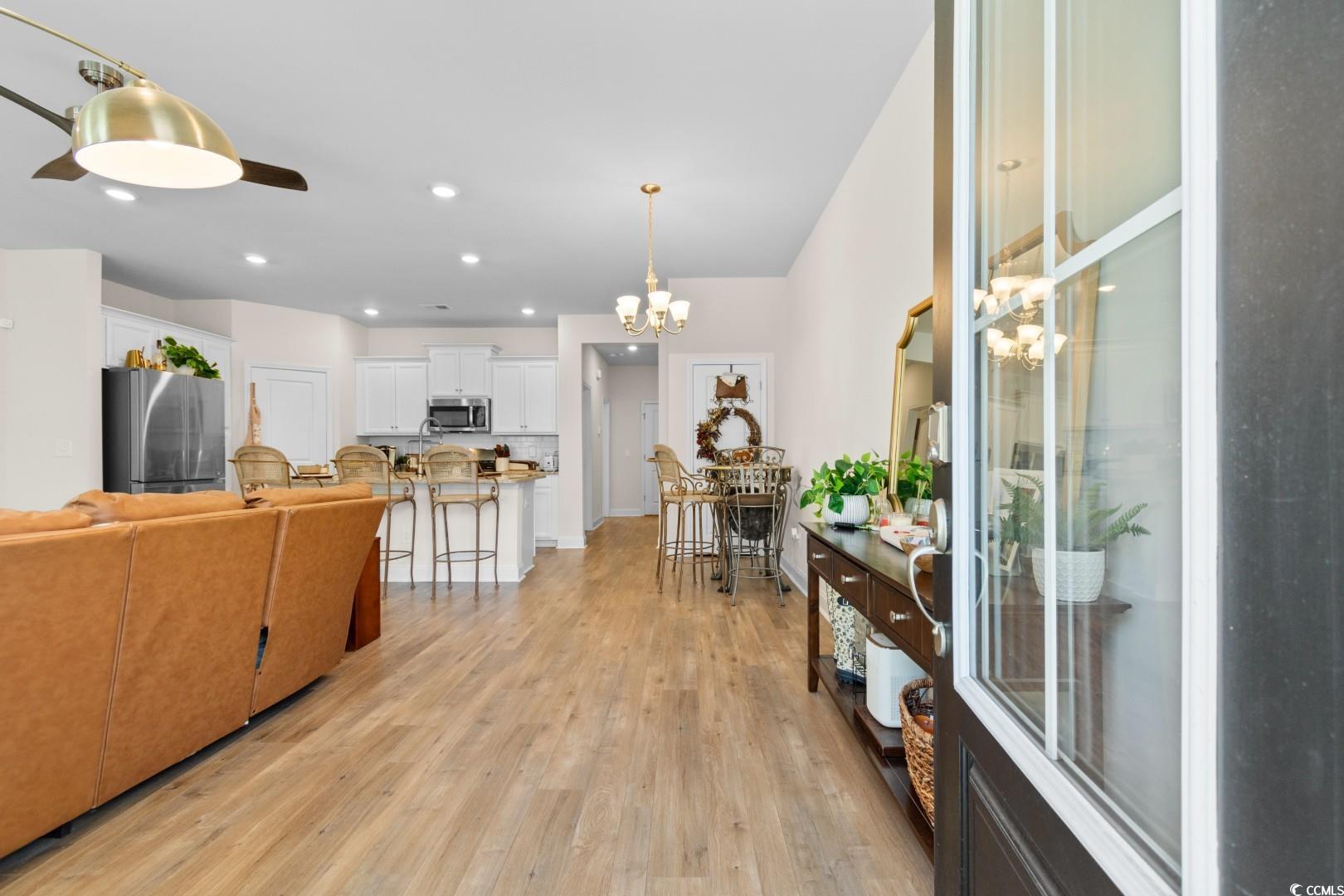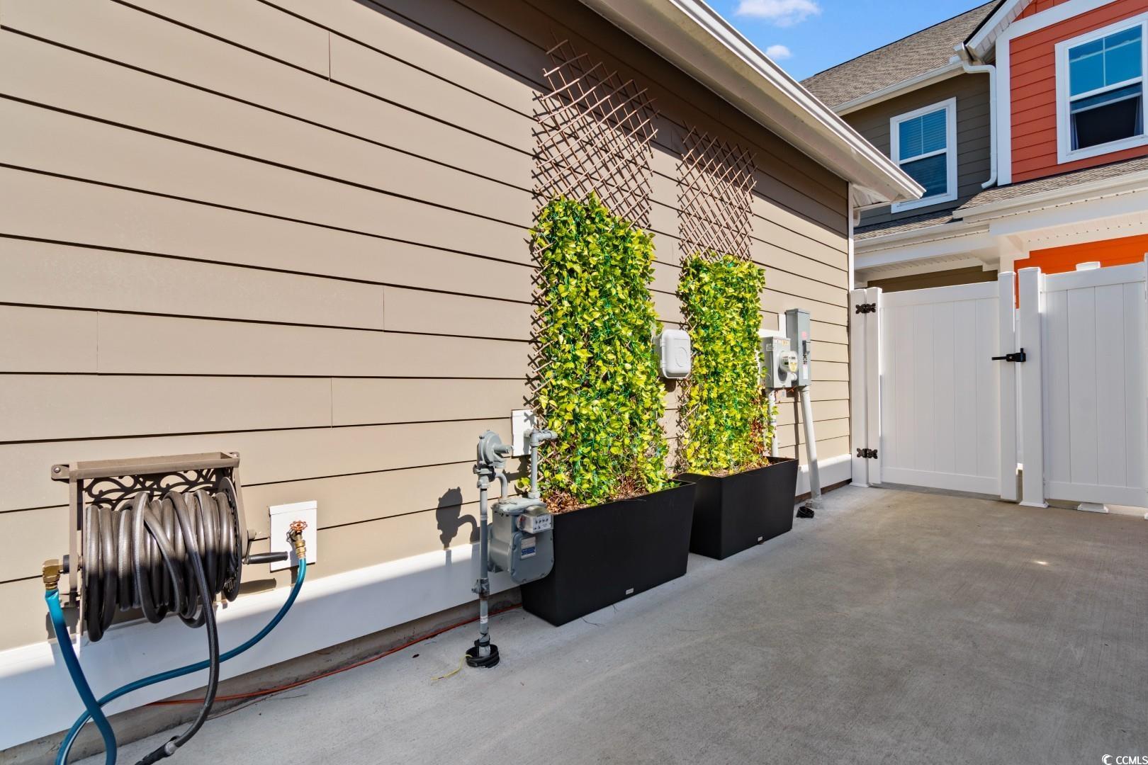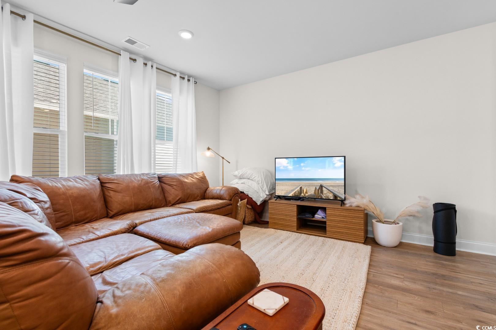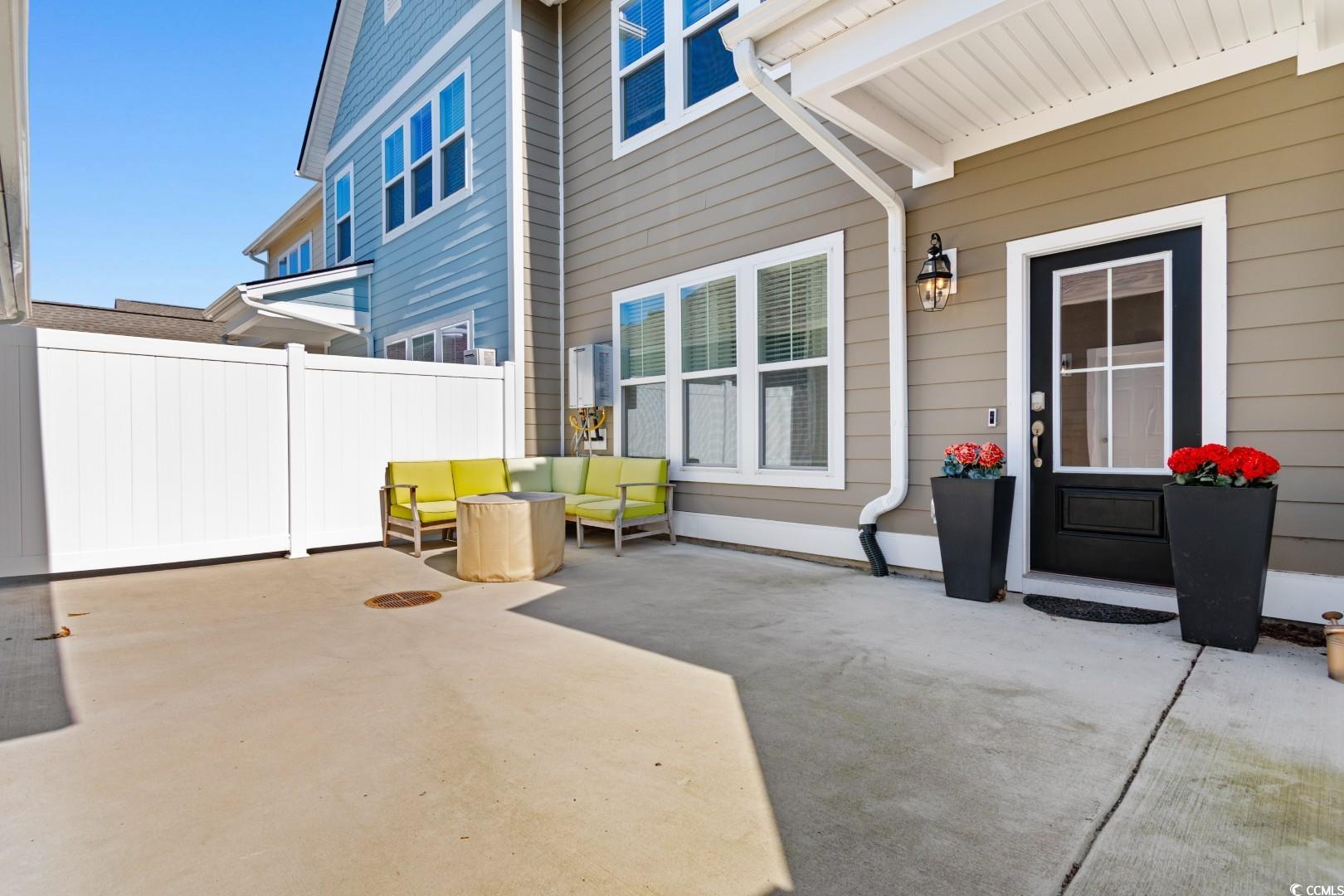 This 3-bedroom, 2.5-bath Pinehurst Model interior unit offers a two-car garage with an extended driveway for four additional vehicles. Enjoy an oversized courtyard, perfect for entertaining. Professionally landscaped front and backyard with irrigation. Inside, the first-floor master suite features a walk-in closet and granite countertop vanity. The open living area has luxury laminate flooring, and the gourmet kitchen boasts granite countertops, tile backsplash, stainless steel appliances, a pantry, and an island with seating for four. Upstairs includes two bedrooms, a full bath, a spacious loft, and a bonus room. Energy-efficient home with a tankless water heater.Belle Harbor amenities: resort-style pool, cabana, grills, pickleball, playground, and walking trails. Located in Market Common, just a golf cart ride to the beach, shopping, and dining!