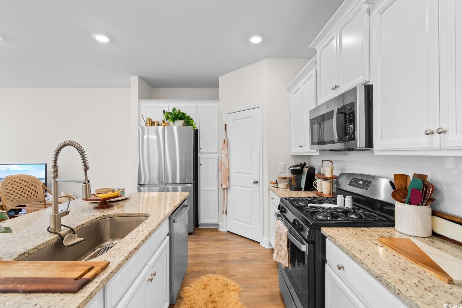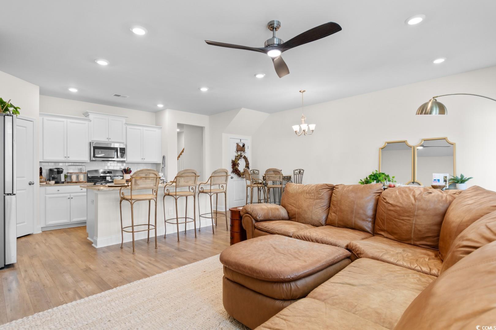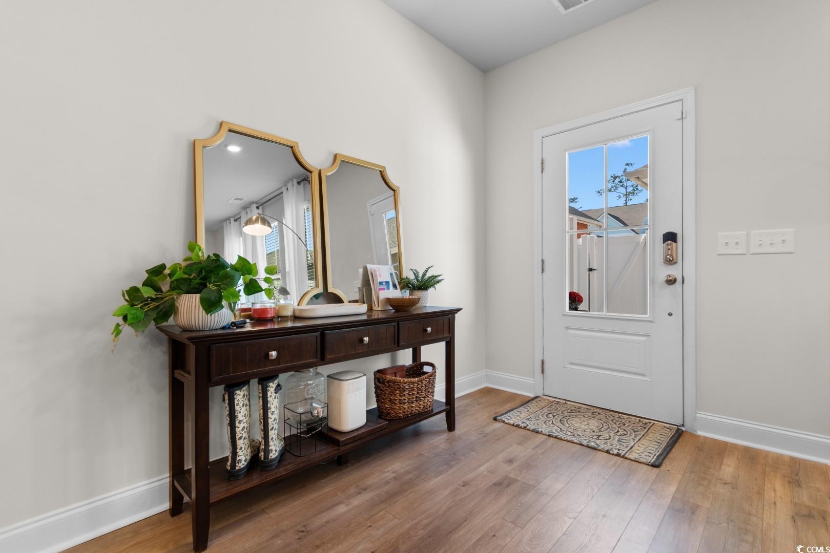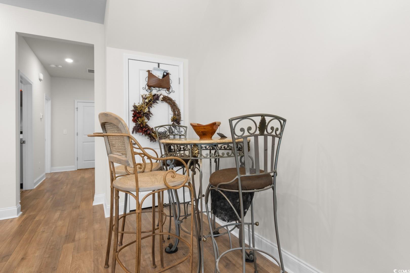This 3-bedroom, 2.5-bath Pinehurst Model interior unit offers a two-car garage with an extended driveway for four additional vehicles. Enjoy an oversized courtyard, perfect for entertaining. Professionally landscaped front and backyard with irrigation. Inside, the first-floor master suite features a walk-in closet and granite countertop vanity. The open living area has luxury laminate flooring, and the gourmet kitchen boasts granite countertops, tile backsplash, stainless steel appliances, a pantry, and an island with seating for four. Upstairs includes two bedrooms, a full bath, a spacious loft, and a bonus room. Energy-efficient home with a tankless water heater.Belle Harbor amenities: resort-style pool, cabana, grills, pickleball, playground, and walking trails. Located in Market Common, just a golf cart ride to the beach, shopping, and dining!