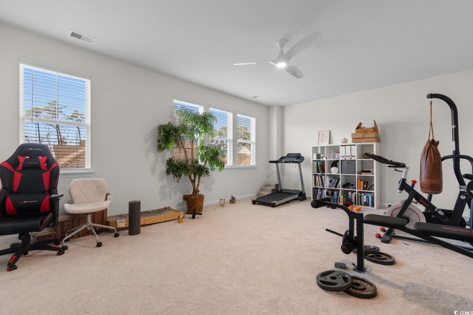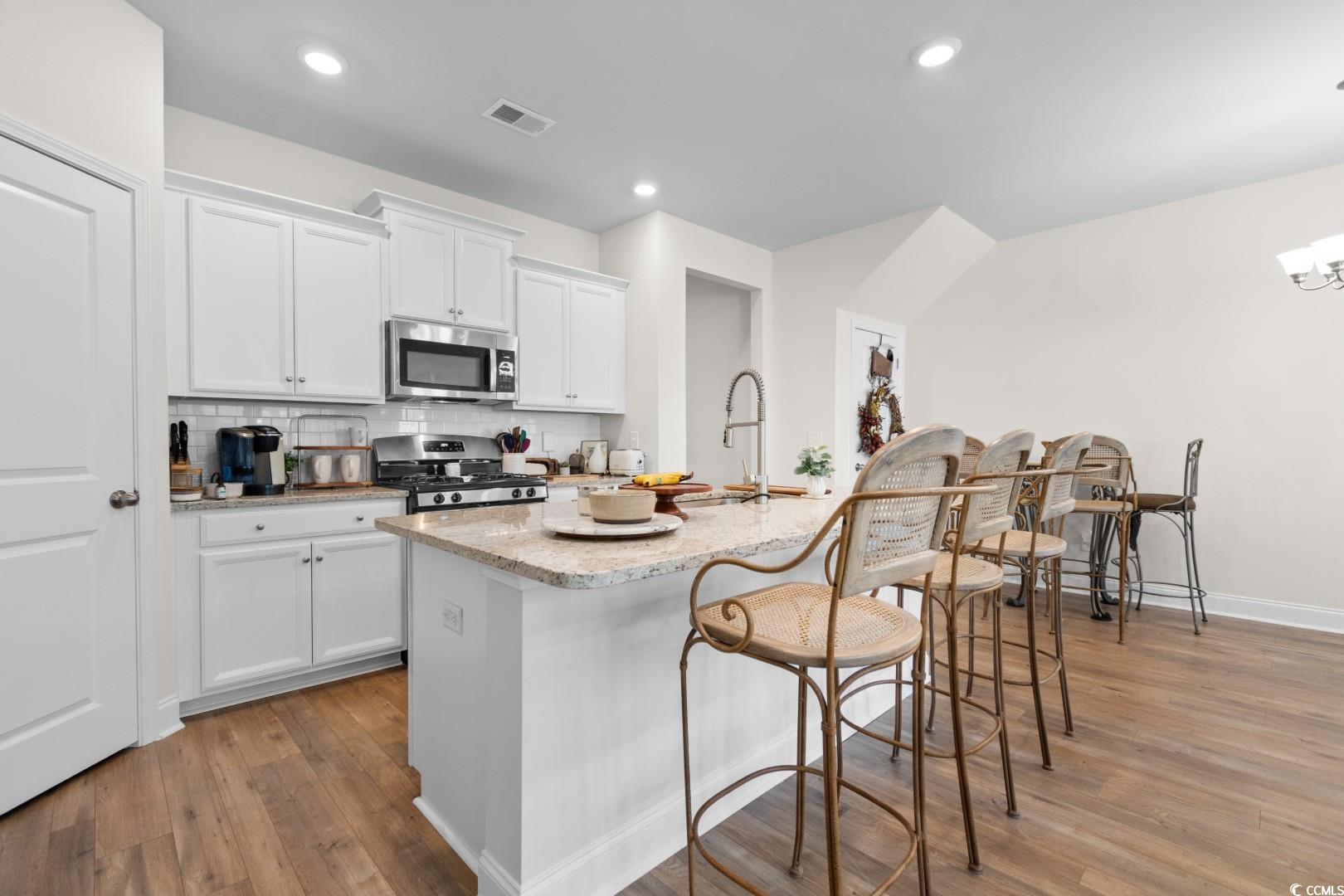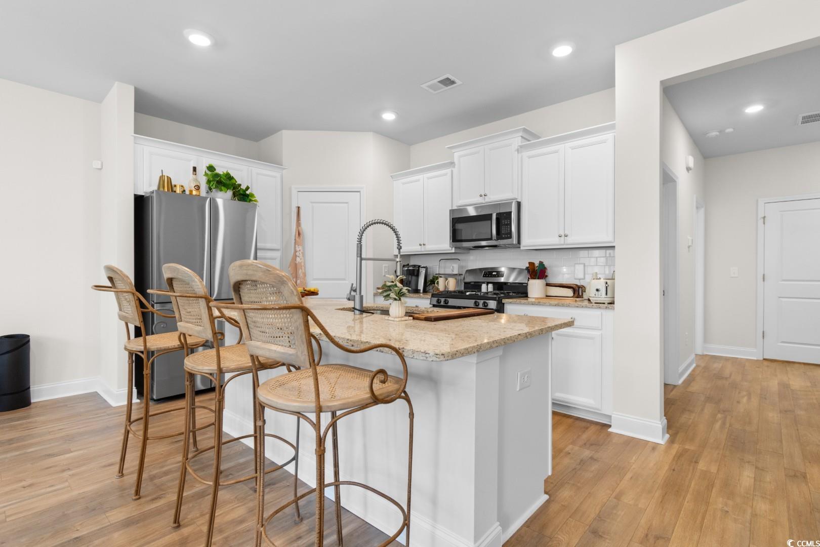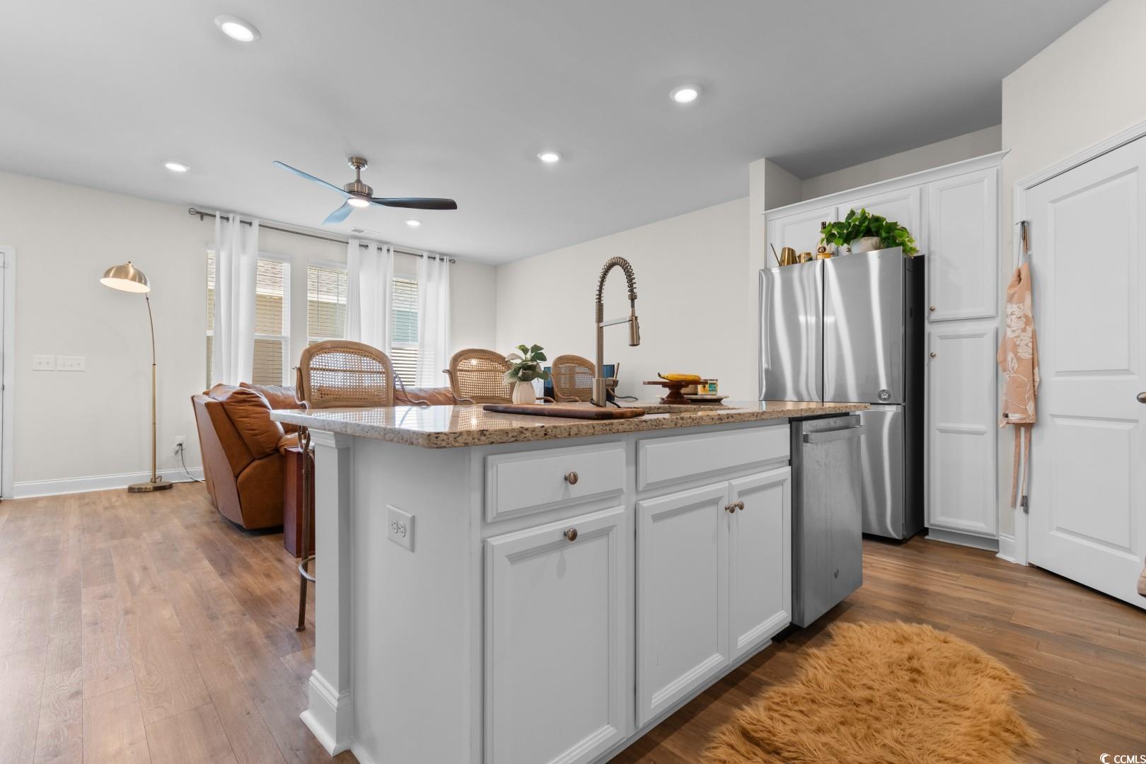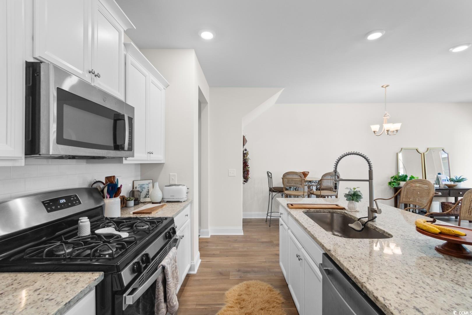 This 3-bedroom, 2.5-bath Pinehurst Model interior unit offers a two-car garage with an extended driveway for four additional vehicles. Enjoy an oversized courtyard, perfect for entertaining. Professionally landscaped front and backyard with irrigation. Inside, the first-floor master suite features a walk-in closet and granite countertop vanity. The open living area has luxury laminate flooring, and the gourmet kitchen boasts granite countertops, tile backsplash, stainless steel appliances, a pantry, and an island with seating for four. Upstairs includes two bedrooms, a full bath, a spacious loft, and a bonus room. Energy-efficient home with a tankless water heater.Belle Harbor amenities: resort-style pool, cabana, grills, pickleball, playground, and walking trails. Located in Market Common, just a golf cart ride to the beach, shopping, and dining!