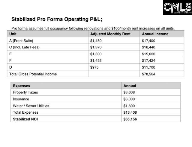 This is an interesting Commercial / residentual property, Could be a live / work property , The Two front Commerrcial units are presently occupied by one tenant , as i see it the greatest potential to improve rental income or owner occupy ...Convienantly located to Down Town ( 1 mile ) New USC medical School , University of SC , dining in Cotton Town Main St , Vista , shopping , Inrestate access.This unique property has Commercial usage and 4 residentual units , two that have been completly renovated .The other units bring in respectible rent for what they are , upside potential ...The Commercial up front has great street visability Good off street parking in front of commercial , and in back through the portechet .We are leaving unit F in back up vac for easy showing , updated with last rent rate $1,450 per month .If F rented for prior rent and all else stayed the same gross annual rent of $74,280. Multiple property usages 3 of the 4 residentual units renovated Disclaimer: CMLS has not reviewed and, therefore, does not endorse vendors who may appear in listings.