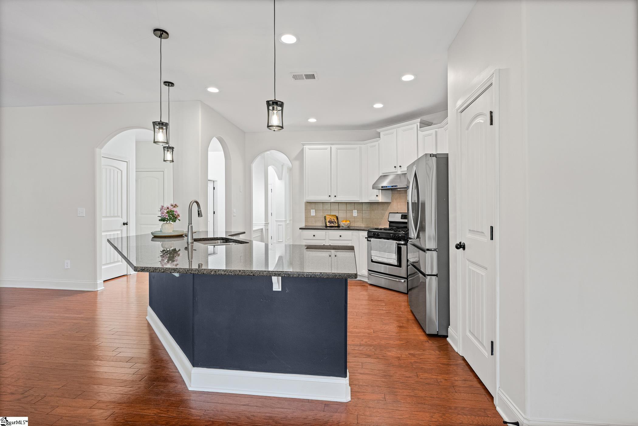 Just what you’ve been waiting for! Located in the highly sought-after Five Forks area of Simpsonville, this beautifully maintained home sits on a quiet cul-de-sac in the desirable Creekwood community. This stunning 4-bedroom, 2.5-bath home features an open-concept layout ideal for both everyday living and entertaining. The spacious kitchen flows seamlessly into the main living and dining areas, highlighted by a stylish stone fireplace that creates a warm and inviting focal point. A versatile flex room on the main level offers endless possibilities—perfect for a home office, playroom, or cozy sitting area. Step outside to enjoy your private, fully fenced backyard complete with a covered patio featuring an architectural roof, ceiling fan, lighting, and wiring for an outdoor TV—perfect for relaxing or hosting guests year-round. Upstairs, you’ll find generously sized bedrooms with ample closet space, along with a spacious primary suite offering a large walk-in closet and an ensuite bath with dual vanities, a garden tub, and separate shower. Throughout the home, you’ll appreciate thoughtful upgrades and details including hardwood floors on the main level, granite countertops, stainless steel appliances, ceramic tile in wet areas, tray ceilings, arched doorways, decorative columns, and elegant trim work. Creekwood offers exceptional amenities including walking trails, playground, updated basketball court, Jr. Olympic pool with a lazy river and kiddie area, plus a clubhouse with outdoor fireplace and covered seating. This is your chance to own a move-in ready home in one of Simpsonville’s most desirable communities—don’t miss it!