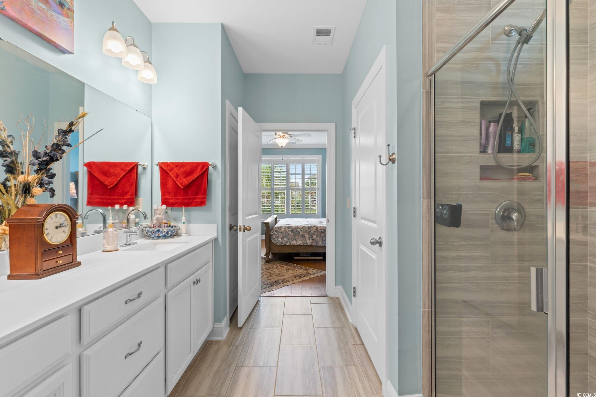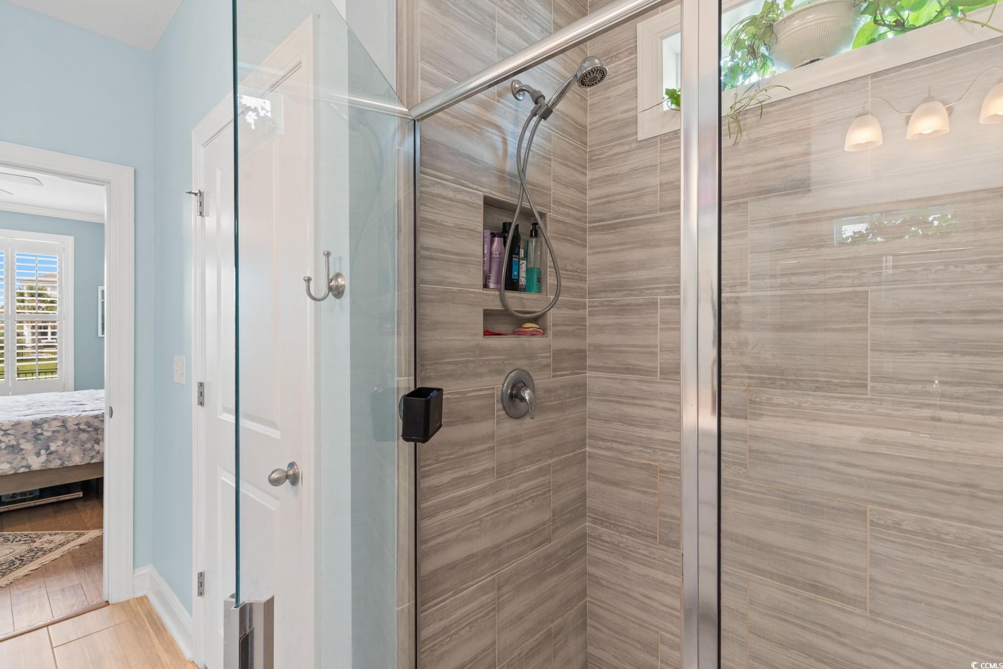 This is a beautiful DR Horton Bradford Plan home! Featuring durable Hardie siding, a welcoming front porch, a rear covered porch with peaceful water views, and lavish landscaping. This property also includes hurricane shutters, a fenced yard, an irrigation system, and has been recently painted. Inside, the split-bedroom design highlights a spacious open-concept layout with a bright kitchen, dining, and living area. The kitchen includes quartz countertops, an oversized island with breakfast bar, stainless steel appliances, a gas range, tile backsplash, and a large pantry. Hardwood flooring, crown molding, 5" baseboards, custom plantation shutters, and ceiling fans add a touch of elegance throughout the main living spaces. The large primary suite is at the back of the home and offers a luxurious bath with dual vanities, a walk-in tiled shower, and a generous walk-in closet. French doors open to a versatile flex room—perfect as an office, den, formal dining, or even an additional bedroom. Upstairs, you’ll find a private bedroom, full bath, game room or additional living space, plus extra storage. All baths and the laundry feature upgraded porcelain tile. Located in Summit at Meridian, residents enjoy outstanding amenities including a spacious community pool and an indoor pickleball court. Conveniently situated just minutes from the beach, marinas, parks, restaurants, shopping, golf courses, hospitals, and more—including The Market Common, Coastal Grand Mall, Tanger Outlets, Myrtle Beach State Park, and Myrtle Beach International Airport—this home truly offers the best of coastal living!