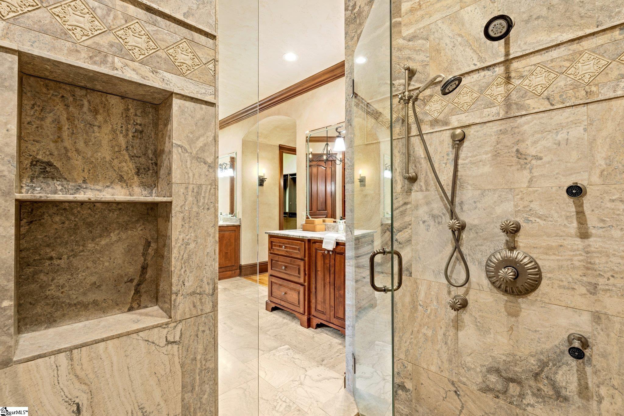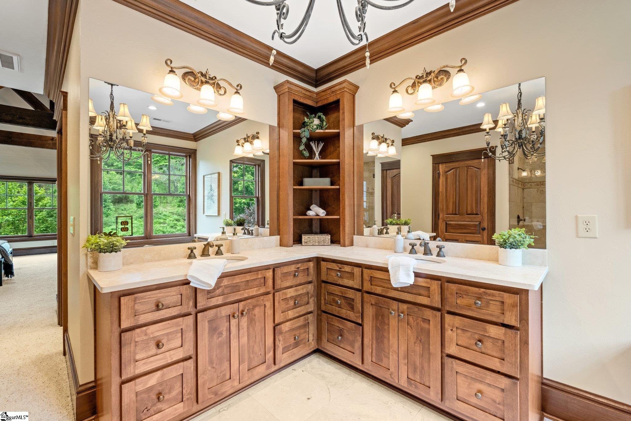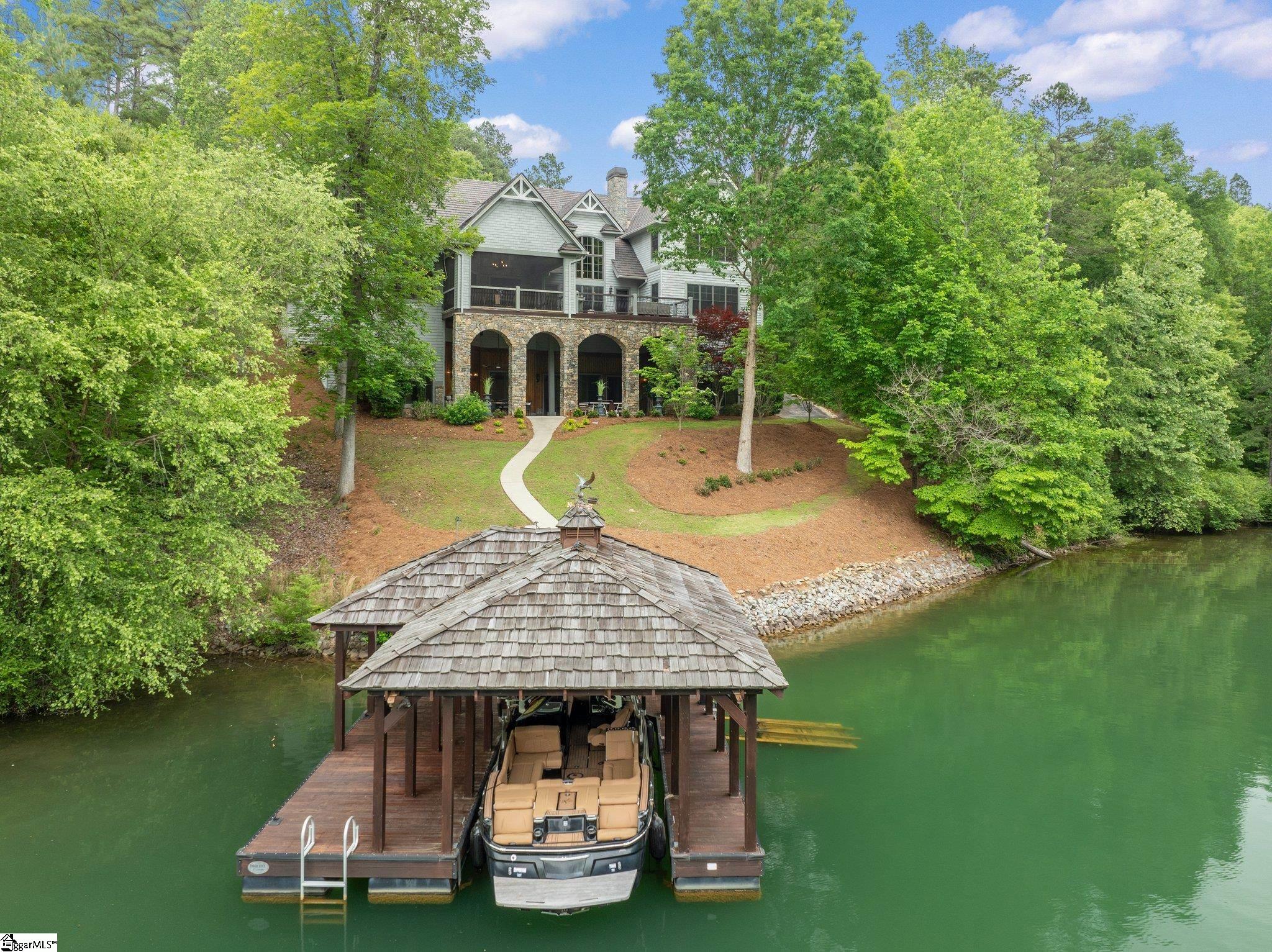 Enchanting, magical, and inviting—welcome to 264 Featherstone Drive. Tucked into a quiet, deep-water cove in The Reserve at Lake Keowee, this 5-bedroom, 4 full and 2 half-bath retreat offers over 6,750 square feet of beautifully crafted living space, with an estate-sized 2.29-acre double sized lot providing privacy, serenity, and a scenic walk to the water’s edge. From the moment you arrive, you're greeted by a long, gentle private drive leading to your lakeside sanctuary. The home’s exterior is wrapped in native Maggie Valley stone, poplar bark siding, and topped with a brand new roof —setting the tone for the exceptional natural materials found throughout. Designed for both relaxed lake living and elegant entertaining, the interiors feature custom wood elements including mesquite, mahogany, hickory, antique barnwood, and Venetian style dry wall. The Great Room boasts a two-story stone fireplace, soaring ceilings, and windows that frame Lake Keowee’s emerald-green waters. A one of a kind antler chandelier adds rustic charm, while the adjacent screened porch with barnwood ceiling, flagstone floors, and Ironwood (IPE) decking invites you to unwind outdoors. The chef’s kitchen is as functional as it is beautiful, anchored by a solid mesquite island and equipped with Viking appliances, induction cooktop, full-size refrigerator and freezer, warming drawer, wine cooler, and more. A cozy breakfast/keeping room and elegant dining area with a custom wood ceiling round out the heart of the home. This estate is perfectly suited for hobbyists and car enthusiasts, and lake adventurists offering five garage bays—three on the main level and two below with a separate drive access. A private guest room above the main garage and lofted storage above the lower level garage provides versatile additional space. The main-level primary suite features a coffered ceiling, jetted tub, walk-in shower, and dual closets. Upstairs, you'll find a spacious second primary suite, ideal for use as an in-law suite or private guest retreat. Just down the hall, an additional bedroom offers separation and privacy—perfect for family or extended-stay visitors. The lower level includes another spacious suite bedroom, a custom wine room with adjacent entertaining area, plus a walkout to a covered patio and built-in grill—just steps from your private dock. A Reserve Premier membership is available for separate purchase, granting access to world-class amenities including the Jack Nicklaus Signature Golf Course, clubhouse, marina, tennis and pickleball courts, fitness facilities, and fine dining options. Whether you're boating, entertaining, or simply enjoying the peace of the lake, 264 Featherstone Drive delivers unmatched charm in one of Lake Keowee’s most desirable communities.