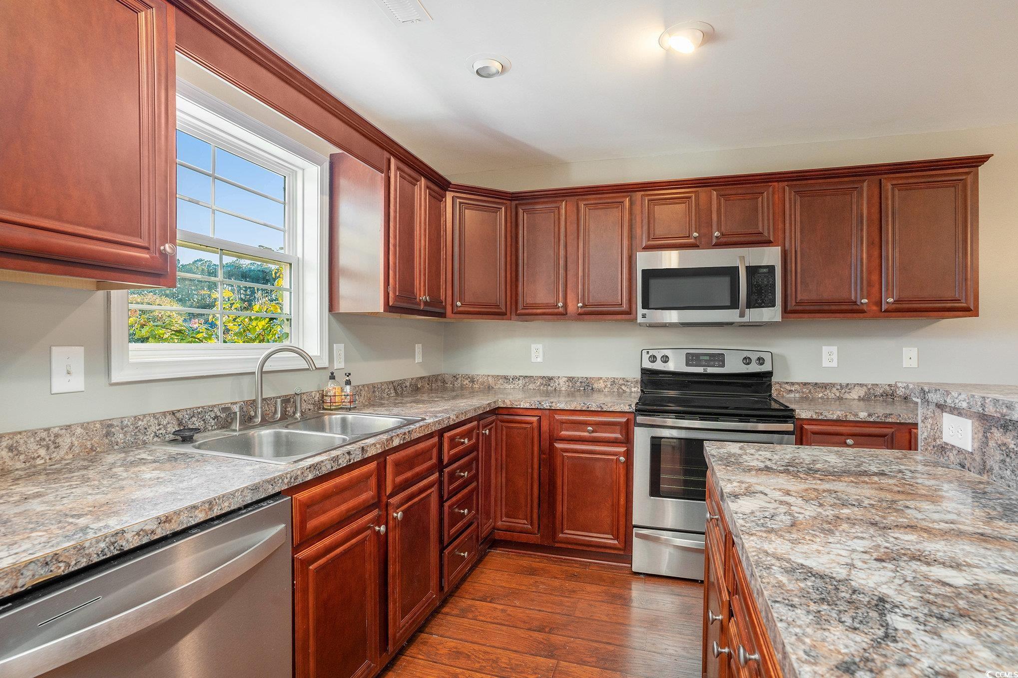 Enjoy Carolina living at is finest in this beautiful open floor plan 3/2 home overlooking a peaceful pond, nestled in the quiet sidewalk community of Hunters Creek. -Spacious primary suite with trey ceilings, double vanity and walk-in closet -Modern kitchen featuring breakfast bar, granite countertops and stunning lake view. -Relax on the front sitting porch or entertain on the covered back porch with extended patio. -Bright and airy living spaces designed for comfort and flow. All located just minutes from the Riverfront Historic Downtown Conway with its charming Main Street. Just a short drive to the sandy beaches of the Grand Strand.