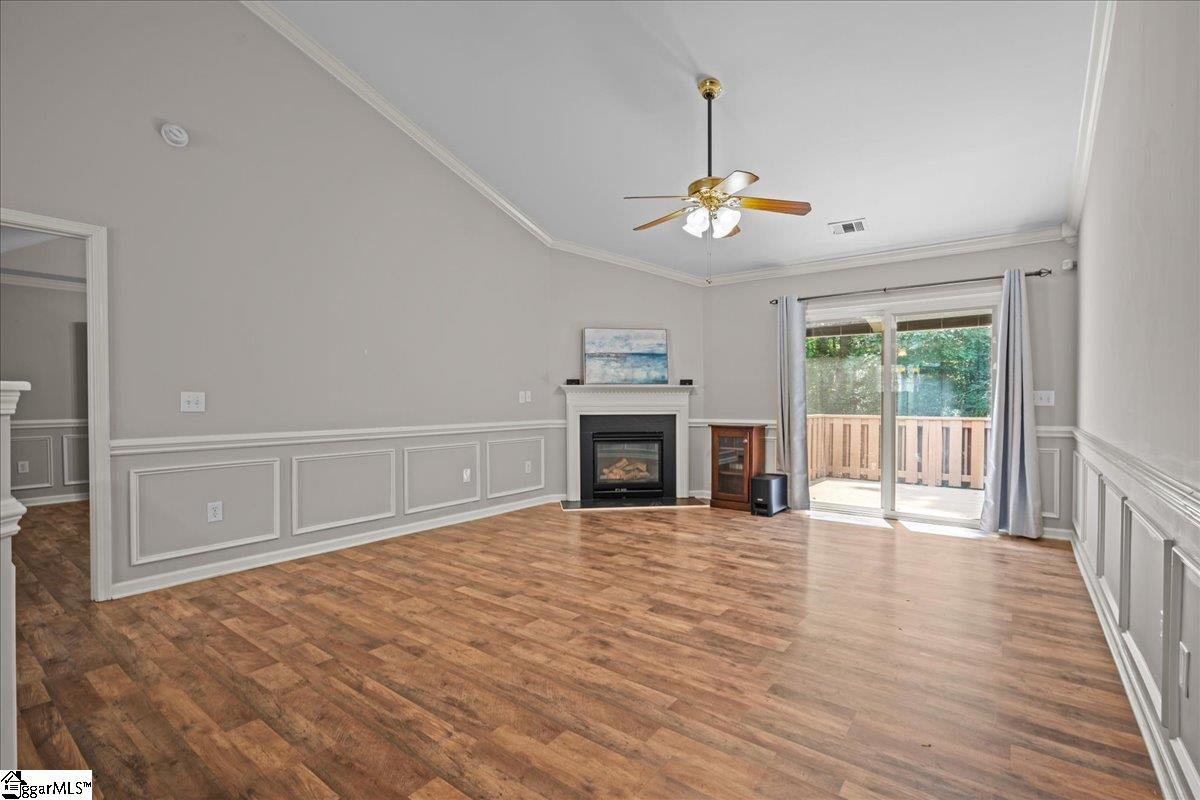 CREEKSIDE AT ROCK SPRINGS | 269 Dartmoor Drive features 3 Bedrooms 2 Full Baths and a spacious recreation room. A welcoming foyer invites you in with wainscoting and crown molding galore! The sizable open floor plan provides space for family night with a centrally located Kitchen. The Great Room has a gas log fireplace, soaring vaulted ceilings, and access to your yard, deck, and firepit. The Owner's bedroom is oversized with trey ceilings, a full bath, double sink vanity and walk-in closet. The FROG (flex room over garage) would make a great office or playroom. Situated on quiet cul-de-sac with two large side yards, privacy with creek views. You'll love evening bonfires around your firepit roasting marshmellows while the fireflies dance around your backyard! Convenient access to I-85, I-26, plenty of restaurants and shopping including Target which is ±5 minutes away! The community amenities include a pool and playground accessible through the neighborhood walking trail, shared with The Oaks at Rock Springs! If you have friends or family in Woodridge or Rock Springs you'll enjoy evening strolls for a visit just moments from your front door via the adjacent sidewalks.