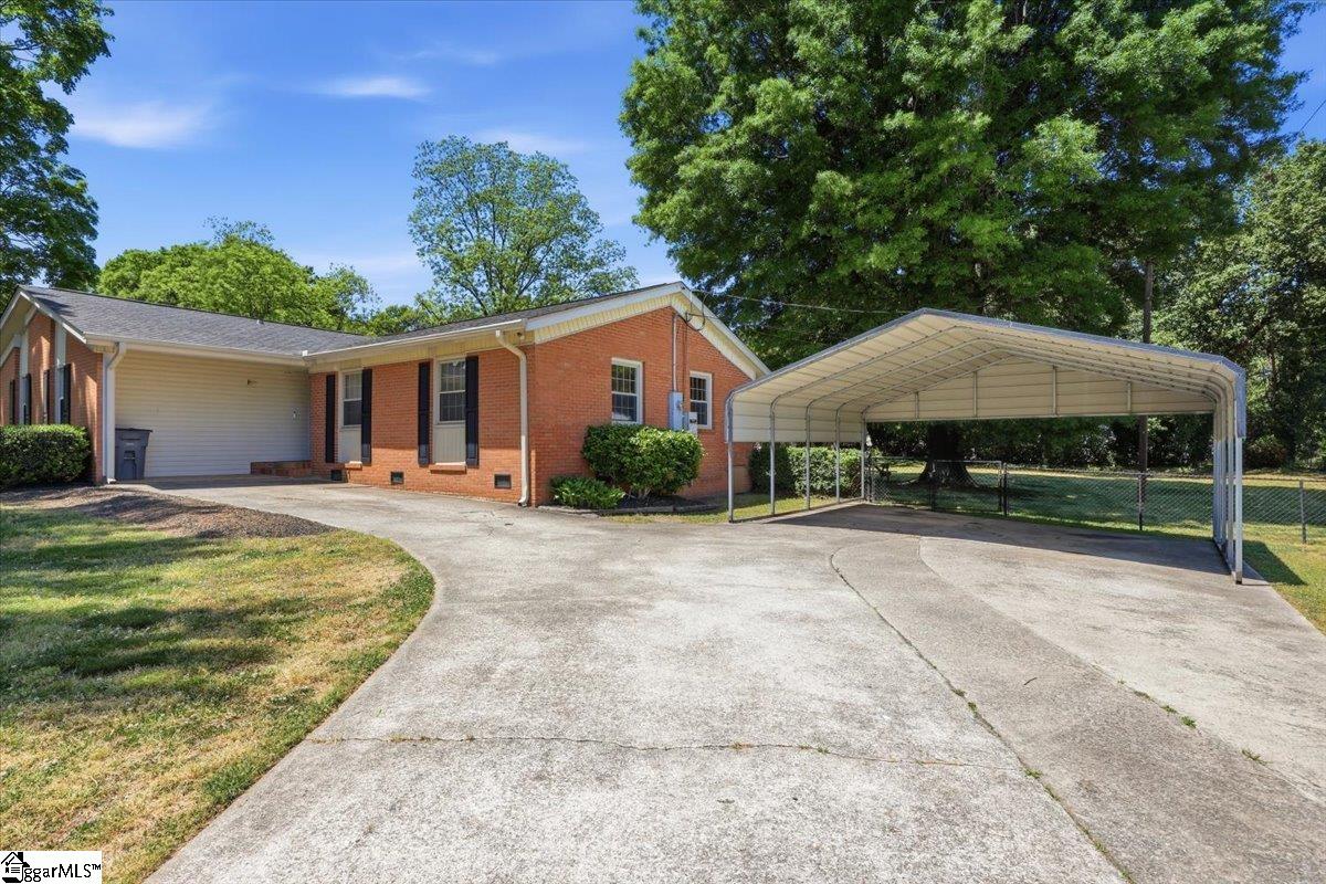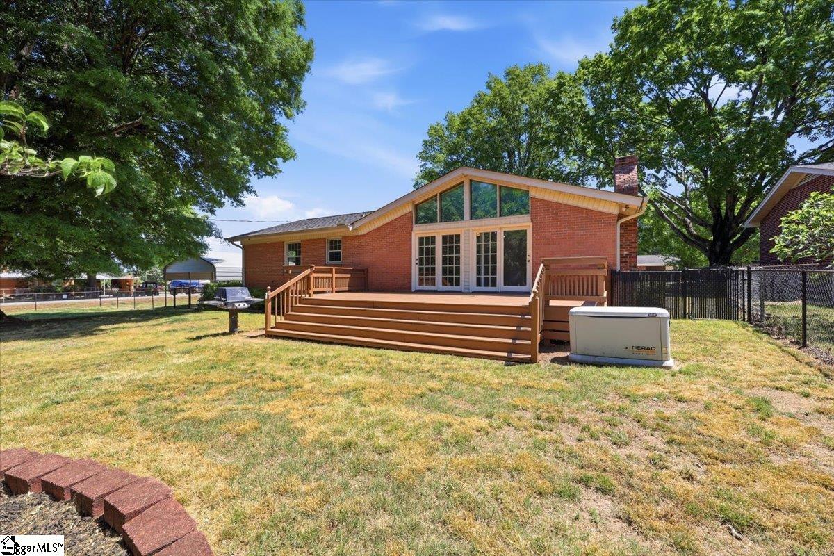 Welcome to this charming and well-maintained 3-bedroom, 2-bath brick ranch on a spacious corner lot with a large fenced backyard—perfect for outdoor activities and relaxation. Inside, vaulted ceilings in the living room and den create an open, airy atmosphere, while a raised hearth all-brick fireplace adds a cozy focal point. Hardwood floors grace the main areas, and fresh professional interior paint, along with upgraded hardware, gives the home a modern, move-in-ready feel. Recent upgrades include a brand-new roof (April 2026) and a newer HVAC system, offering added peace of mind. The home also offers a whole-house Generac generator with service paid through the end of 2026, ensuring dependable backup power. Just off the deck, enjoy a small built-in gas grill that conveys with the home and is directly hooked to the gas line. A spacious mudroom/laundry area, though not heated or cooled, offers flexible potential—perfect as a home office, gym, extra storage, or a craft room. With both a den and living room, this home is ready for your personal touch. Conveniently located just minutes from downtown Greenville and the charm of Travelers Rest, this home is a rare find. Schedule your private tour today!