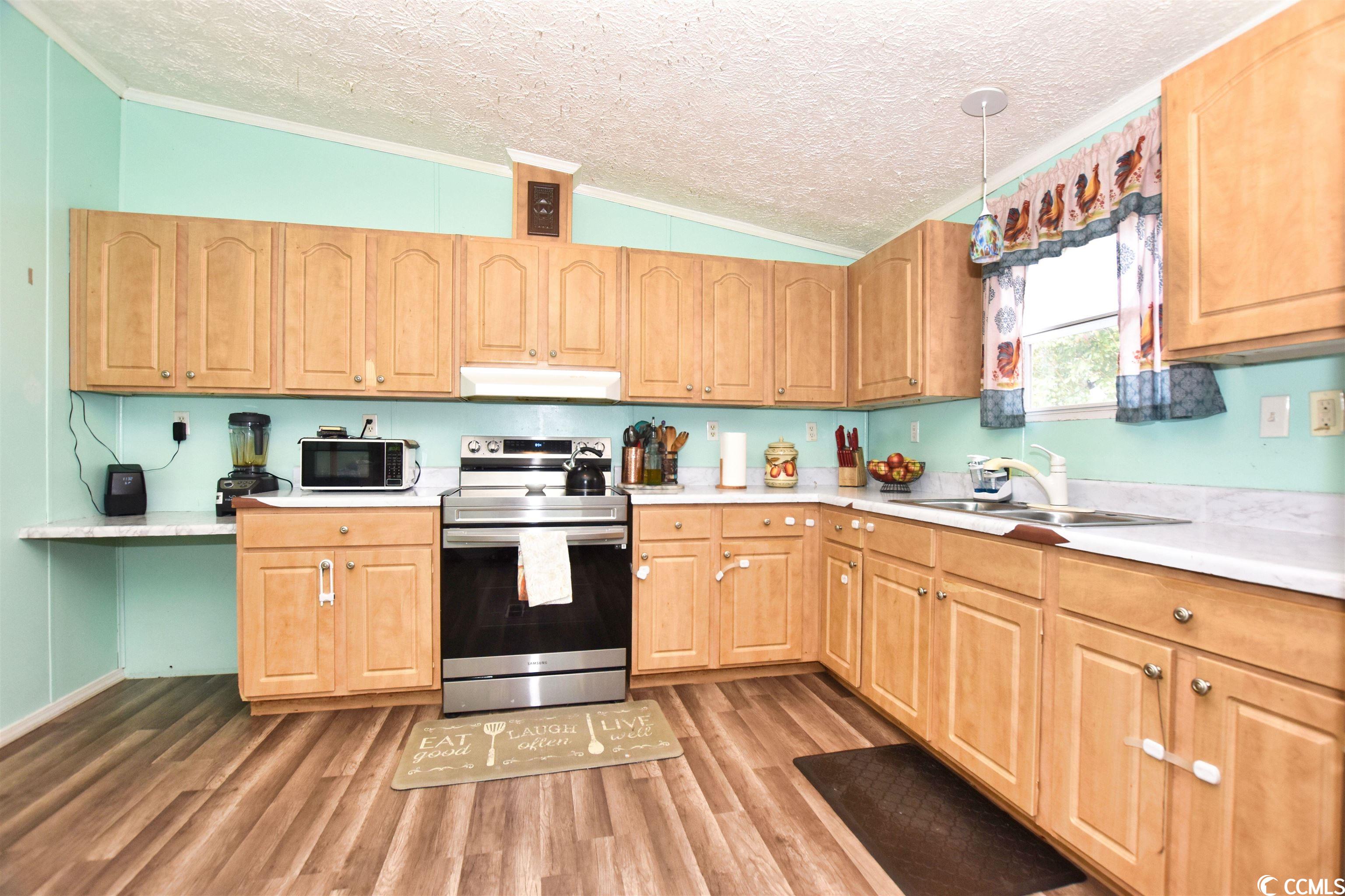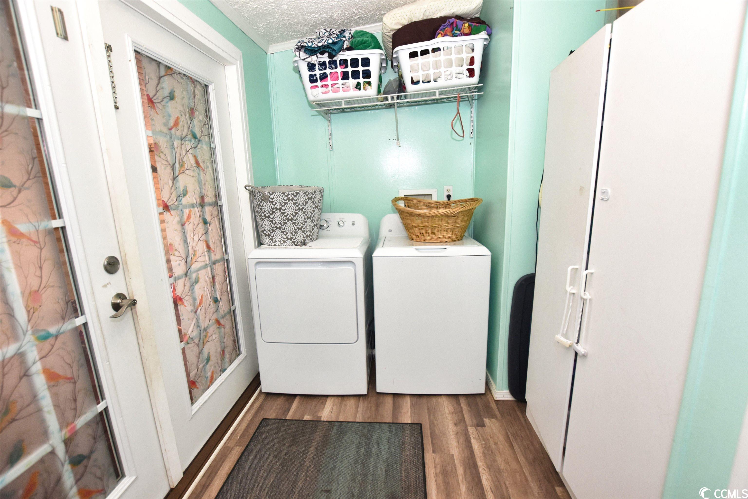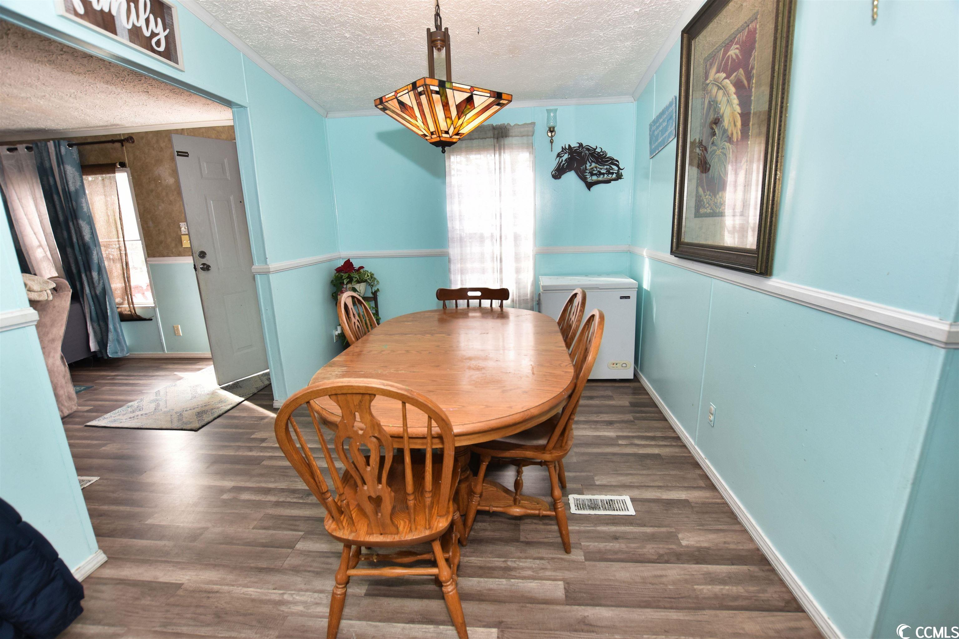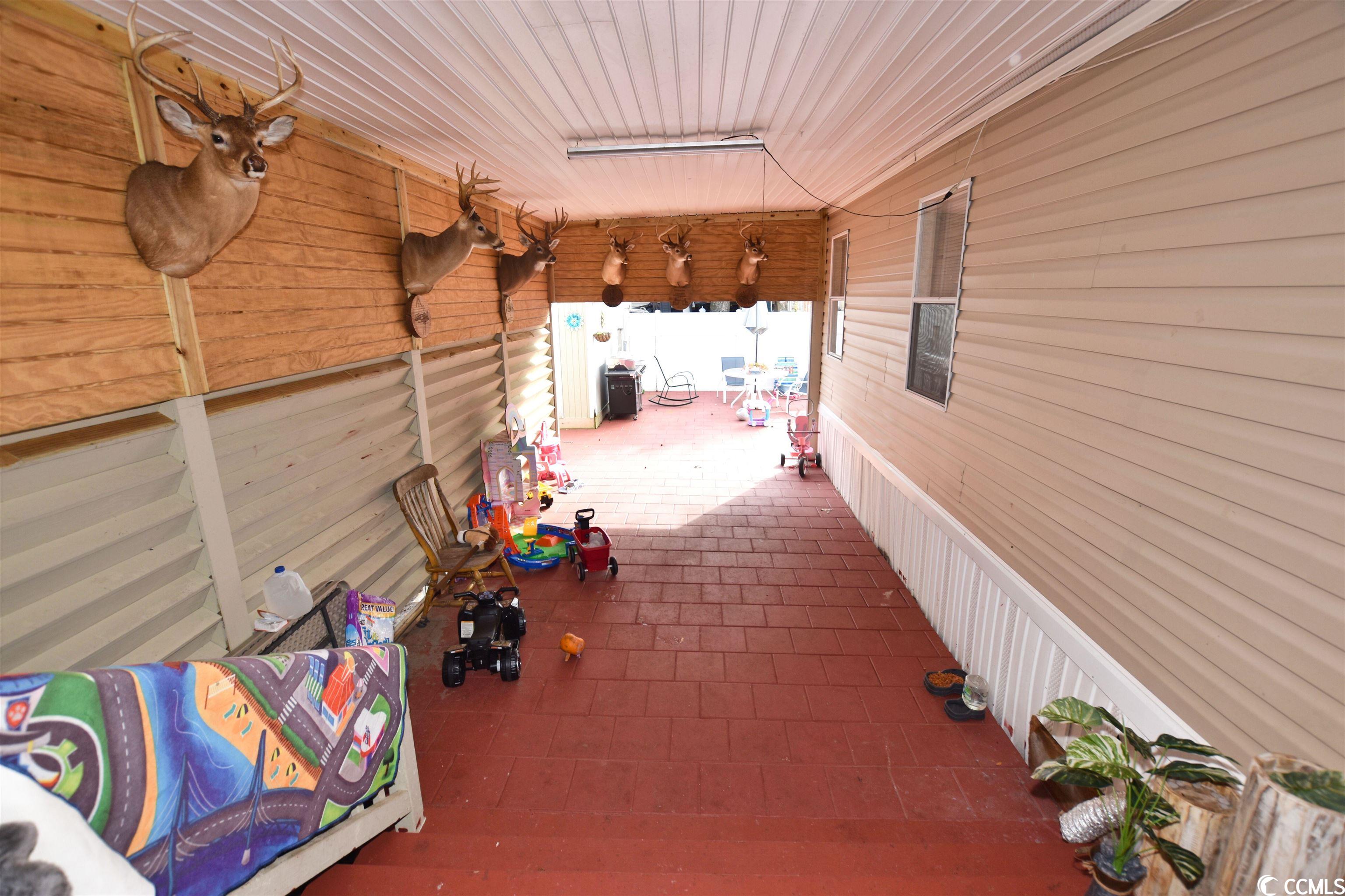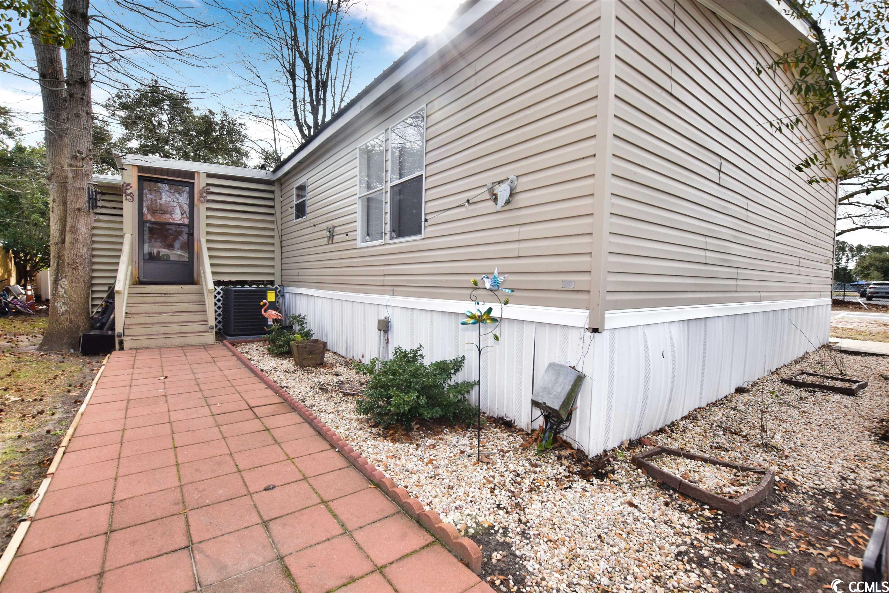 This charming 3-bedroom, 2-bathroom residence offers an exceptional outdoor space for hosting gatherings, nestled in the sought-after Crystal Lake Community. The home, a spacious double wide mobile unit, boasts modern luxury vinyl plank flooring throughout. Its main living area features high vaulted ceilings and a dedicated dining space. The master bedroom, easily accessible from the living room, includes an en-suite bathroom with dual vanities, a large garden tub, and a separate shower. The kitchen is equipped with a central work island and a breakfast bar, leading into a cozy family room with a fireplace and an open layout. Two additional bedrooms and another full bathroom are situated on this wing of the house. The outdoor area is truly a highlight, offering a covered section, durable surface flooring, and a privacy fence, perfect for enjoying a drink or a barbecue while relishing in the ambiance of your private courtyard. Additionally, there's a separate shed for added storage. The home's location is ideal, close to beaches, shopping centers, restaurants, the Market Common, Myrtle Beach International Airport, and all the attractions Myrtle Beach is renowned for.