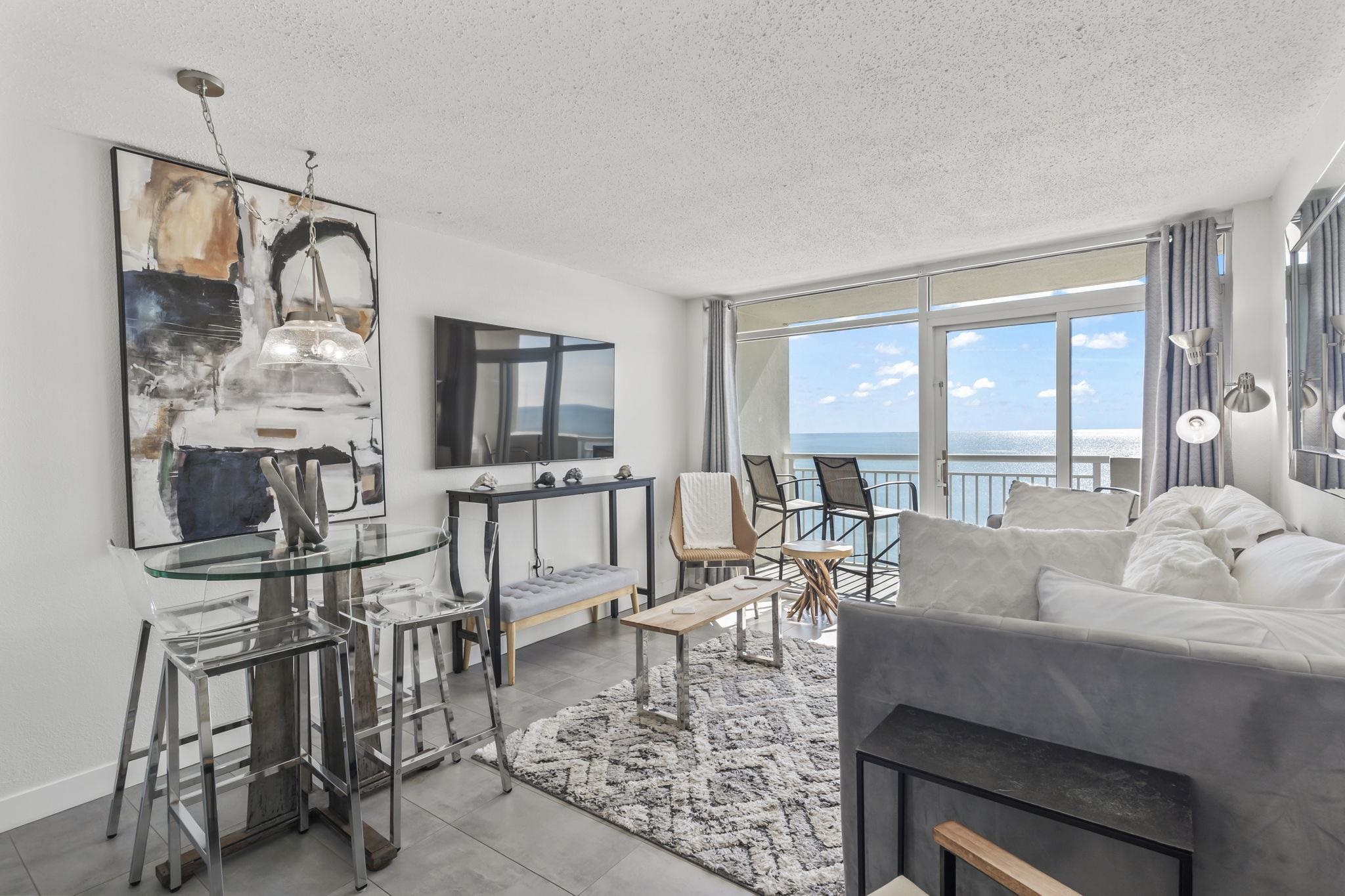 Experience breathtaking direct oceanfront living in this fully remodeled one bedroom I bath coastal retreat. From the moment you enter, you'll notice the exceptional craftsmanship and thoughtful upgrades throughout. Freshly painted and beautifully designed this unit features two custom barn doors with striking hardware that add to both character and functionality. The kitchen is a true showpiece complete with granite countertops, a stunning new tile backsplash , and all new stainless steel appliances. Every detail has been carefully curated, including a custom dining table paired with sleek acrylic dining chairs that perfectly complement the modern coastal aesthetic. Wake up to the sound of waves crashing and enjoy the serene beauty of unobstructed oceanfront views right from your living space. The peaceful rhythm of the ocean creates an athmosphere of relaxation that makes this property not just a vacation home but a true seaside sanctuary. This is oceafront living at its finest - stylish, serene and simply unforgettabe.