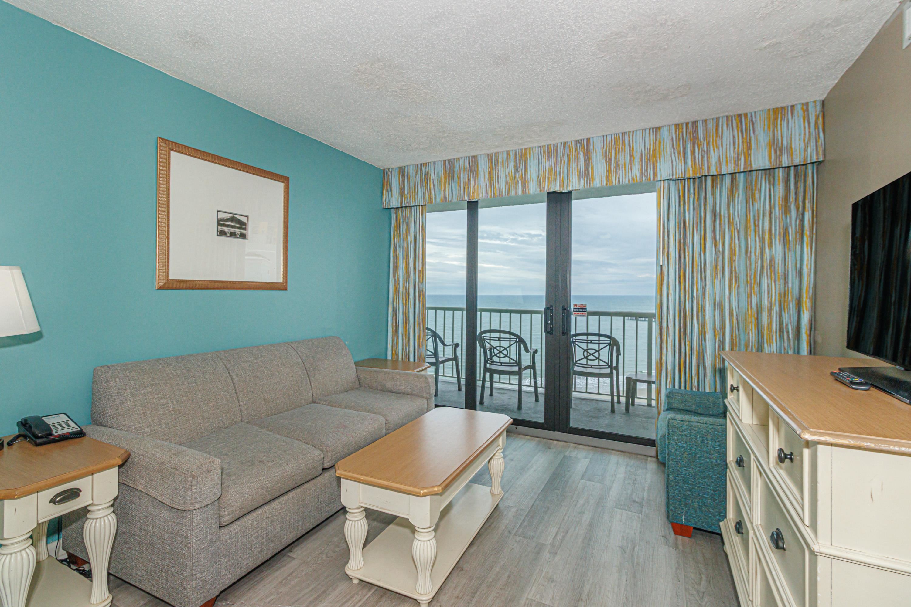 One of the most desirable true one-bedroom oceanfront floorplans available, this residence offers the rare advantage of both the bedroom and living area positioned directly on the oceanfront, each with access to a spacious private balcony. Inside, the condo features granite countertops, a dishwasher, an in-unit washer and dryer—an uncommon upgrade for one-bedroom units—and durable luxury vinyl plank flooring throughout. Located within a highly rated, boutique 87-unit resort, owners and guests enjoy an exceptional lineup of amenities including an on-site restaurant and bar, fitness center, oceanfront heated outdoor pool, oversized hot tub, cabanas, fireplace, lounge seating, and inviting outdoor gathering spaces. Whether you’re seeking a refined second home or a proven investment property, this condo delivers with a strong rental history and broad appeal. Tucked away in a quieter section of Myrtle Beach on 27th Avenue North, yet just minutes from Broadway at the Beach, Market Common, the Boardwalk, dining, shopping, and entertainment, this floorplan stands out as a must-see opportunity. Don’t miss your chance to own one of the few true one-bedroom oceanfront condos in Myrtle Beach.