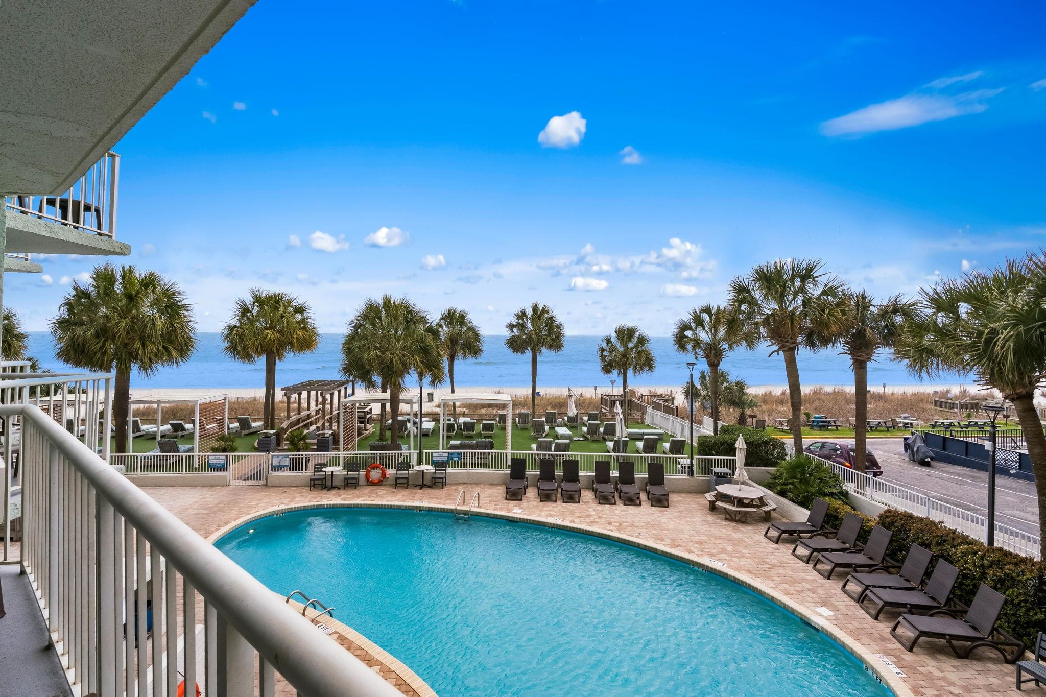 Experience effortless beachfront living in this beautifully appointed 1-bedroom, 1-bath direct oceanfront condo at The Strand—where the standout feature is all about easy access and convenience. Located on the 2nd floor, this unit allows you to skip the elevator entirely—a huge advantage during busy summer months when wait times can stretch during peak check-in and check-out hours. Inside, you’ll be welcomed by gorgeous, unobstructed ocean views visible from nearly every room, complemented by soothing coastal paint colors that create a light and relaxing atmosphere. Step outside to your private balcony, where you can take in both the sparkling Atlantic Ocean and the resort-style community pool below. This condo comes fully furnished and is move-in ready, featuring a well-equipped kitchen with granite countertops, full-sized appliances, tile flooring, and a convenient breakfast bar. A designated dining area provides the perfect space for meals or entertaining, while the in-unit stackable washer and dryer adds everyday practicality. Owners and guests enjoy access to a wide range of resort-style amenities, including an outdoor pool and jacuzzi, oceanfront cabanas, sun deck, fitness center, cozy fireplace lounge, and on-site dining options. Ideally situated, this condo is within walking distance to some of the area’s most popular restaurants, as well as the convention center, boardwalk, and countless attractions along the Grand Strand. A convenience store located just across the street adds to the everyday ease. Whether you're looking for a vacation getaway, investment opportunity, or a place to call your own by the sea, this oceanfront gem offers the perfect blend of location, comfort, and unmatched accessibility.