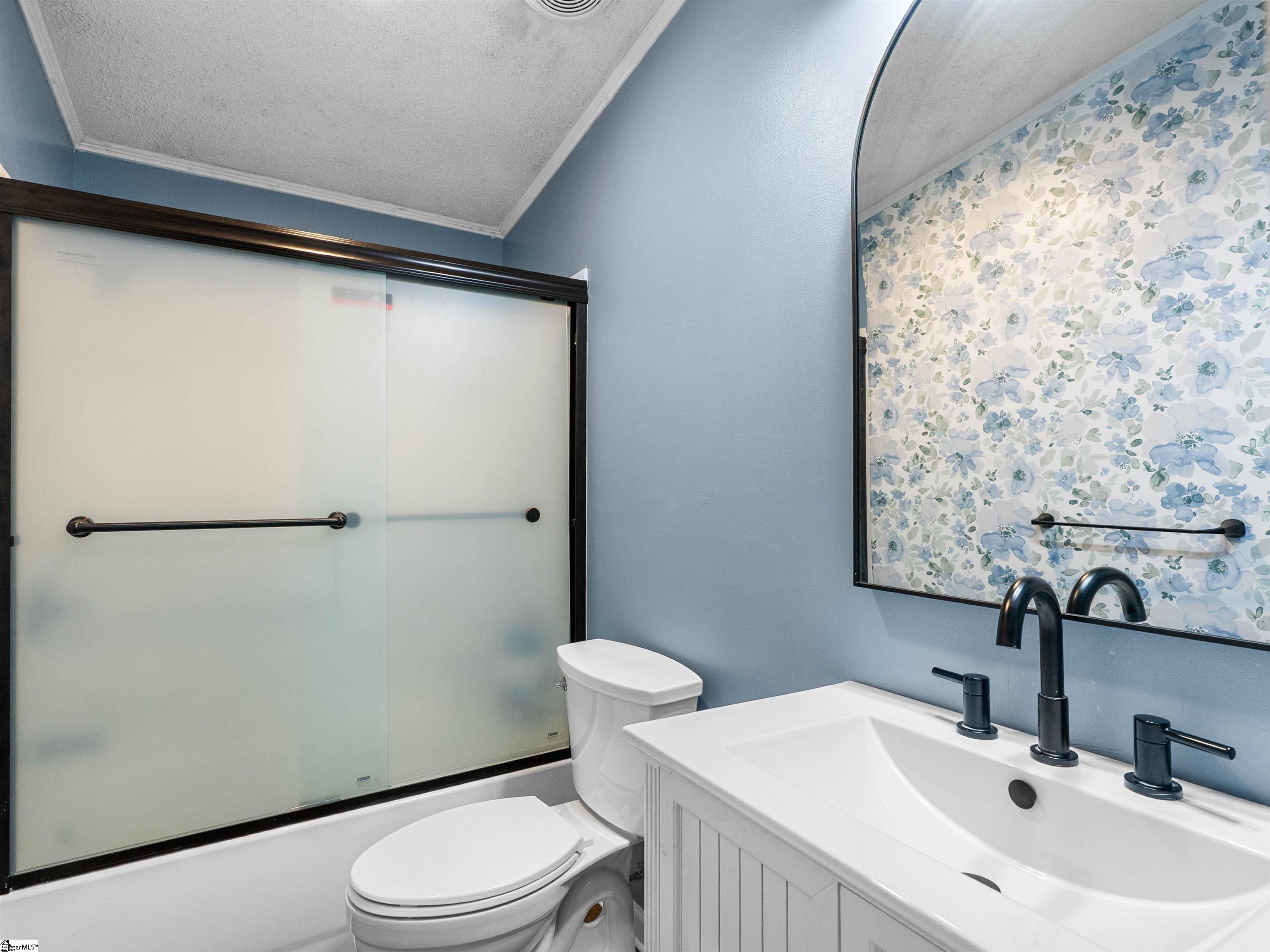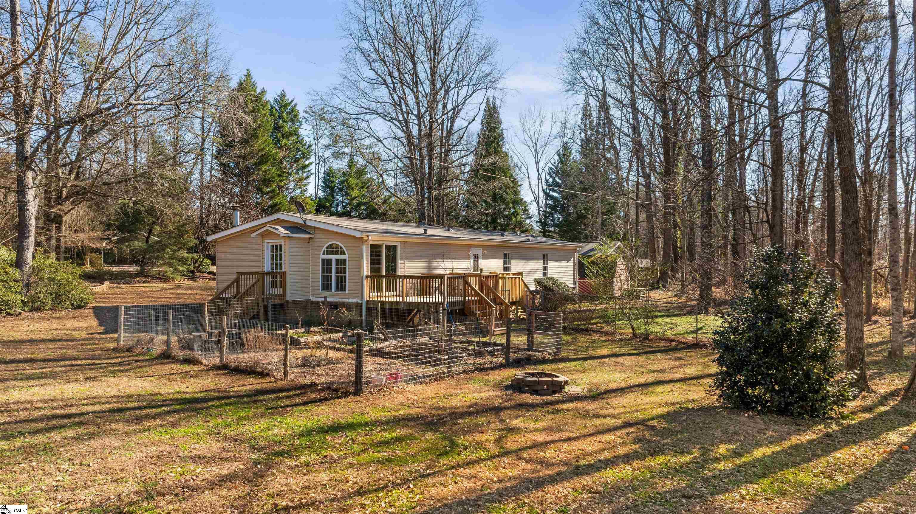 Tucked away on 1.47 private, unrestricted acres in Tigerville, this property offers peaceful country living just minutes from North Greenville University and the charm of downtown Travelers Rest. With three bedrooms, two baths, and a dedicated office space, this manufactured home provides a rare blend of space, storage, seclusion, and everyday convenience. A covered front porch welcomes you home, perfect for enjoying quiet mornings surrounded by nature, complete with double ceiling fans for comfort. Inside, plank flooring throughout means no carpet, and the open floor plan creates an easy, inviting flow. The vaulted living room features chair rail molding, while a cozy den offers a wood-burning fireplace with an electric insert and stone surround. The spacious dining area is accented with beadboard details, adding warmth and character. The kitchen is both functional and inviting, featuring a center island with wood top, tile backsplash, pantry closet, and a side-by-side refrigerator that conveys with the home. The primary suite offers a walk-in closet, dual vanities, a separate shower, and a soaking tub, along with additional cabinetry for extra storage. Outdoor living truly shines here, with two large rear decks ideal for entertaining, a detached two-car garage with man door, a two-car carport, a fenced dog run, a separate fenced garden area, and a storage shed. With no deed restrictions and room to spread out, this property offers flexibility rarely found in this location. Enjoy the best of both worlds with privacy at home and quick access to local favorites like the Swamp Rabbit Trail, downtown Travelers Rest, and the scenic Blue Ridge foothills. If you are looking for privacy, flexibility, and a convenient Upstate location, this home checks all the boxes.