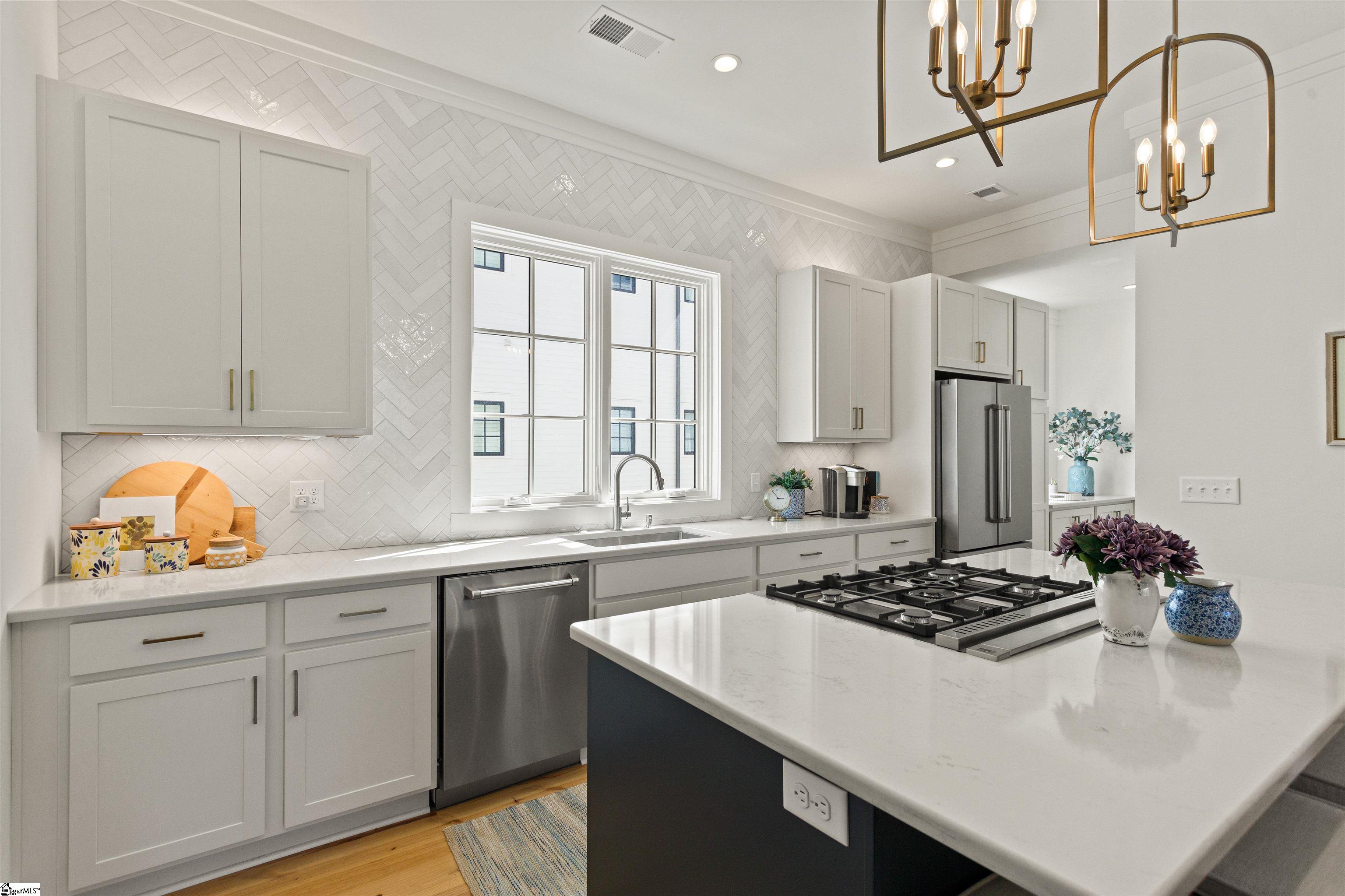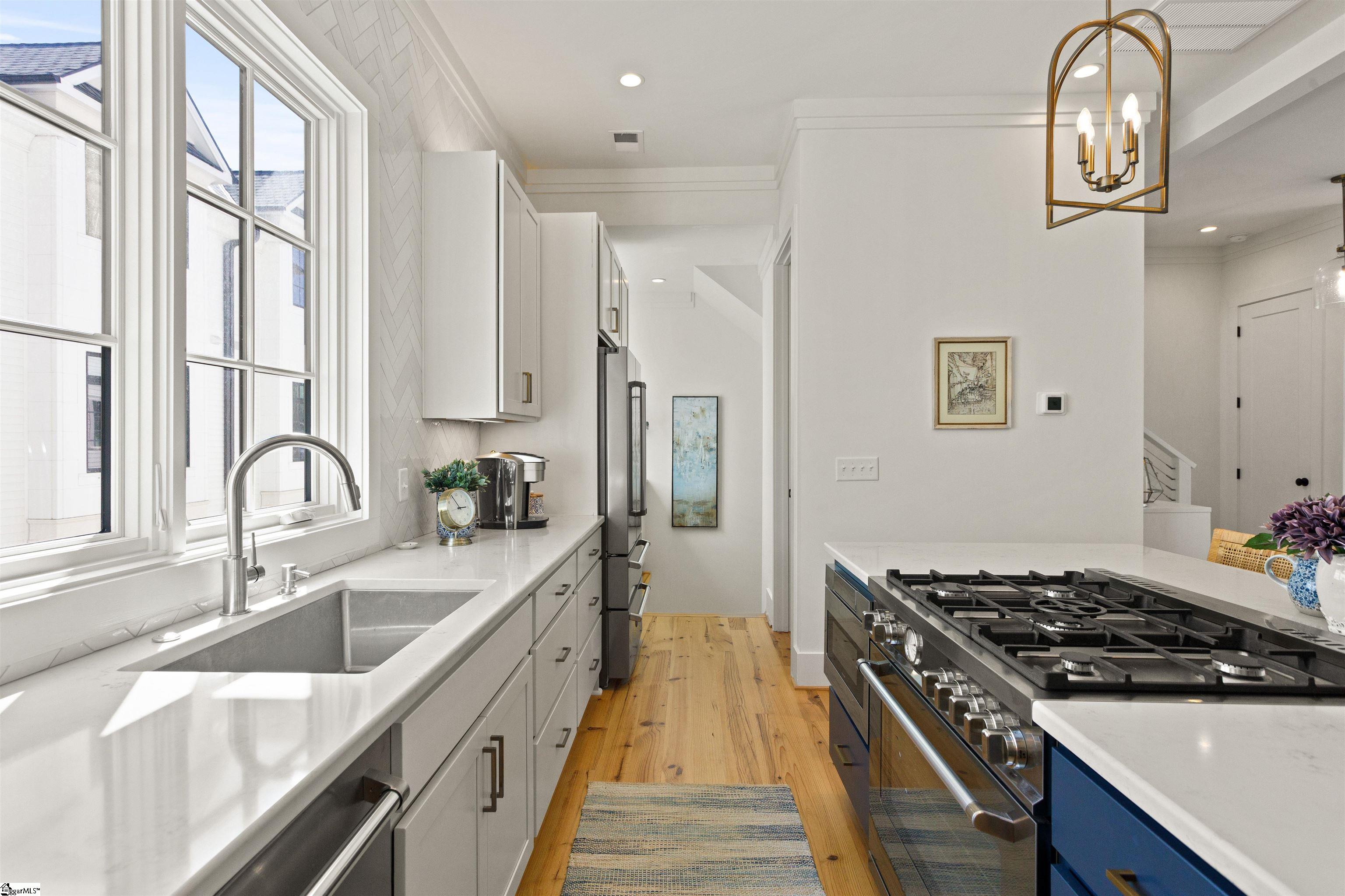 Luxury living just steps from Augusta Road, Fluor Field, the Swamp Rabbit Trail, and County Square which is slated to be the centerpiece of Greenville’s Downtown! This 3-bedroom, 3.5-bath townhome offers roughly 2,000 square feet with a private 2-stall garage, complete with epoxy flooring, extra storage, and pre-run wiring for an EV charger. The main level features open living with 10’ ceilings, site finished heart pine hardwood floors, a charming powder room, and seamless flow from the gourmet kitchen to the living area and covered front porch. The kitchen is equipped with quartz countertops, a large eat-in island, and premium Bertazzoni appliances including a 36” gas range. The heart pine flooring carries through the spacious owner’s suite, also having its own laundry, walk-in closet, a spa-like bath with dual vanities, custom tile shower, and a very cool balcony that is perfect for your morning cup of coffee. The guest level offers two additional ensuite bedrooms, one highlighted by a vaulted ceiling, plus a custom beverage station that adds both convenience and thoughtful design. Luxury, location, and lifestyle—28 Claussen is ready for you!