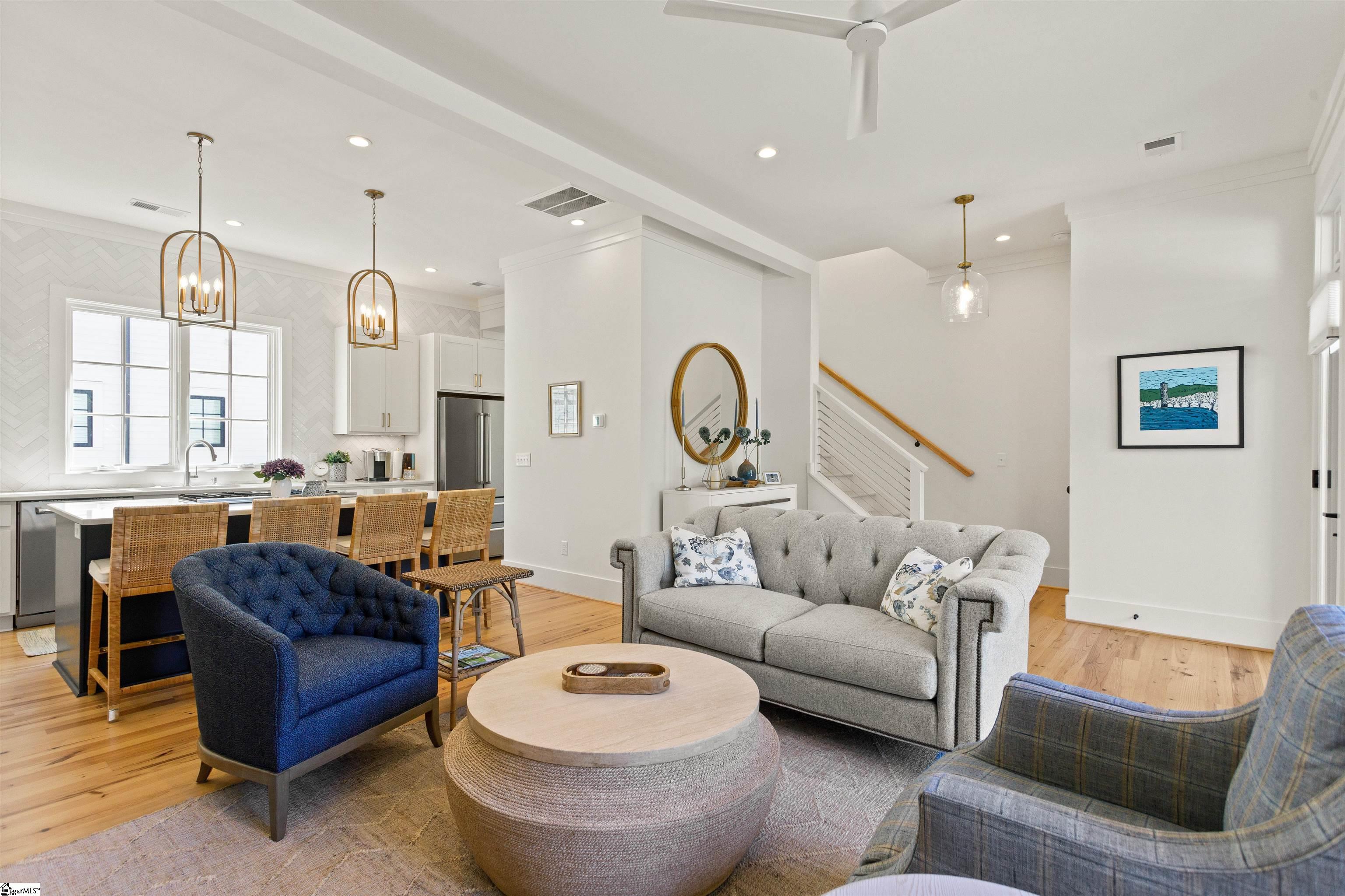 Luxury living just steps from Augusta Road, Fluor Field, the Swamp Rabbit Trail, and County Square which is slated to be the centerpiece of Greenville’s Downtown! This 3-bedroom, 3.5-bath townhome offers roughly 2,000 square feet with a private 2-stall garage, complete with epoxy flooring, extra storage, and pre-run wiring for an EV charger. The main level features open living with 10’ ceilings, site finished heart pine hardwood floors, a charming powder room, and seamless flow from the gourmet kitchen to the living area and covered front porch. The kitchen is equipped with quartz countertops, a large eat-in island, and premium Bertazzoni appliances including a 36” gas range. The heart pine flooring carries through the spacious owner’s suite, also having its own laundry, walk-in closet, a spa-like bath with dual vanities, custom tile shower, and a very cool balcony that is perfect for your morning cup of coffee. The guest level offers two additional ensuite bedrooms, one highlighted by a vaulted ceiling, plus a custom beverage station that adds both convenience and thoughtful design. Luxury, location, and lifestyle—28 Claussen is ready for you!