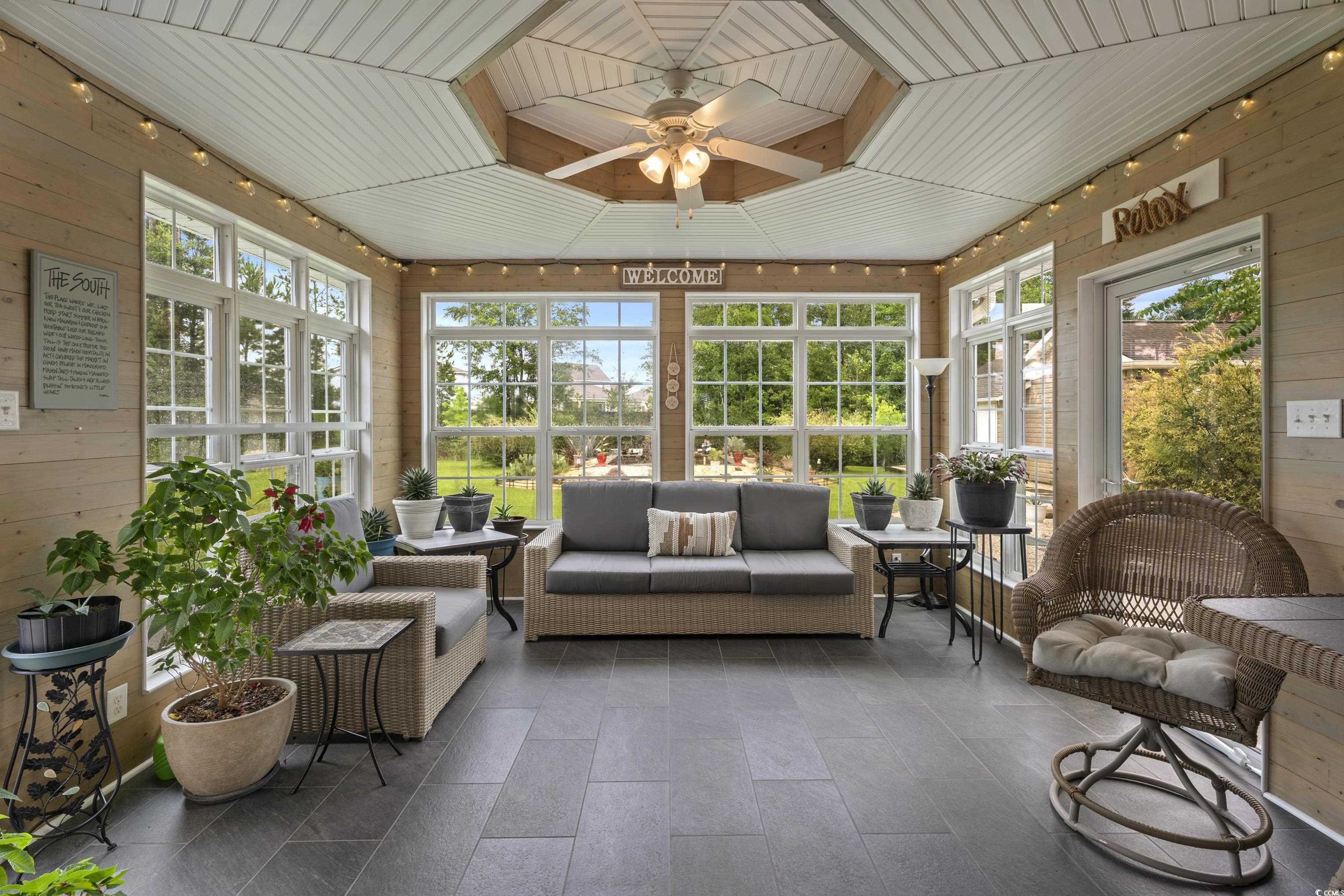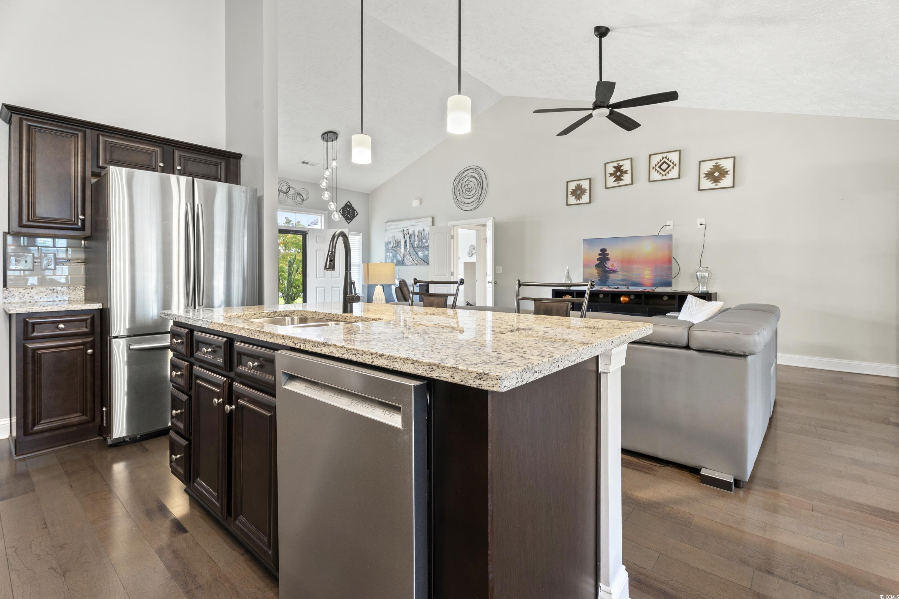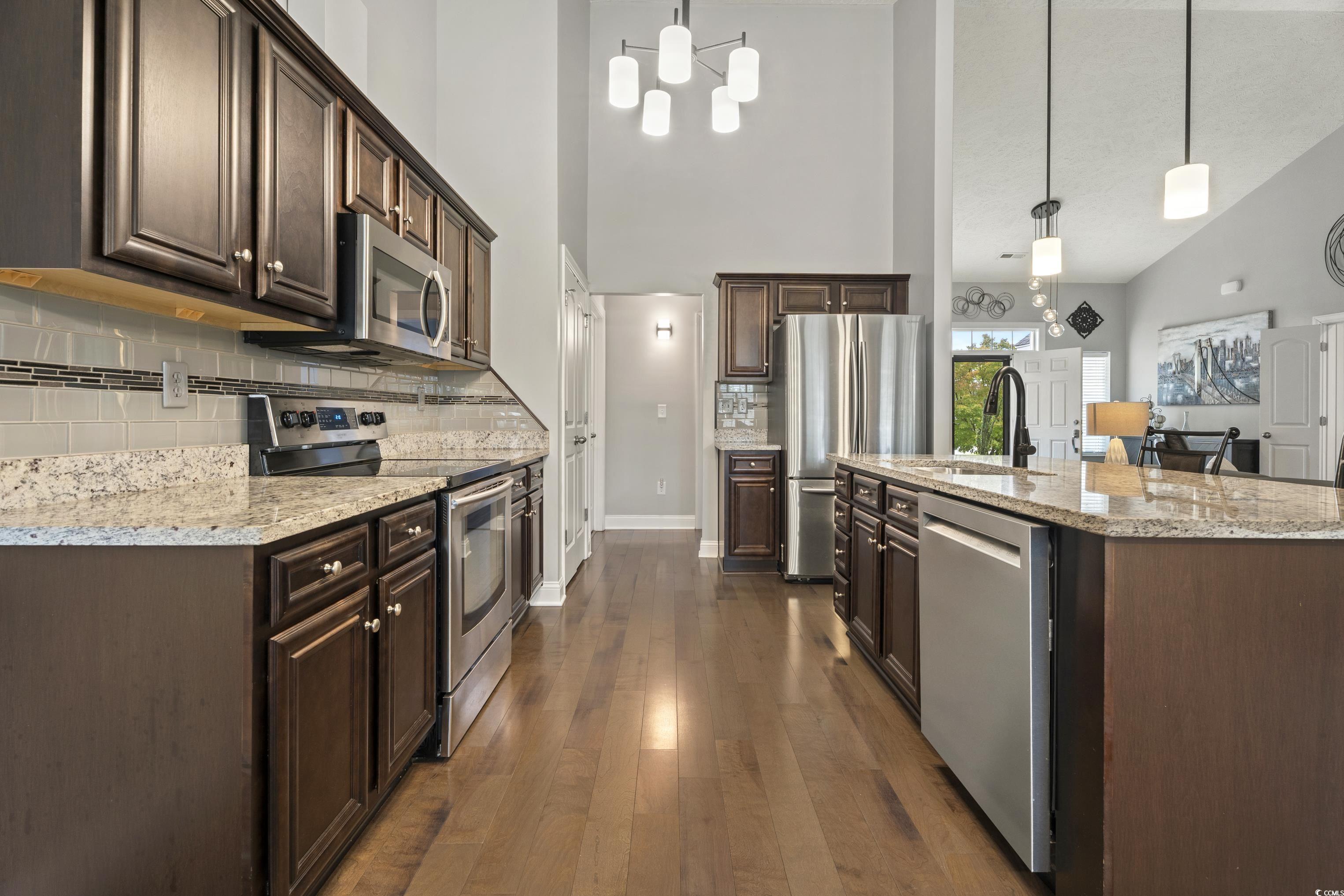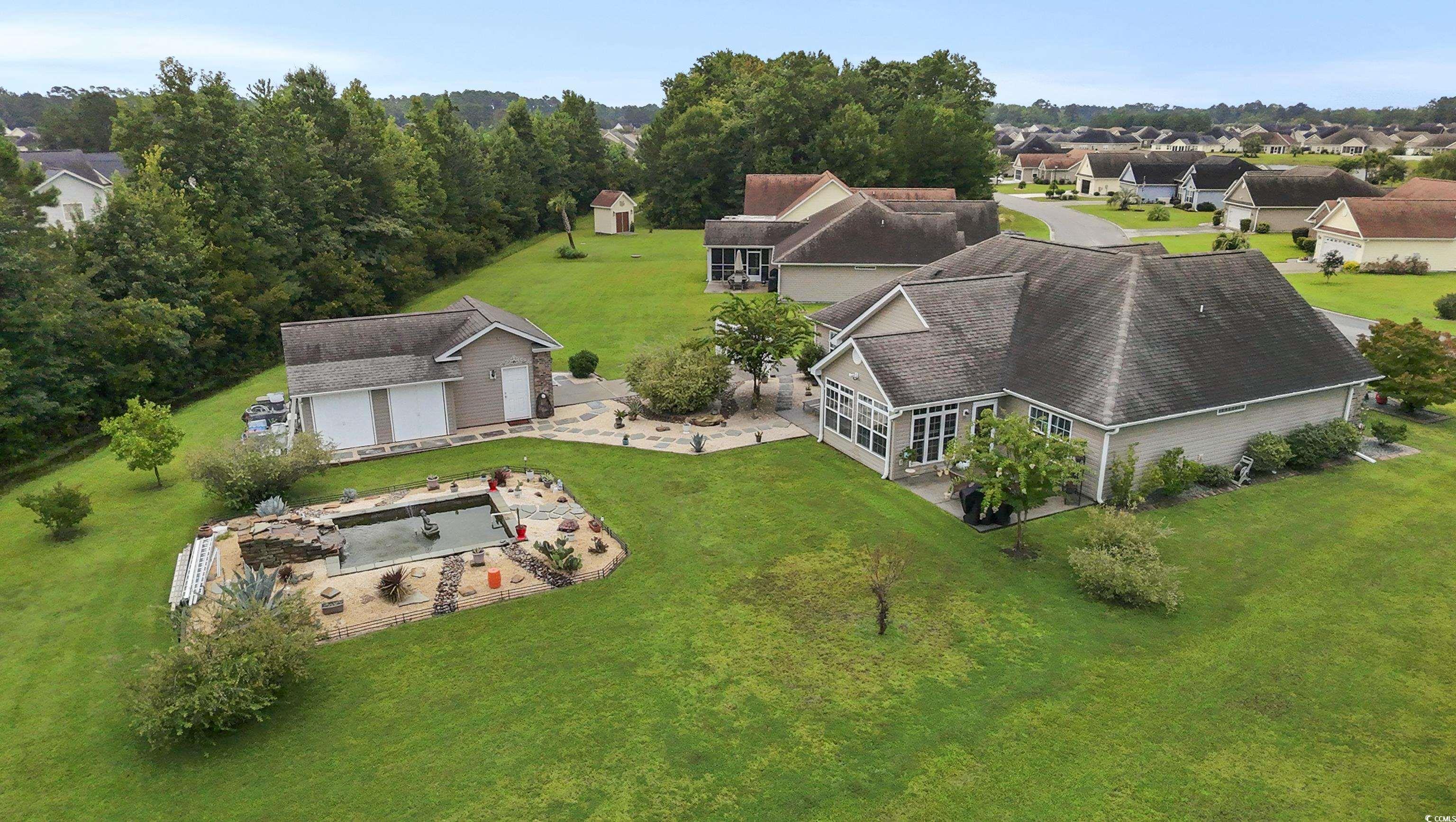 Looking for a single-story home with land, privacy, and lifestyle, but still want to be close to everything Myrtle Beach has to offer? This 3 bed, 2 bath ranch-style home sits on nearly HALF AN ACRE in Forestbrook Preserve and features the space, flexibility, and upgrades you're looking for. Inside enjoy vaulted ceilings, wood flooring throughout (no carpet!), and an open layout that flows seamlessly into a custom-built 3 Seasons Carolina Room. The kitchen features granite countertops, stainless steel appliances, beautiful backsplash, and a center island. Step outside and you'll find what truly sets this home apart: a 520 sq ft heated and cooled detached workshop and a handcrafted waterfall pond, creating your own private oasis. The extended 112' driveway offers plenty of space for parking. Whether you’re dreaming of a home gym, hobby space, she-shed, man cave, or business setup, this property delivers. One of the largest lots in Forestbrook Preserve, you’ll enjoy room to garden, play, or simply breathe. Low HOA fees, neighborhood pool, and a community feel, all just 15 minutes to the beach, airport, Market Commons, Coastal Grand Mall, and more.